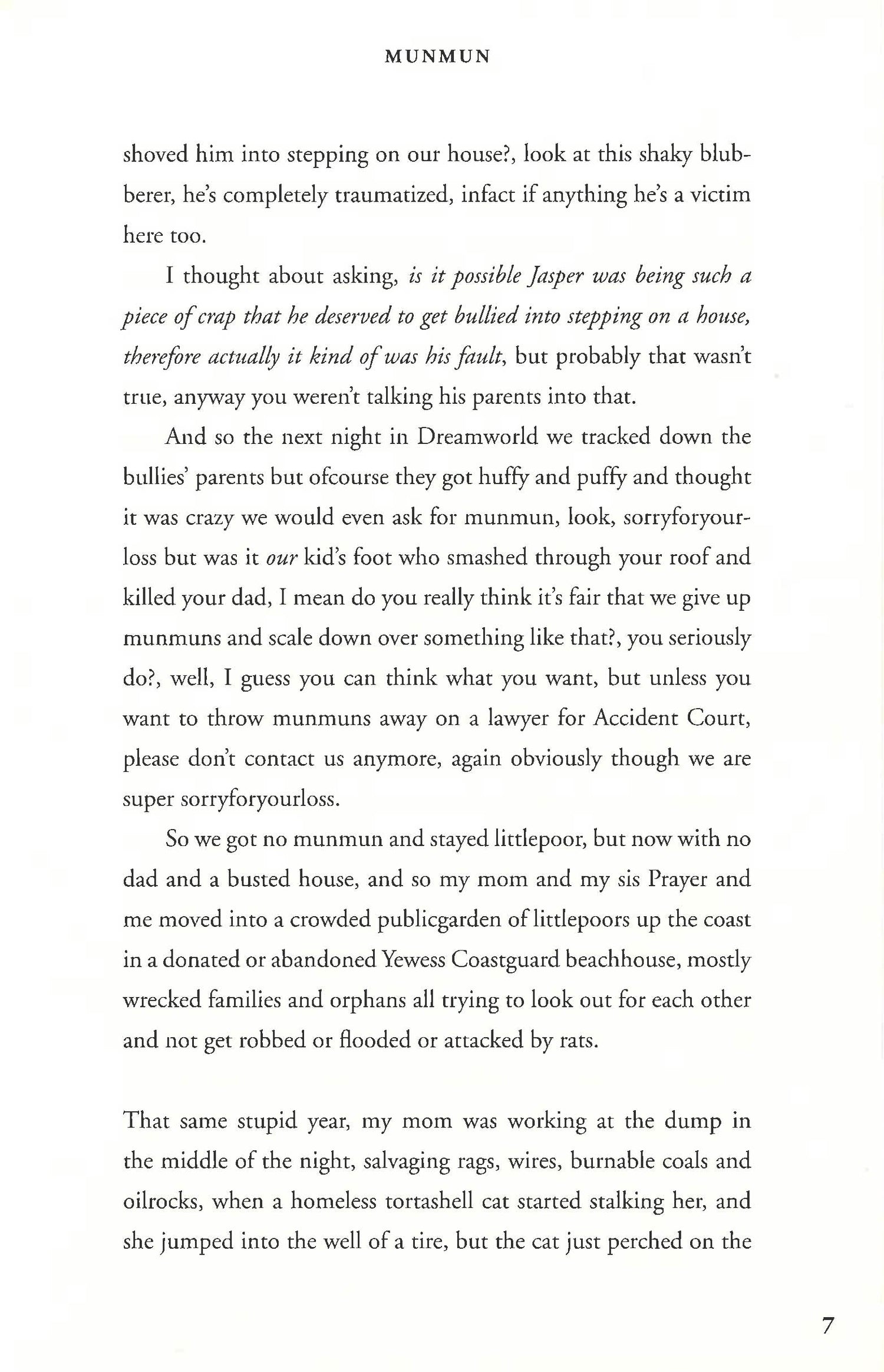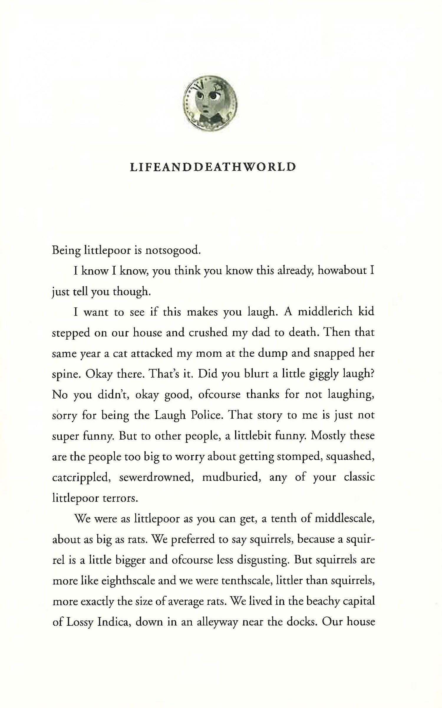In an alternate reality a lot like our world, every person's physical size is directly proportional to their wealth. The poorest of the poor are the size of rats, and billionaires are the size of skyscrapers.Warner and his sister Prayer are destitute-and tiny. Their size is not just demeaning, but dangerous: day and night they face mortal dangers that bigger richer people don't ever have to think about, from being mauled by cats to their house getting stepped on. There are no cars or phones built small enough for them, or schools or hospitals, for that matter-there's no point, when no one that little has any purchasing power, and when salaried doctors and teachers would never fit in buildings so small. Warner and Prayer know their only hope is to scale up, but how can two littlepoors survive in a world built against them? A brilliant, warm, funny trip, unlike anything else out there, and a social novel for our time in the tradition of 1984 or Invisible Man. Inequality is made intensely visceral by an adventure and tragedy both hilarious and heartbreaking.