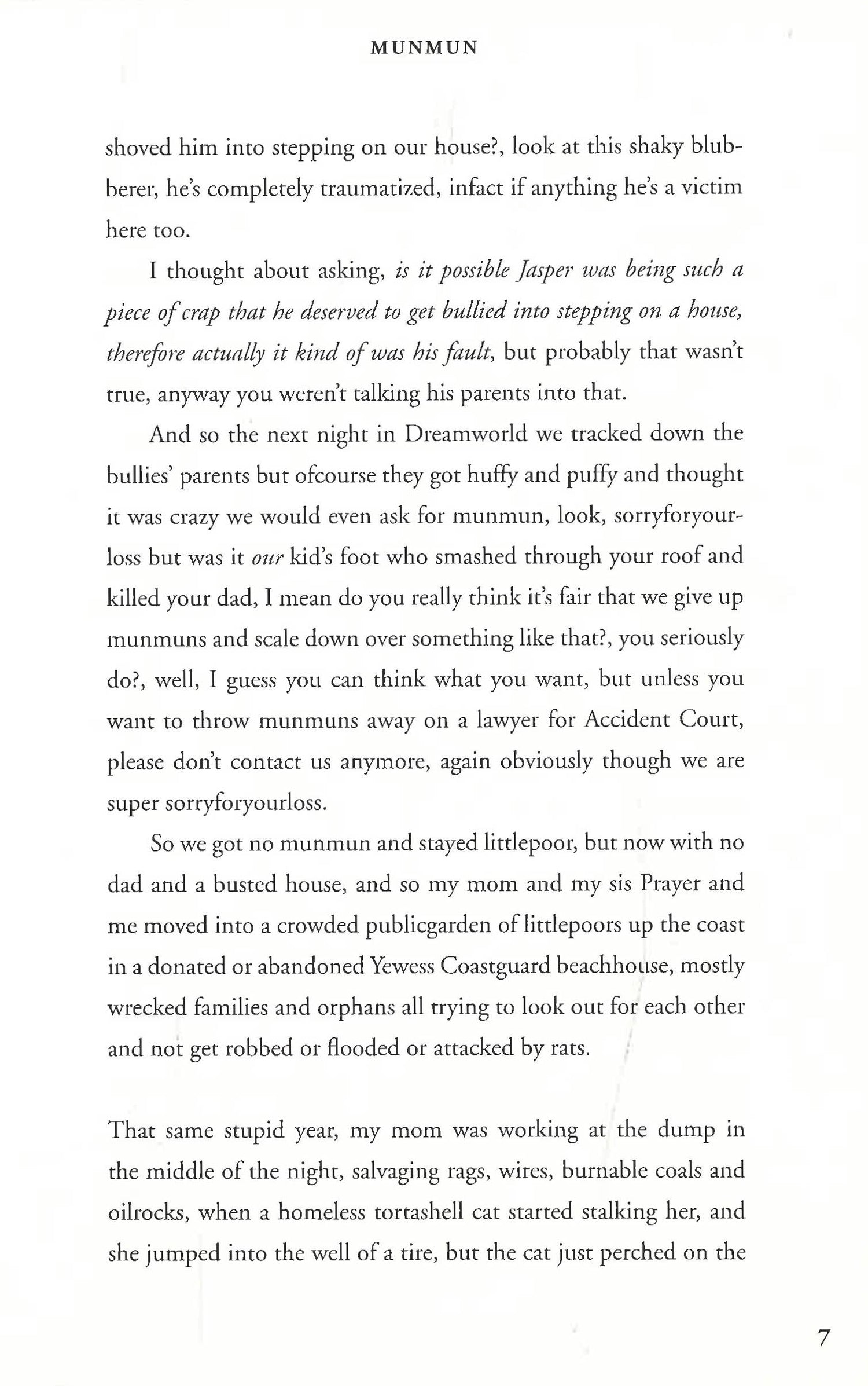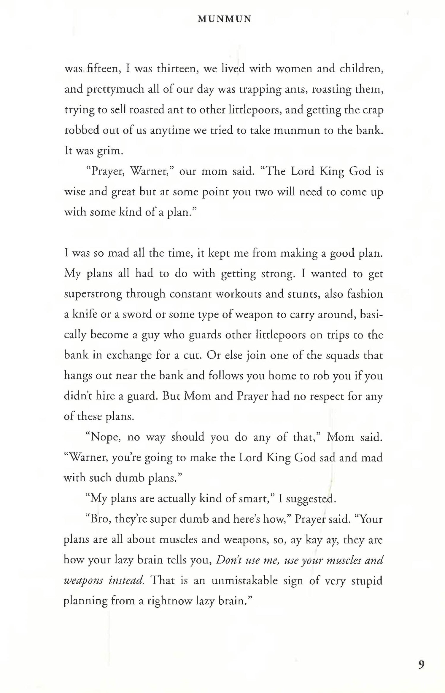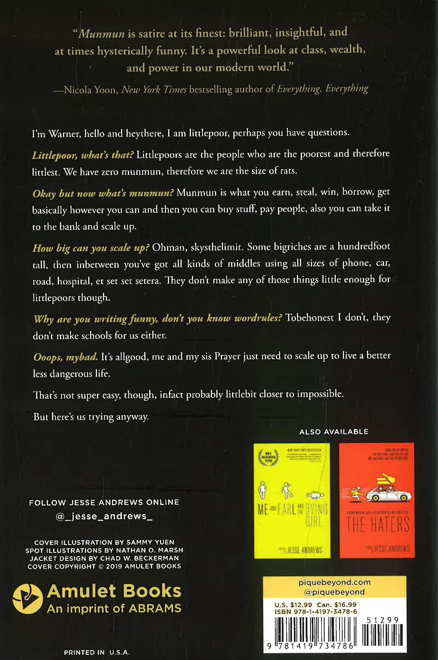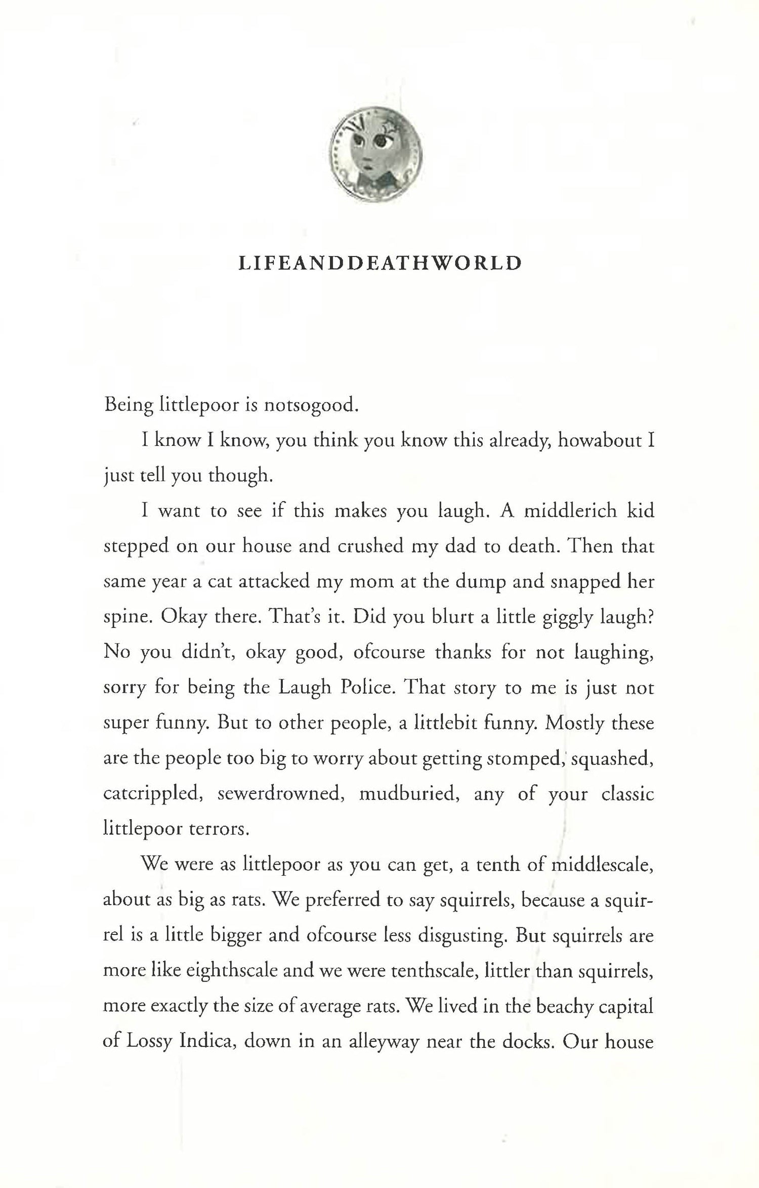 In an alternate reality a lot like our world, every person's physical size is directly proportional to their wealth. The poorest of the poor are the size of rats, and billionaires are the size of skyscrapers. Warner and his sister Prayer are destitute-and tiny. Their size is not just demeaning, but dangerous: day and night they face mortal dangers that bigger richer people don't ever have to think about, from being mauled by cats to their house getting stepped on. There are no cars or phones built small enough for them, or schools or hospitals, for that matter-there's no point, when no one that little has any purchasing power, and when salaried doctors and teachers would never fi t in buildings so small. Warner and Prayer know their only hope is to scale up, but how can two littlepoors survive in a world built against them? A brilliant, warm, funny trip, unlike anything else out there, and a social novel for our time in the tradition of 1984 or Invisible Man. Inequality is made intensely visceral by an adventure and tragedy both hilarious and heartbreaking.