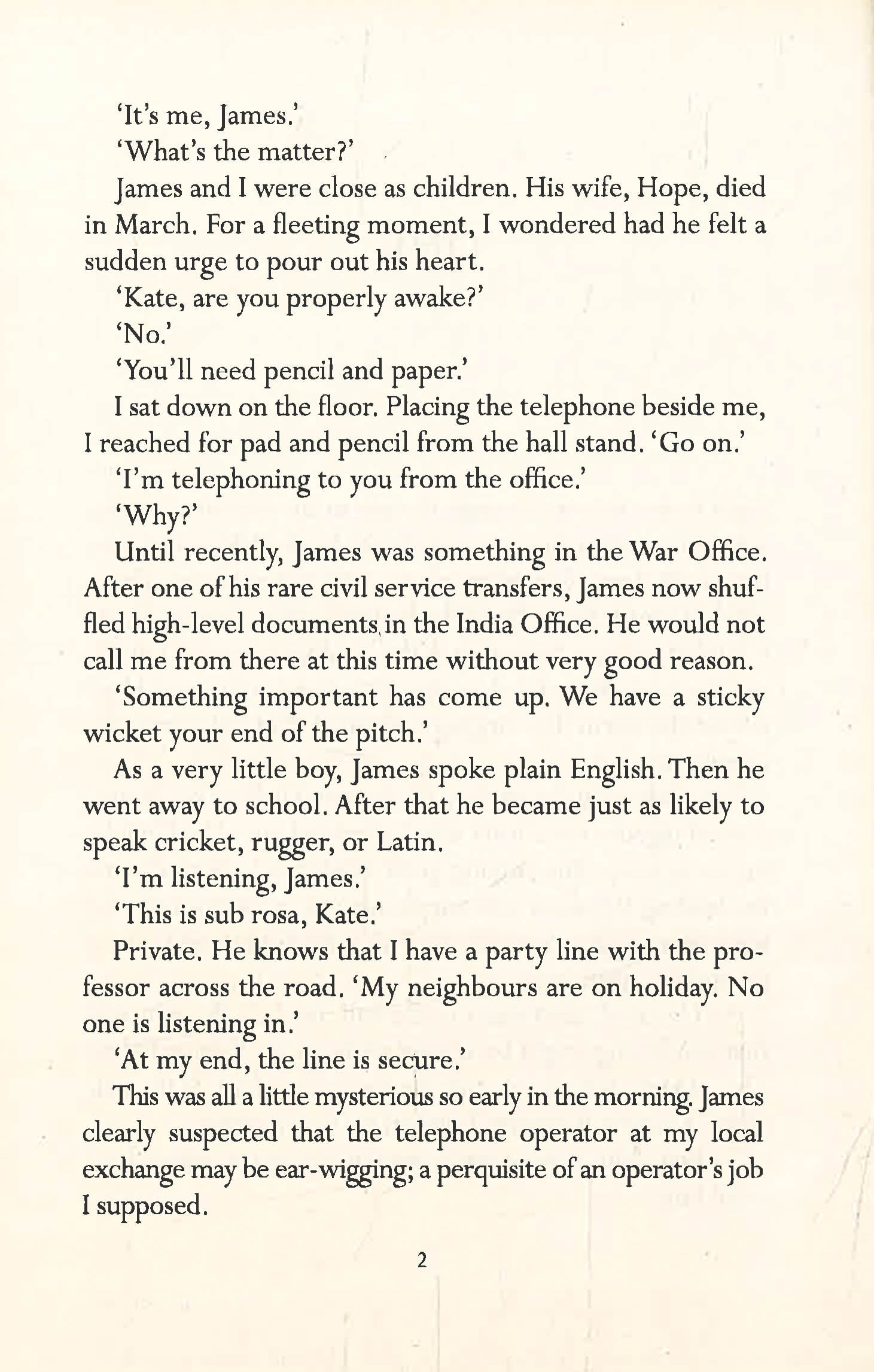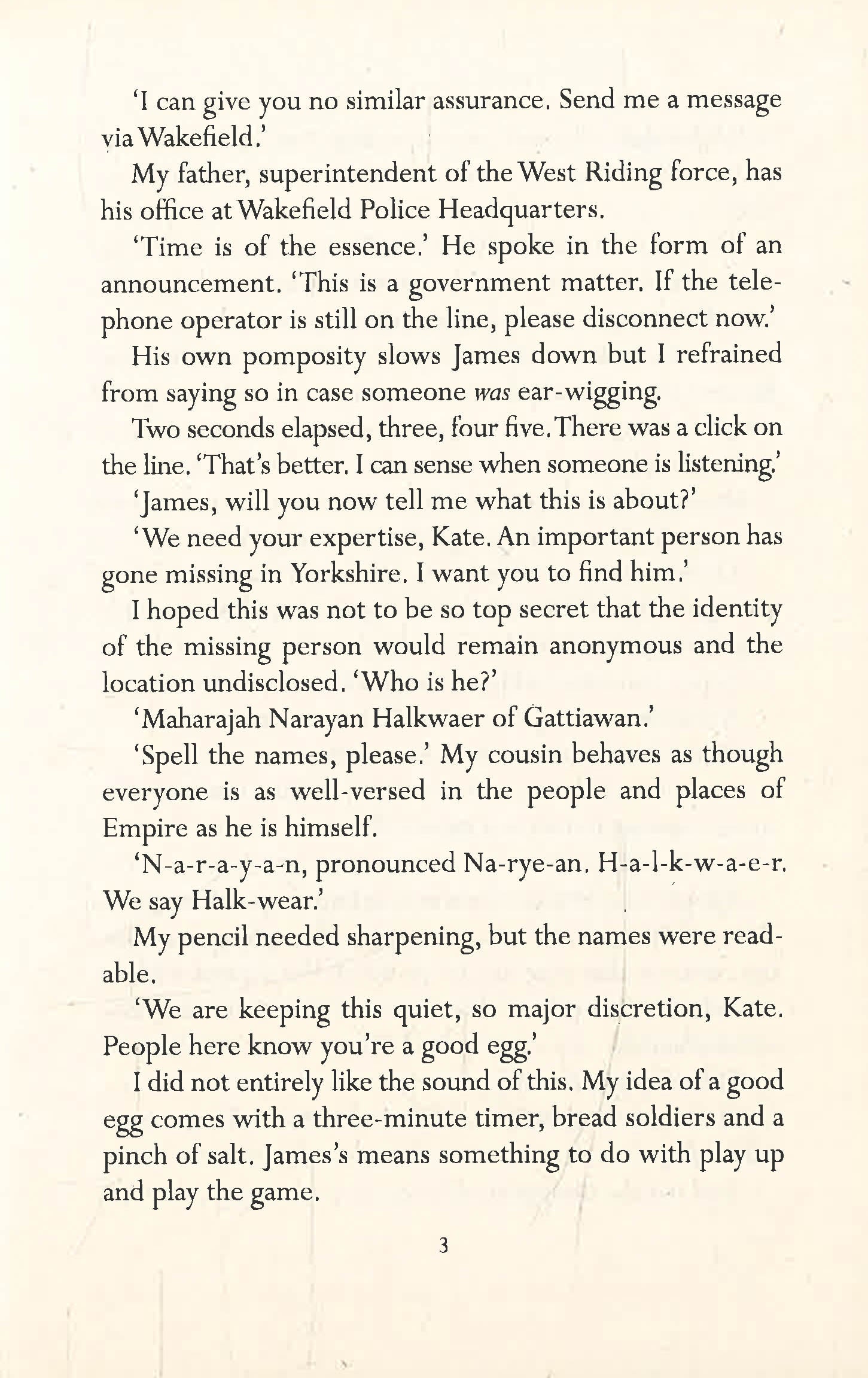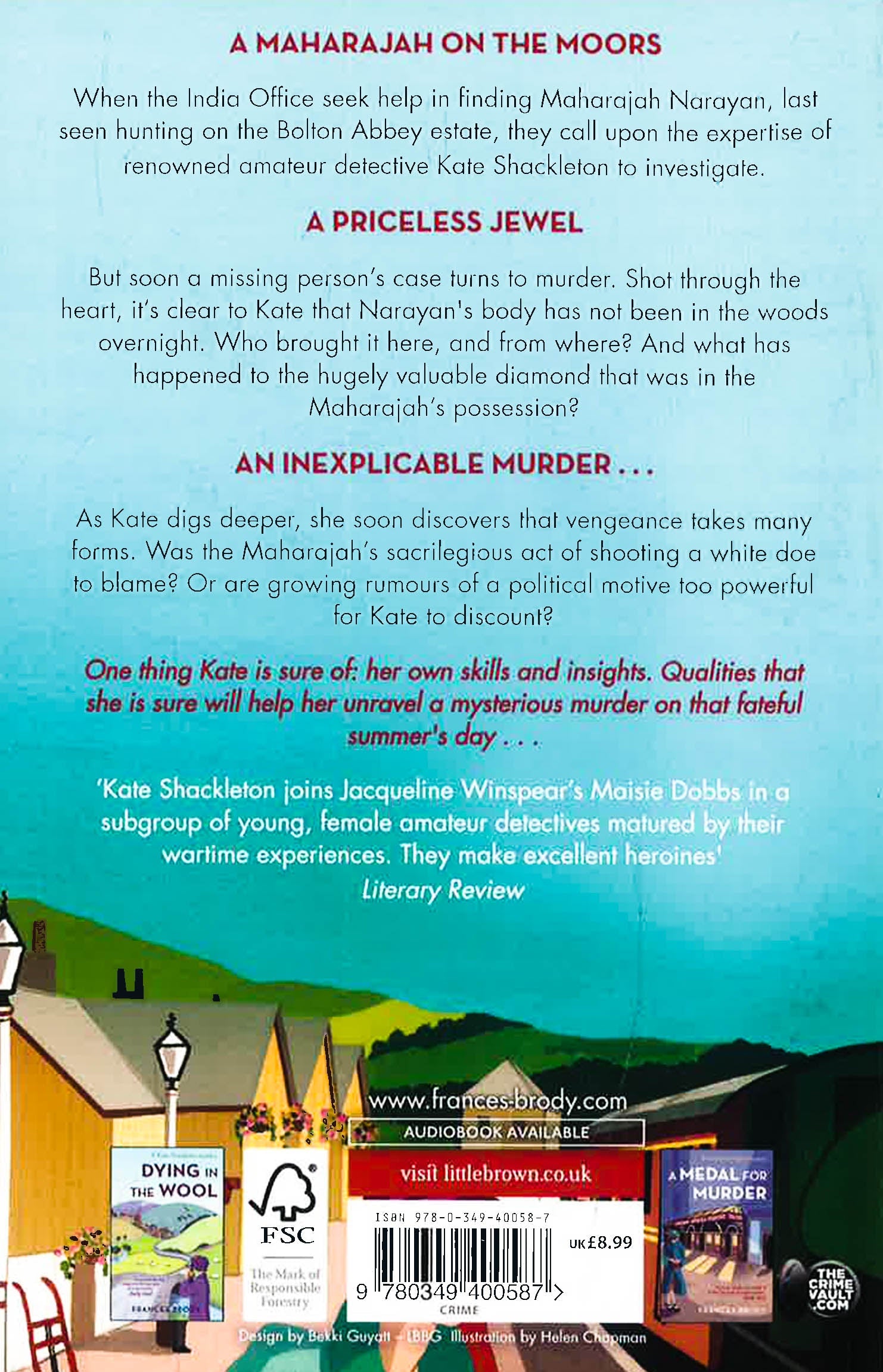 When amateur sleuth detective Kate Shackleton receives a dawn telephone call from her cousin James, his news soon snaps Kate into wakefulness. The India Office seek her on-the-spot help in finding a Maharajah, last seen on the Bolton Abbey estate. He has with him a hugely valuable diamond.Investigative successes and good family connections put Kate in the highly trusted category.