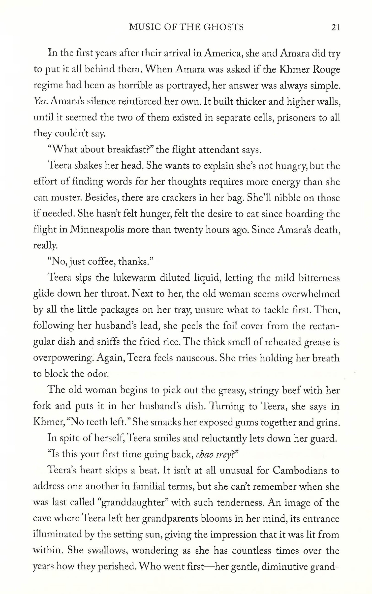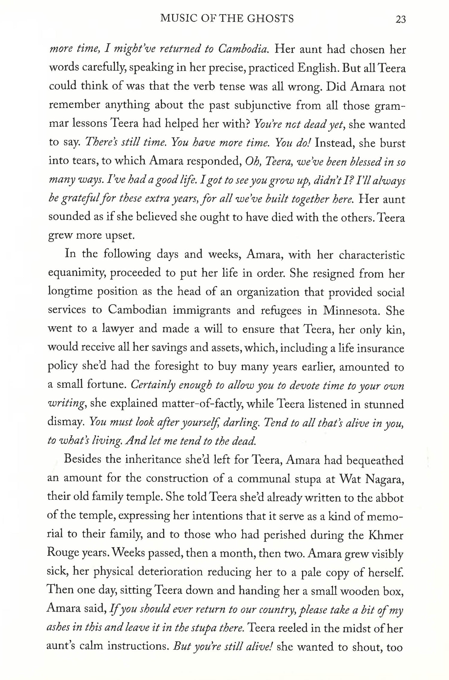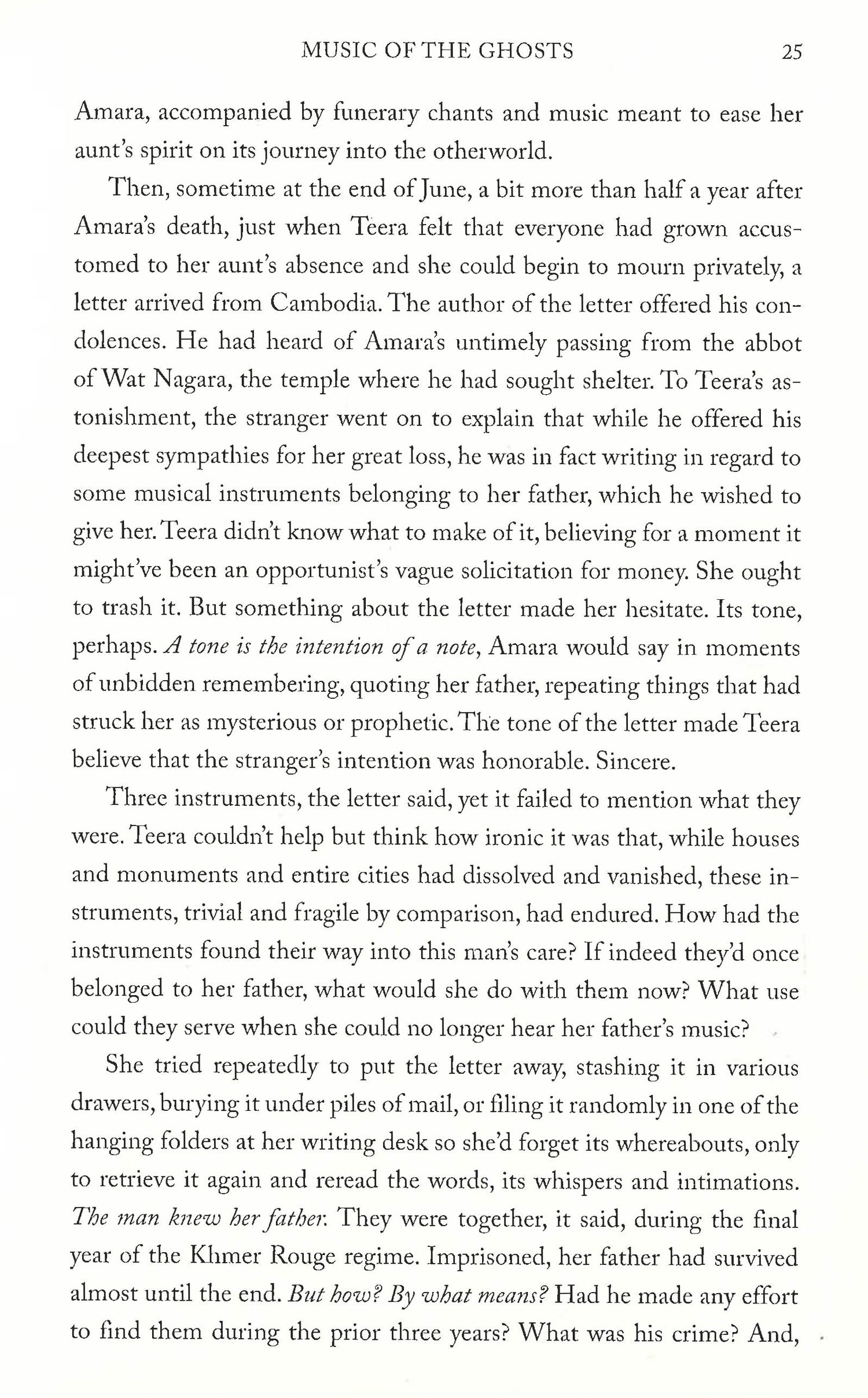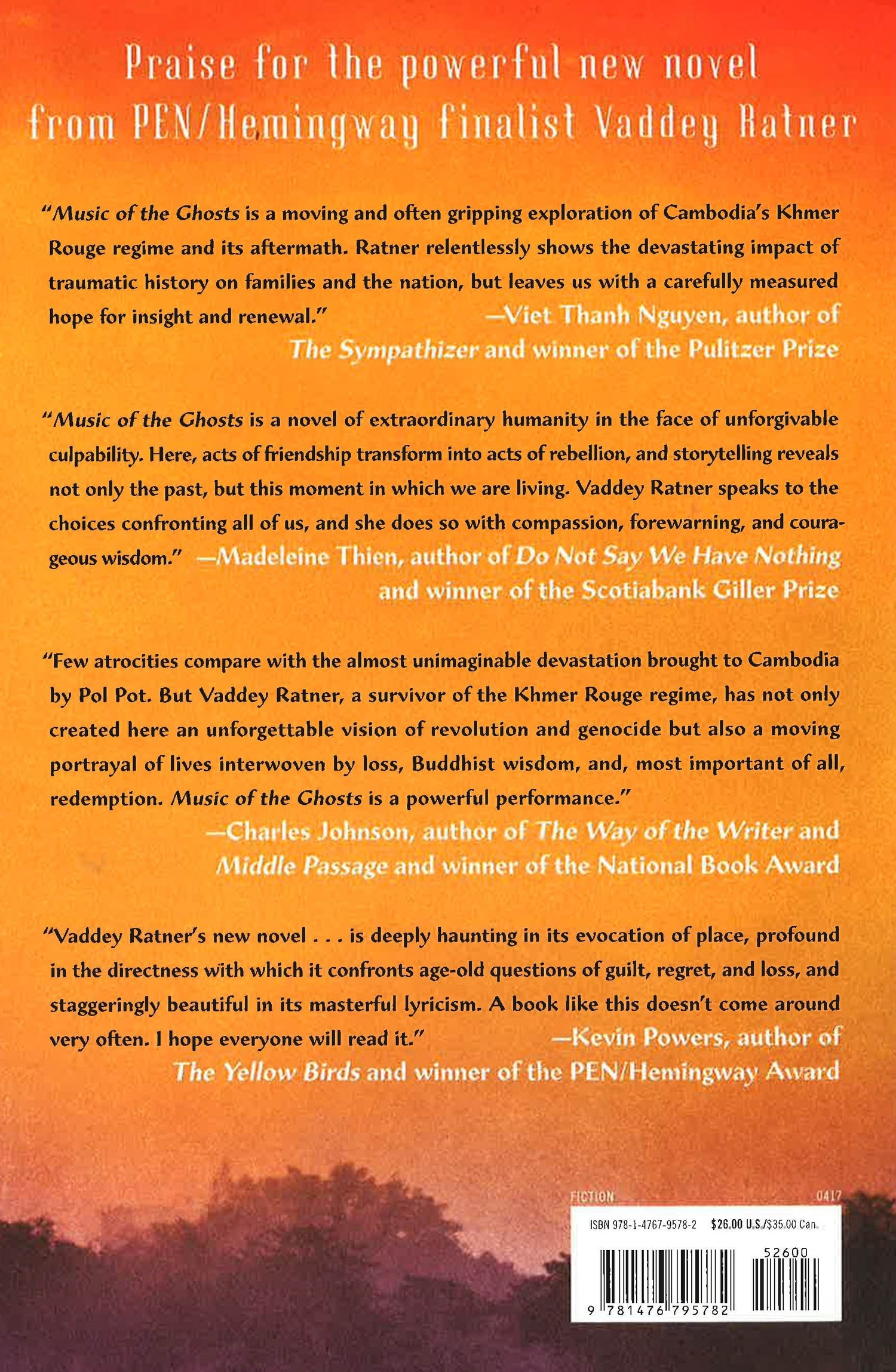 Leaving the safety of America, Teera returns to Cambodia for the first time since her harrowing escape as a child refugee. She carries a letter from a man who mysteriously signs himself as "the Old Musician" and claims to have known her father in the Khmer Rouge prison where he disappeared twenty-five years ago.In Phnom Penh, Teera finds a society still in turmoil, where perpetrators and survivors of unfathomable violence live side by side, striving to mend their still beloved country. She meets a young doctor who begins to open her heart, immerses herself in long-buried memories and prepares to learn her father’s fate.Meanwhile, the Old Musician, who earns his modest keep playing ceremonial music at a temple, awaits Teera’s visit with great trepidation. He will have to confess the bonds he shared with her parents, the passion with which they all embraced the Khmer Rouge’s illusory promise of a democratic society, and the truth about her father’s end. A love story for things lost and things restored, a lyrical hymn to the power of forgiveness, Music of the Ghosts is an unforgettable journey through the embattled geography of the heart and its hidden chambers where love can be reborn.