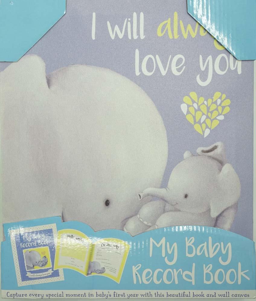 Featuring a lovely Caroline Pedler design of mother and baby elephant with the line "I will always love you" on the cover and comes with a wall canvas with the same image. The record book stores in the rear of the canvas!