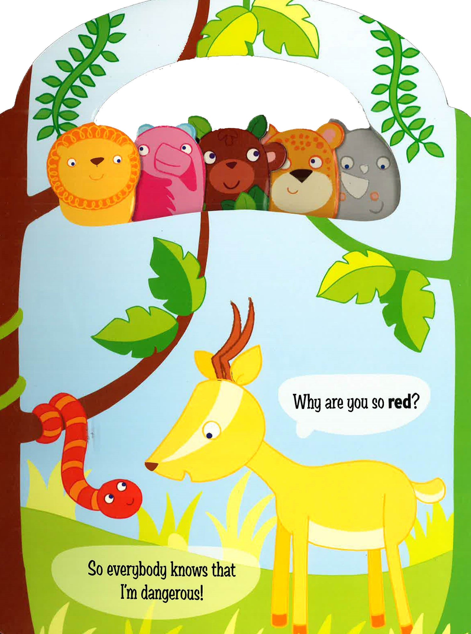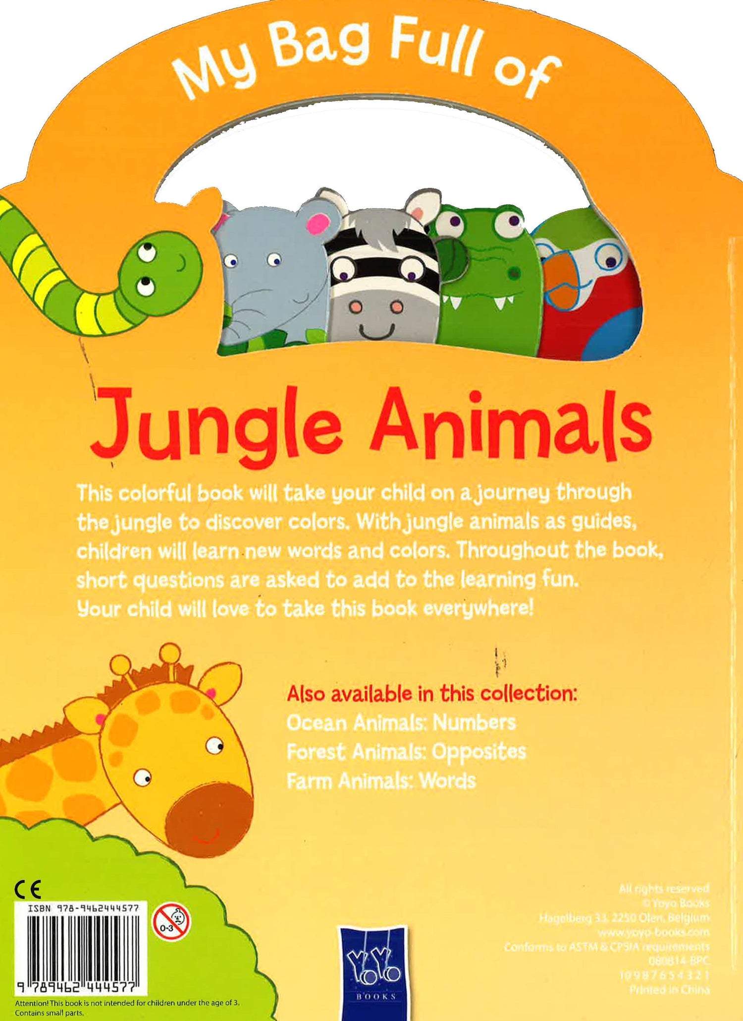MY BAG FULL OF JUNGLE ANIMALS - COLORS These colorful books will take toddlers on a journey through the jungle, ocean, the forest or the farm. With animals as guides, children will learn about numbers, opposites, words and colors. Throughout these books, short questions are asked to add to the learning fun. Little ones will love to take these books everywhere.