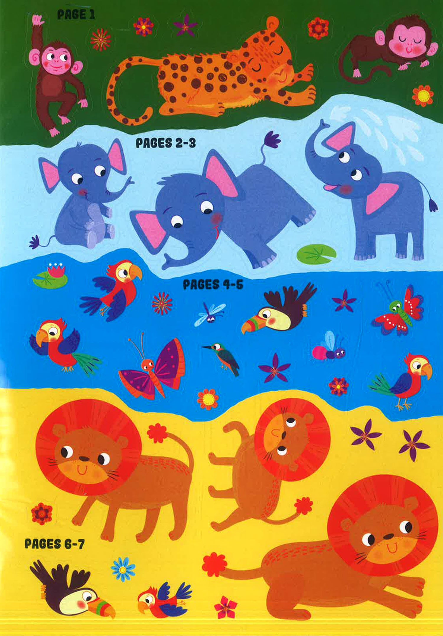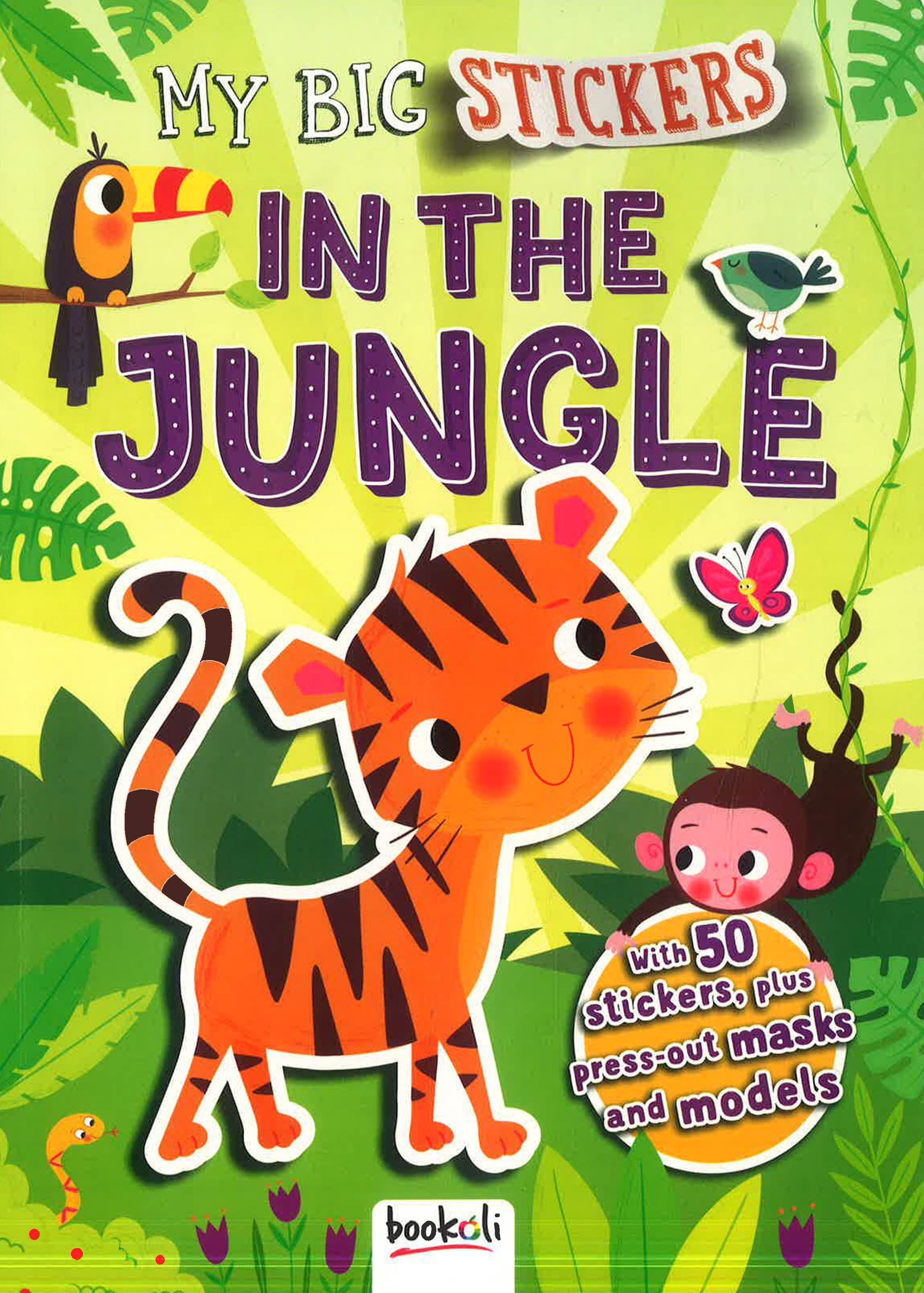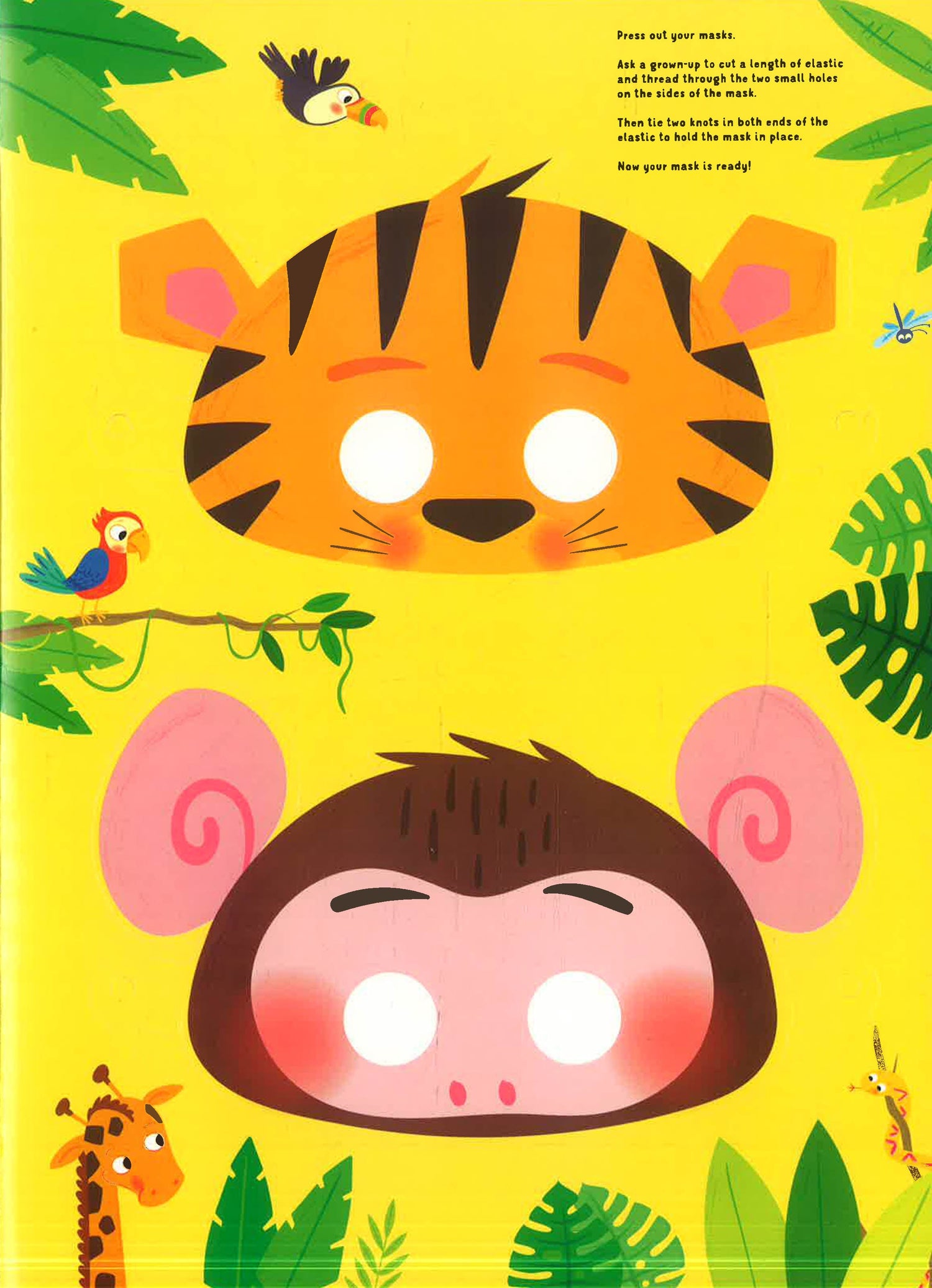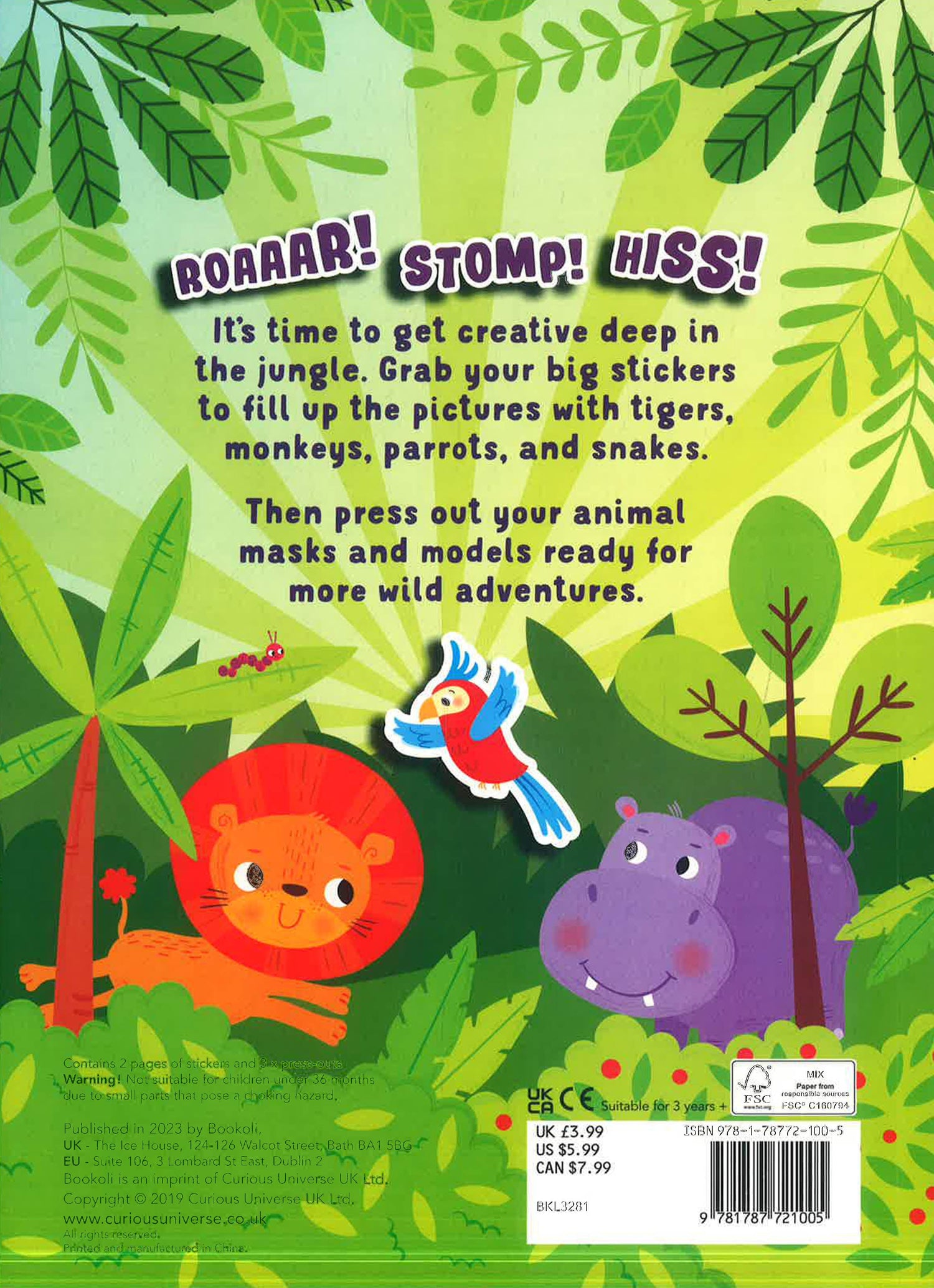 Roaaar! Stomp! Hiss! It's time to get creative deep on the jungle. Grab your big stickers to fill up the pictures with tigers, monkeys, parrots, and snakes. Then press out your animal masks and models ready for more wild adventures.