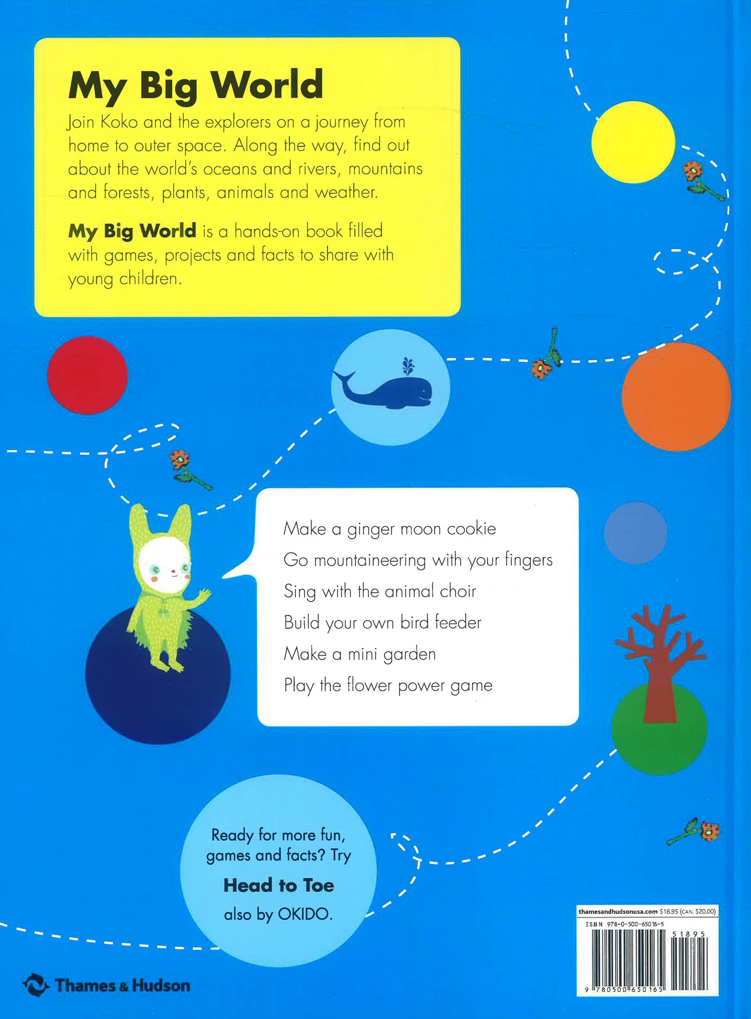 My Big World is a first look at geography and science for children aged 4+ to enjoy with their parents. Throughout the book a little girl called Koko and a little boy called Alex ask questions about the world while intrepid explorers go on adventures to find out how and where we live. Starting from inside the home, Koko and Alex move on to explore the wider world. Step by step the reader encounters different plants and animals, exploring various locations around the world and even visiting outer space! Children explore each topic by playing and learning. Activities, which include things to do on and off the page such as games, recipes and craft activities, are announced by a graphic symbol of a pair of hands. Adults will probably help children with all the activities, but more complicated procedures, involving cutting and baking, are flagged as requiring adult supervision.