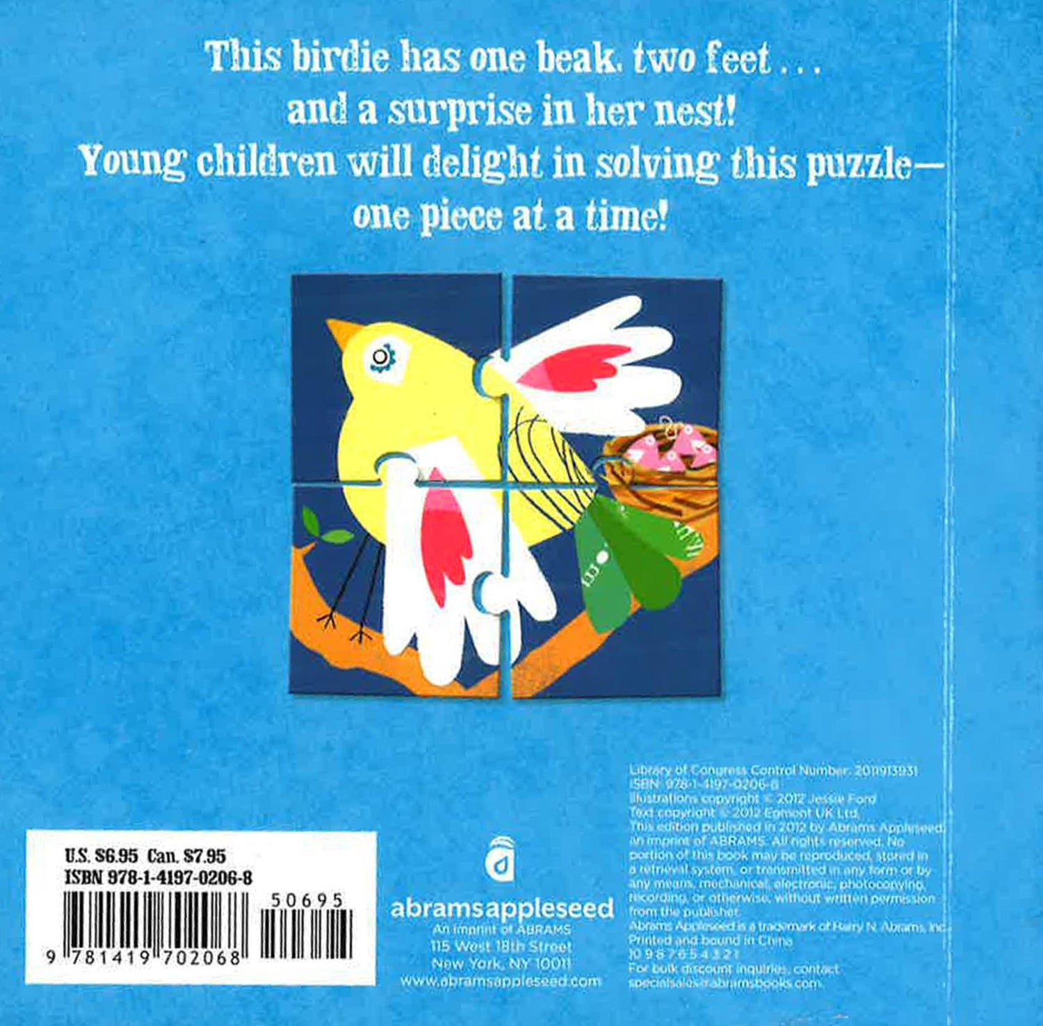 This springtime board book features animal themes, early-learning concepts, and interactive pop-out puzzle pieces to create an altogether appealing package. Young children will methodically remove one puzzle piece from each spread as parts of the bird are introduced. By the end, children have pieced together the whole picture! With decorative, textured art and a seasonally tonal palette, this book is both sophisticated and developmental.