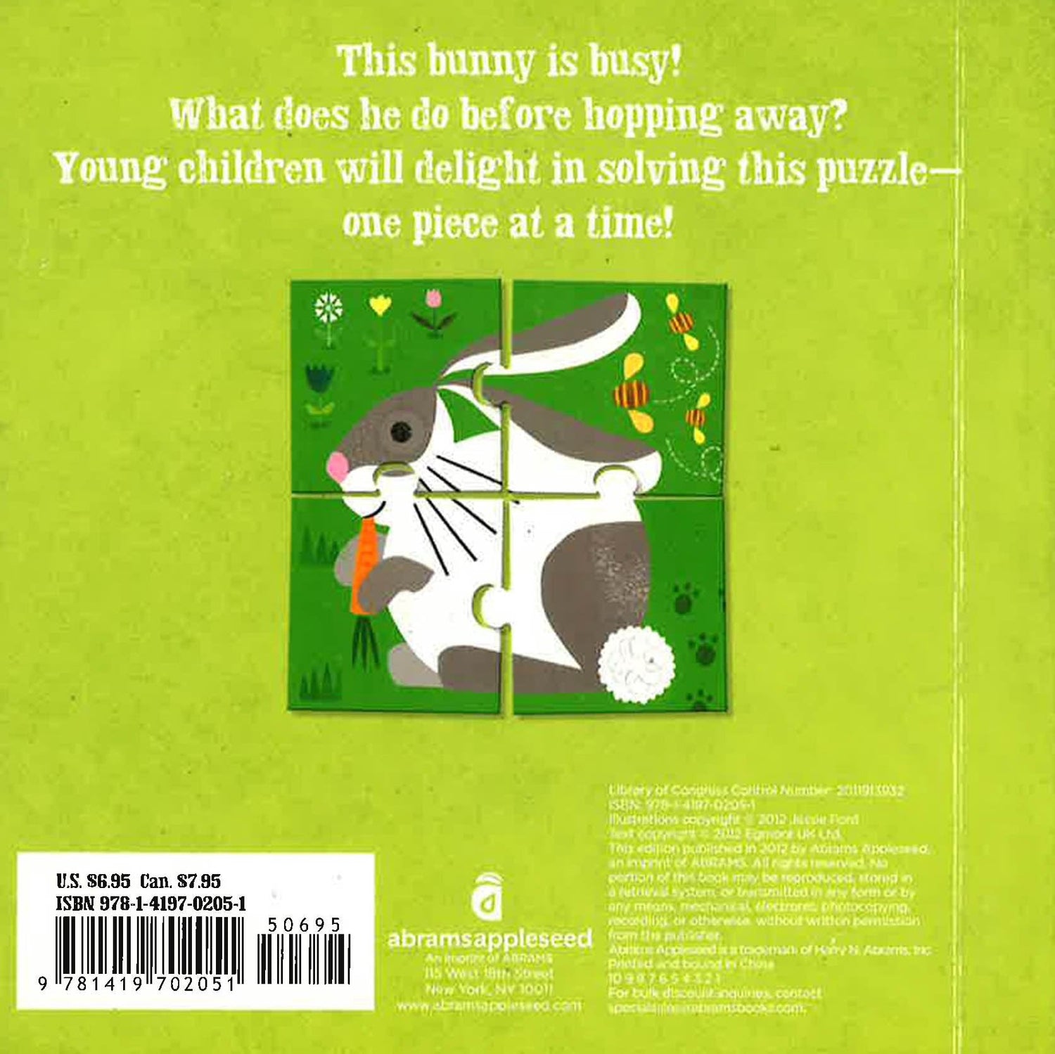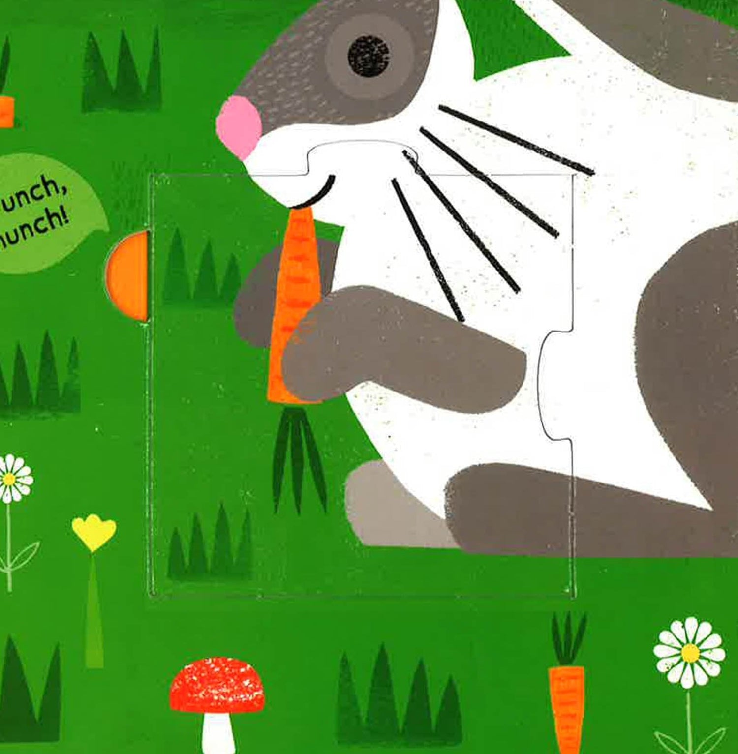 This springtime board book features animal themes, early-learning concepts, and interactive pop-out puzzle pieces to create an altogether appealing package. Young children will methodically remove one puzzle piece from each spread as parts of the bunny are introduced. By the end, children have pieced together the whole picture! With decorative, textured art and a seasonally tonal palette, this book is both sophisticated and developmental.