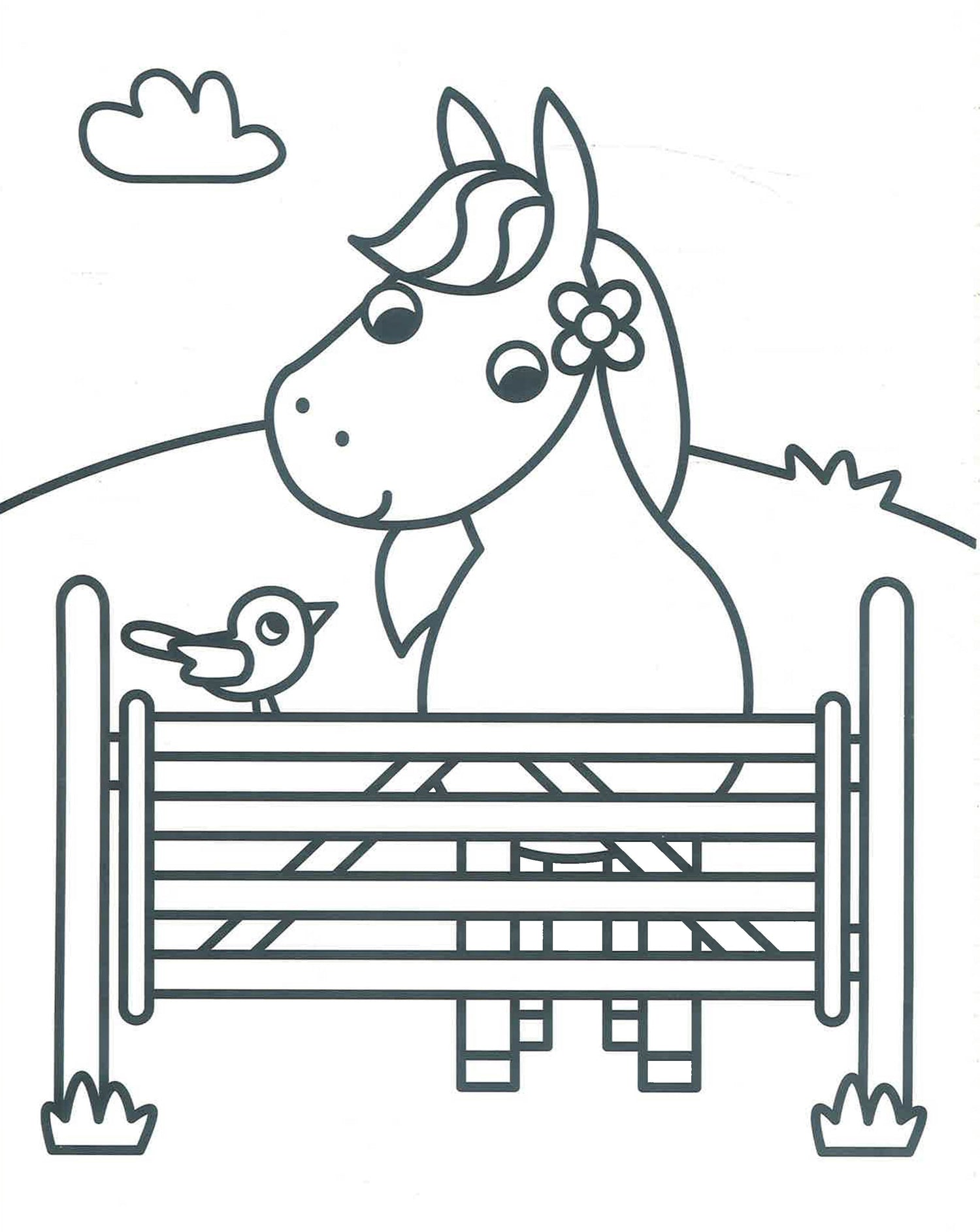 With bold outlines to help children practice their coloring skills, this busy coloring book is filled with a collection of farm scenes from galloping horses and grazing cows to tractors and barns.