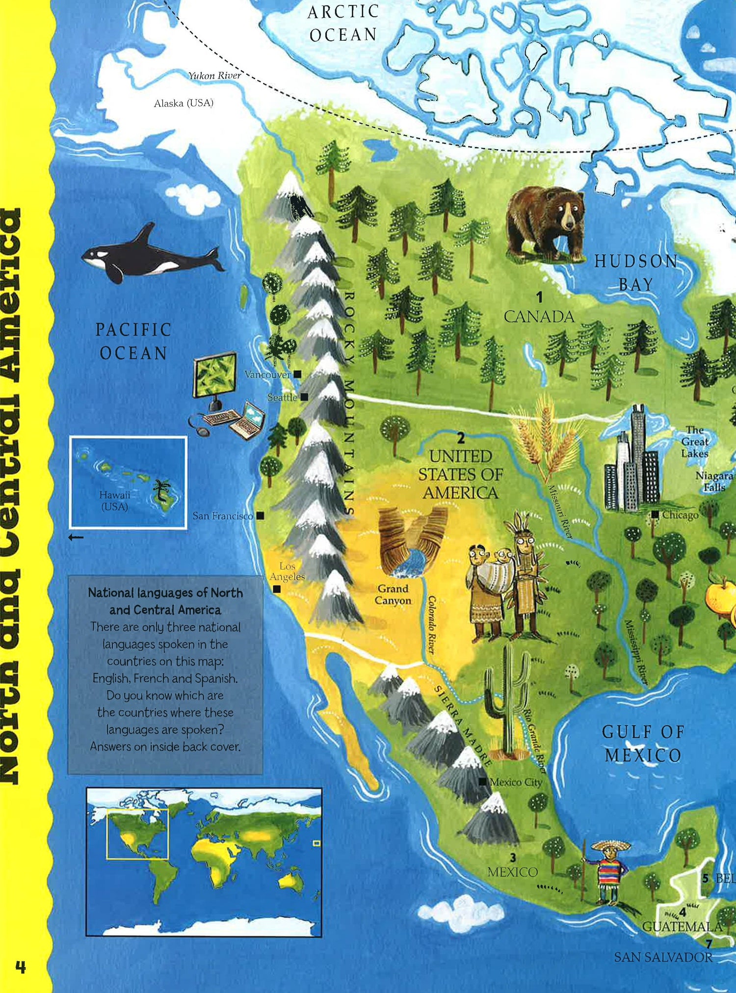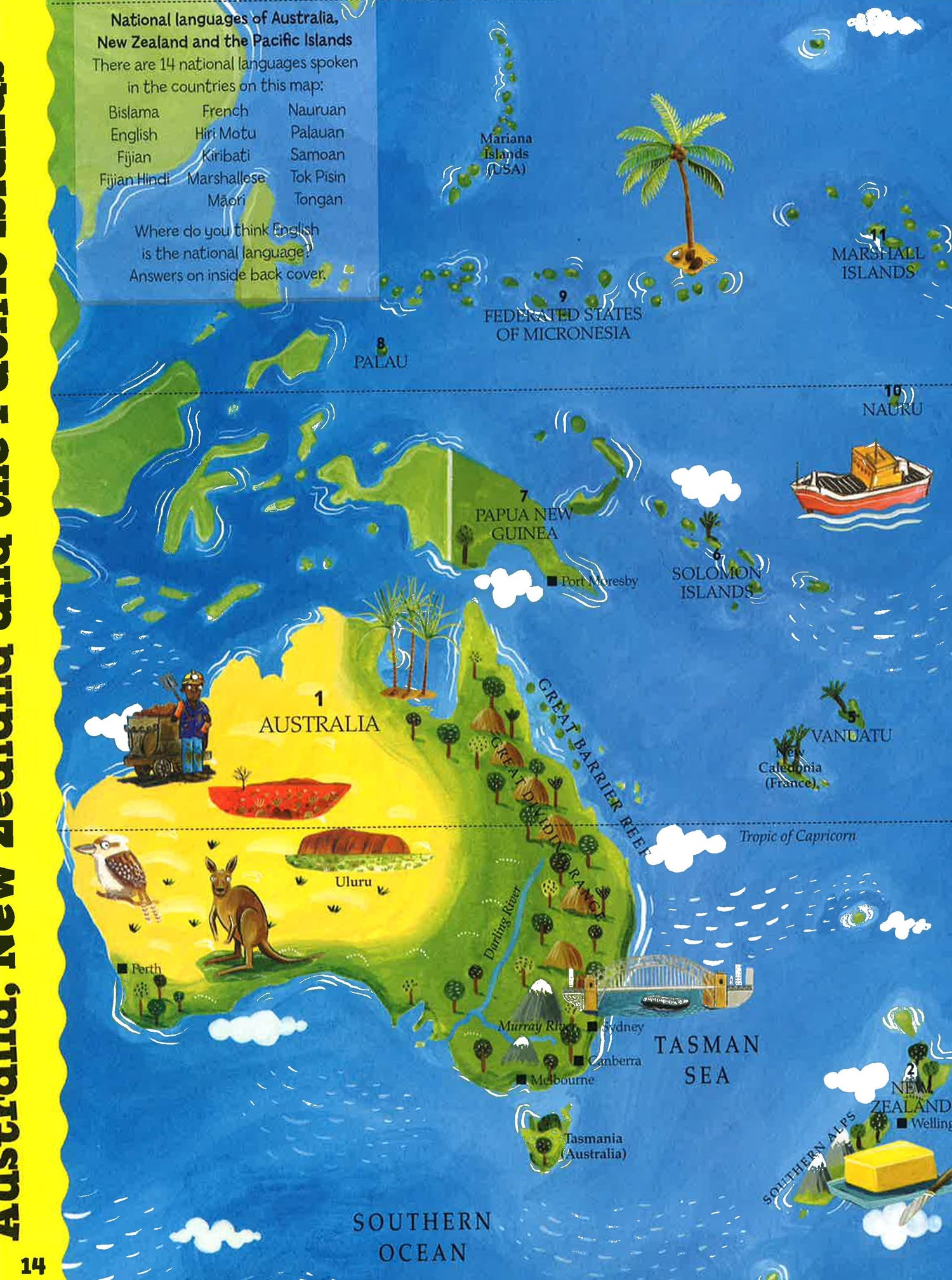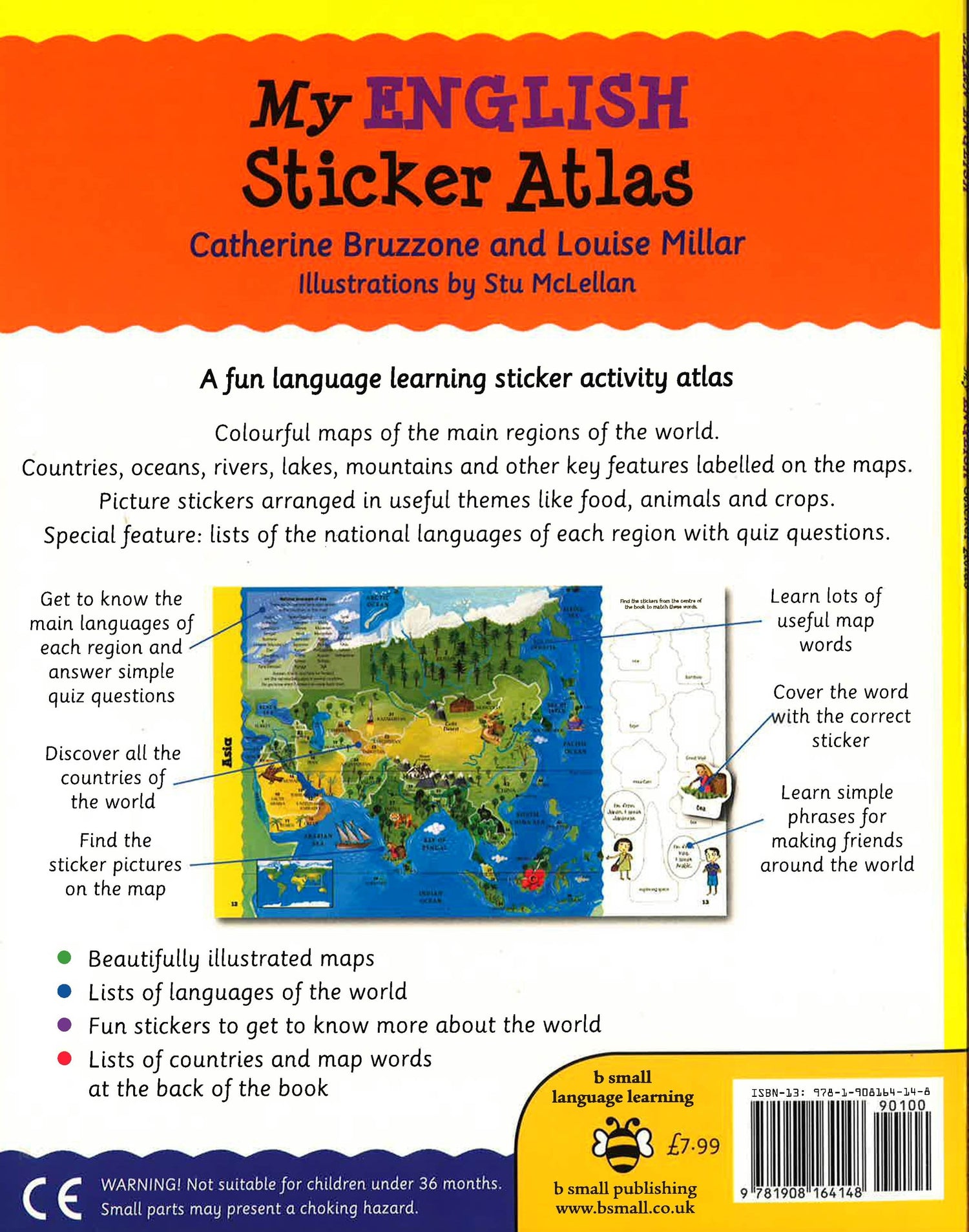 A fun language learning sticker activity atlas. Learn about the world and its languages whilst learning English, too! Colourful maps of the main regions of the world feature countries, oceans, rivers, lakes and mountains labelled in English. The sticker pictures are arranged in seven informative themes: animals, crops, food, industry, monuments, natural features and plants. Lists of the national languages of each region appear on each map. Beautifully illustrated maps. Fun stickers to encourage English practice. Lists of countries and map words in English