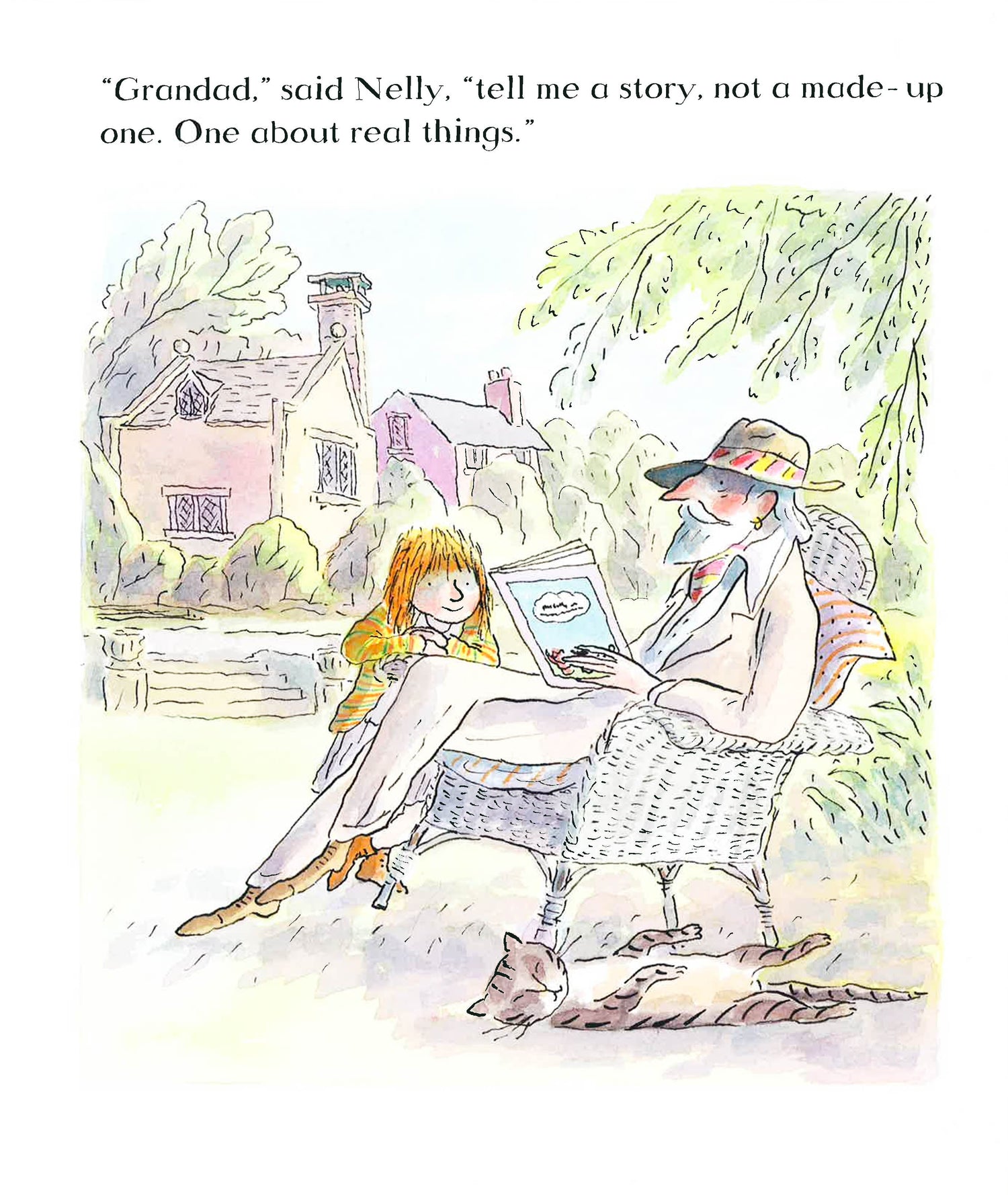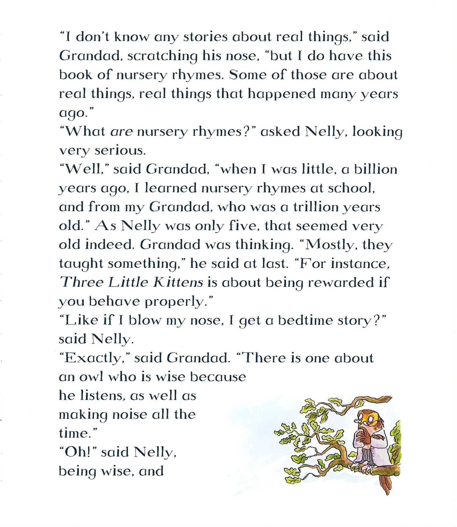 Nelly wants Grandad to tell her a story. But instead, Grandad shows her his old book of nursery rhymes, which includes the playful Three Little Kittens, and the more sinister Ring a Ring of Roses. Grandad is so wise that he even explains the true meaning of each rhyme to Nelly. But not before he has peered around the garden to make sure no one younger than five is listening!