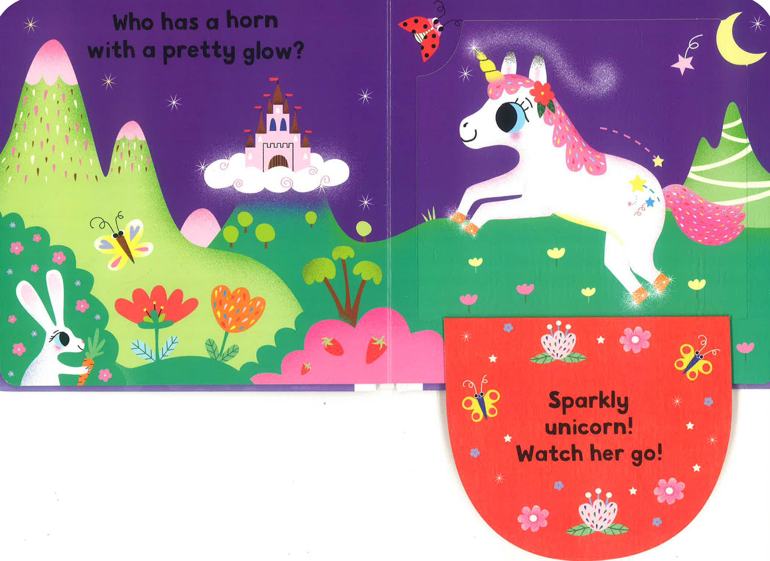 Pull down the BIG flaps and turn the wheel to choose. Perfect for little ones who love unicorns!