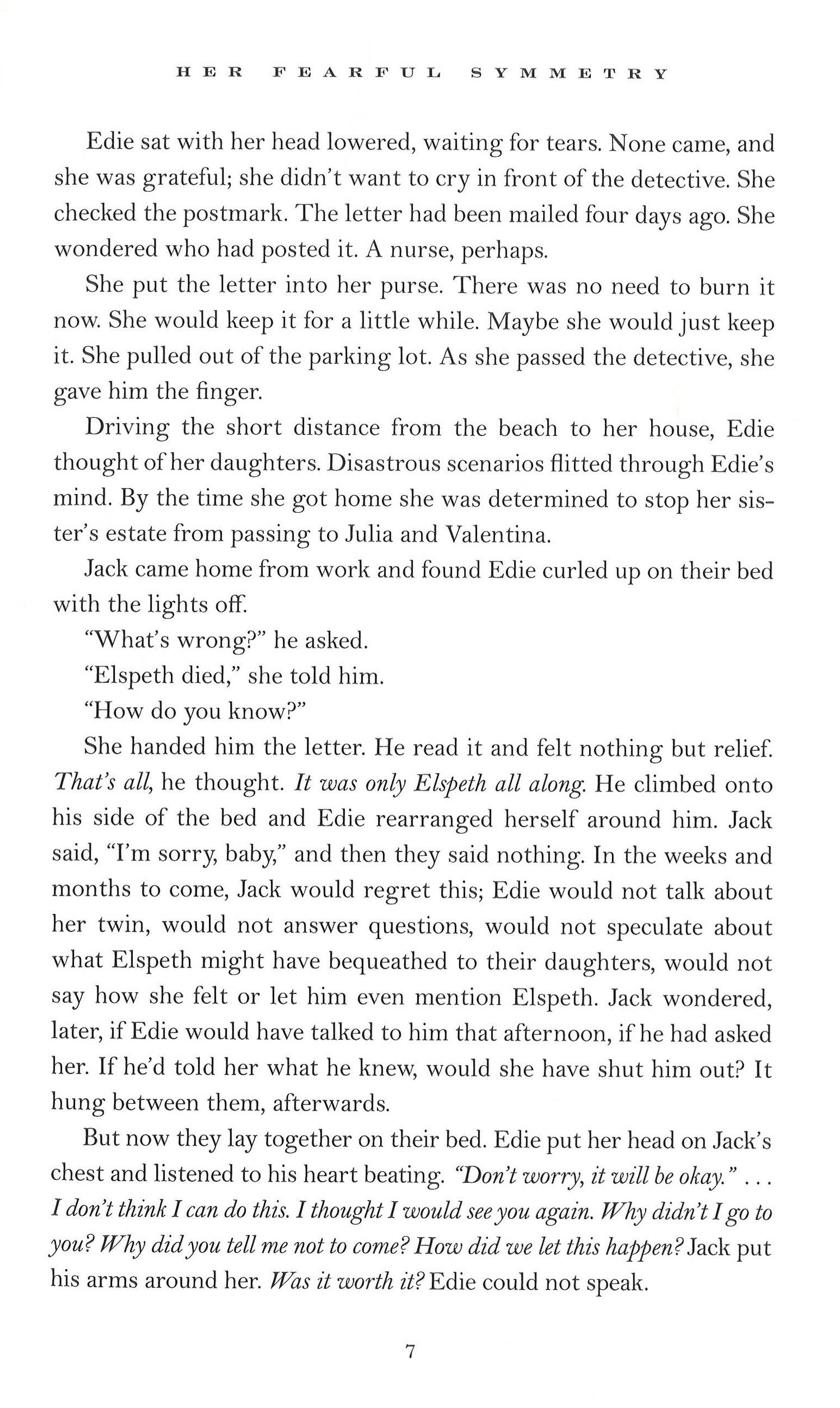 Four thousand copies of this signed limited Collector's Edition with a cover painting by the author and special design elements were printed in September 2009. Audrey Niffenegger's spectacularly compelling second novel opens with a letter that alters the fate of every character. Julia and Valentina Poole are semi-normal American twenty-year-olds with seemingly little interest in college or finding jobs. Their attachment to one another is intense. One morning the mailman delivers a thick envelope to their house in the suburbs of Chicago. From a London solicitor, the enclosed letter informs Valentina and Julia that their English aunt Elspeth Noblin, whom they never knew, has died of cancer and left them her London apartment. There are two conditions to this inher- itance: that they live in it for a year before they sell it and that their parents not enter it. Julia and Valentina are twins. So were the estranged Elspeth and Edie, their mother. The girls move to Elspeth's flat, which borders the vast and ornate Highgate Cemetery, where Christina Rossetti, George Eliot, Radclyffe Hall, Stella Gibbons and Karl Marx are buried. Julia and Valentina come to know the living residents of their building. There is Martin, a brilliant and charming crossword-puzzle setter suffering from crippling obsessive compulsive disorder; Marijke, Martin's devoted but trapped wife; and Robert, Elspeth's elusive lover, a scholar of the cemetery. As the girls become embroiled in the fraying lives of their aunt's neighbors, they also discover that much is still alive in Highgate, including -- perhaps -- their aunt. Author of one of the most beloved first novels in recent years, Niffenegger returns with an unnerving, unforgettable and enchanting ghost story, a novel about love and identity, secrets and sisterhood and the tenacity of life -- even after death.