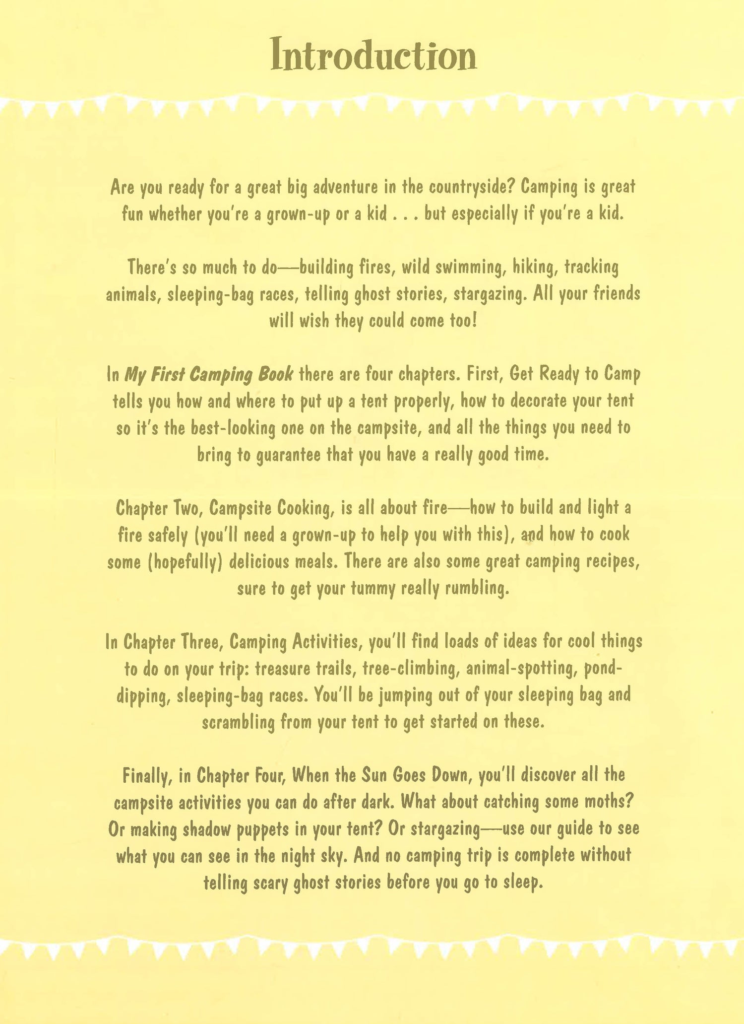 Encourage your children to get outside and enjoy the benefits of outdoor living with 'My First Camping Book'. Start with 'Getting Ready to Camp' and plan everything you need to take with you, and why not make a camp diary before you go so you can record every camping trip? Once you arrive at your campsite, you will find out how to identify a good place to camp, how to put up your tent, and the best way to store your food. Once you’ve pitched your tent, learn how to make a campfire (with the help of an adult!)—the recipes in 'Campsite Cooking' are full of fun treats such as hot dogs, s'mores, and fire-baked apples. You’ll never get bored with 'Camping Activities', which has tips on how to climb trees safely, instructions on how to make a sundial, and insider knowledge on animal tracking. In 'When the Sun Goes Down', you will learn how to become an expert in shadow-puppets, how to identify different stars and constellations, and there are tips on how to tell a really scary ghost story. So roll up your sleeping bag, don’t forget your binoculars and start planning your next camping trip!