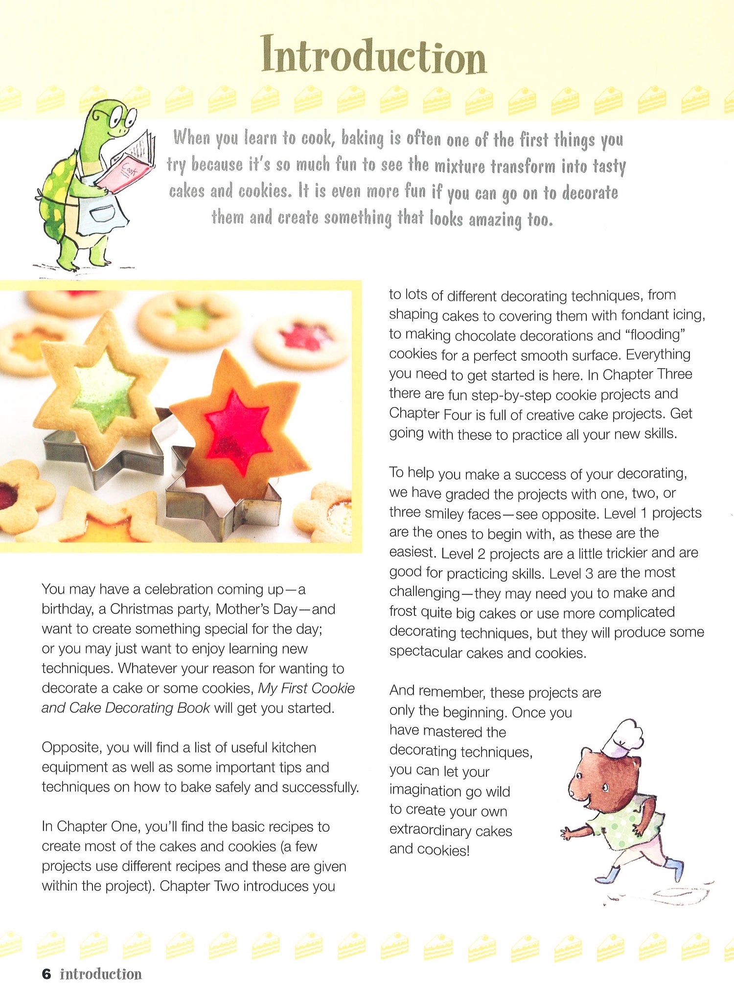 In My First Cookie & Cake Decorating Book you will discover that half the fun of baking is in the decorating! With 35 easy-to-follow step-by-step projects, you will soon be impressing family and friends with delicious decorated cookies and cakes. In Chapter 1, The Basics, there’s a range of cookie and cake recipes that will form the basis of your creations, such as a vanilla sponge and gingerbread cookies. In Chapter 2, Decorating Techniques, you will learn skills such as making and using a piping bag, creating and using templates, cutting shapes, making decorations, and getting creative with a range of colorful and fun toppings. In Chapter 3, Creative Cookies, the projects include Iced Christmas Trees, Snowflakes, Easter Bunnies, Sunflowers, and Gingerbread People. Once you’ve gained confidence and skills by decorating cookies, move on to Chapter 4, Creative Cakes. The recipes include a Snakes & Ladders Cake, Wise Owl, Teddy Bear, Blossom Cake and a Yule Log complete with Christmas decorations. The decorating part of the projects is designed for you to do without help, but you might need a grown-up to help you clean up the mess afterward!