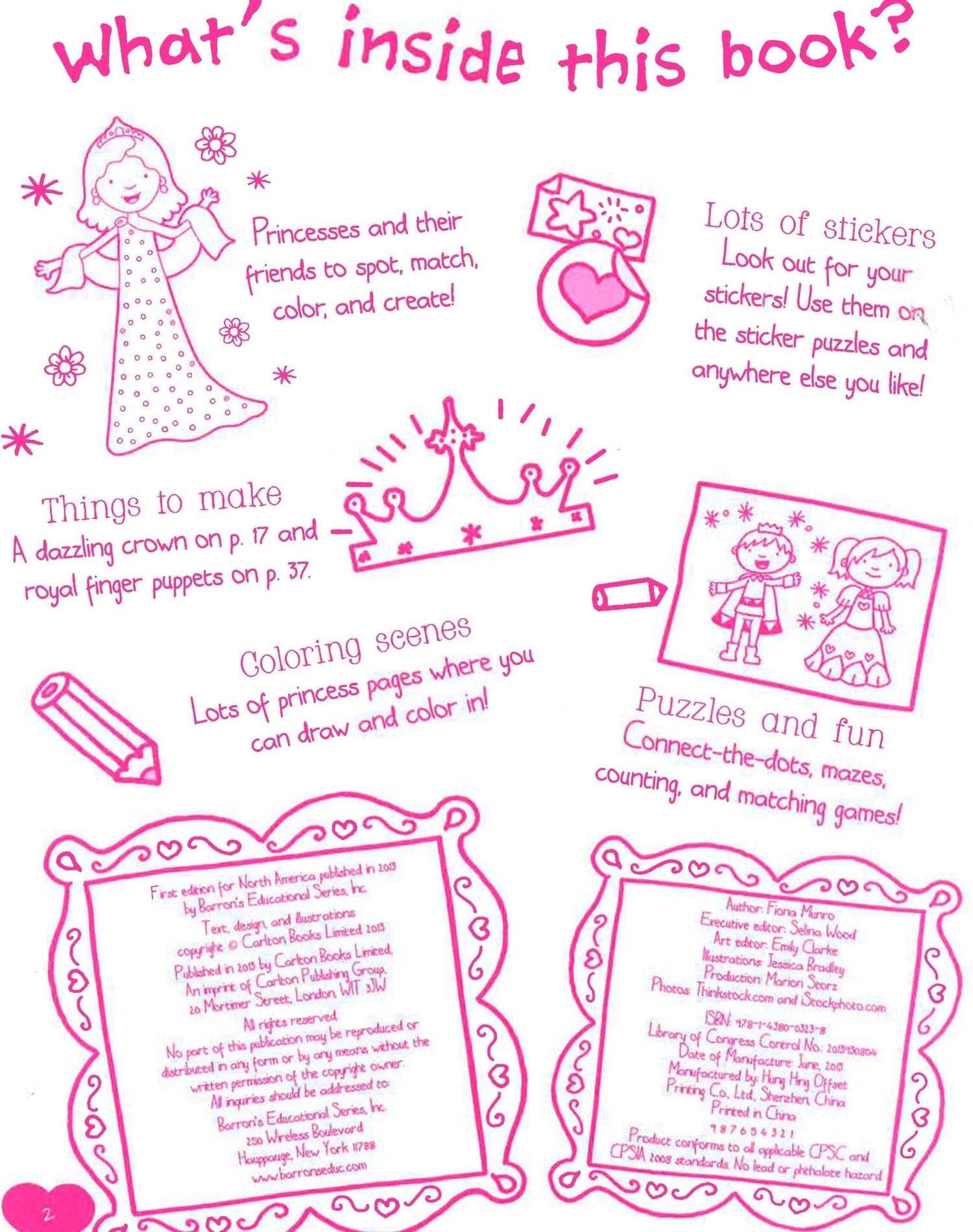 Here is a new title in Barron's growing "My First Creativity Books" series. A clever princess is needed to keep this kingdom in order. Connecting dots for royal surprises, solving kingdom mazes, decorating for a garden party and making a beautiful crown are some of the activities in this fun-filled book. Based on the popular "Creativity Activity Books" for older children, these titles are made smaller to suit little hands and are filled with activities that appeal to boys and girls in pre-K through second grade. Every title in the "My First Creativity Books" series features: Clever coloring exercisesEasy connect-the-dot drawing projectsSpot-the-difference illustrationsMazes, puzzles, and simple construction activities200 full-color stickersFold-out scenes for sticker play Developed by educational experts to stimulate younger kids' imaginations, "My First Creativity Books" offer children many hours of learning fun. Illustrations include 28 pages in color.