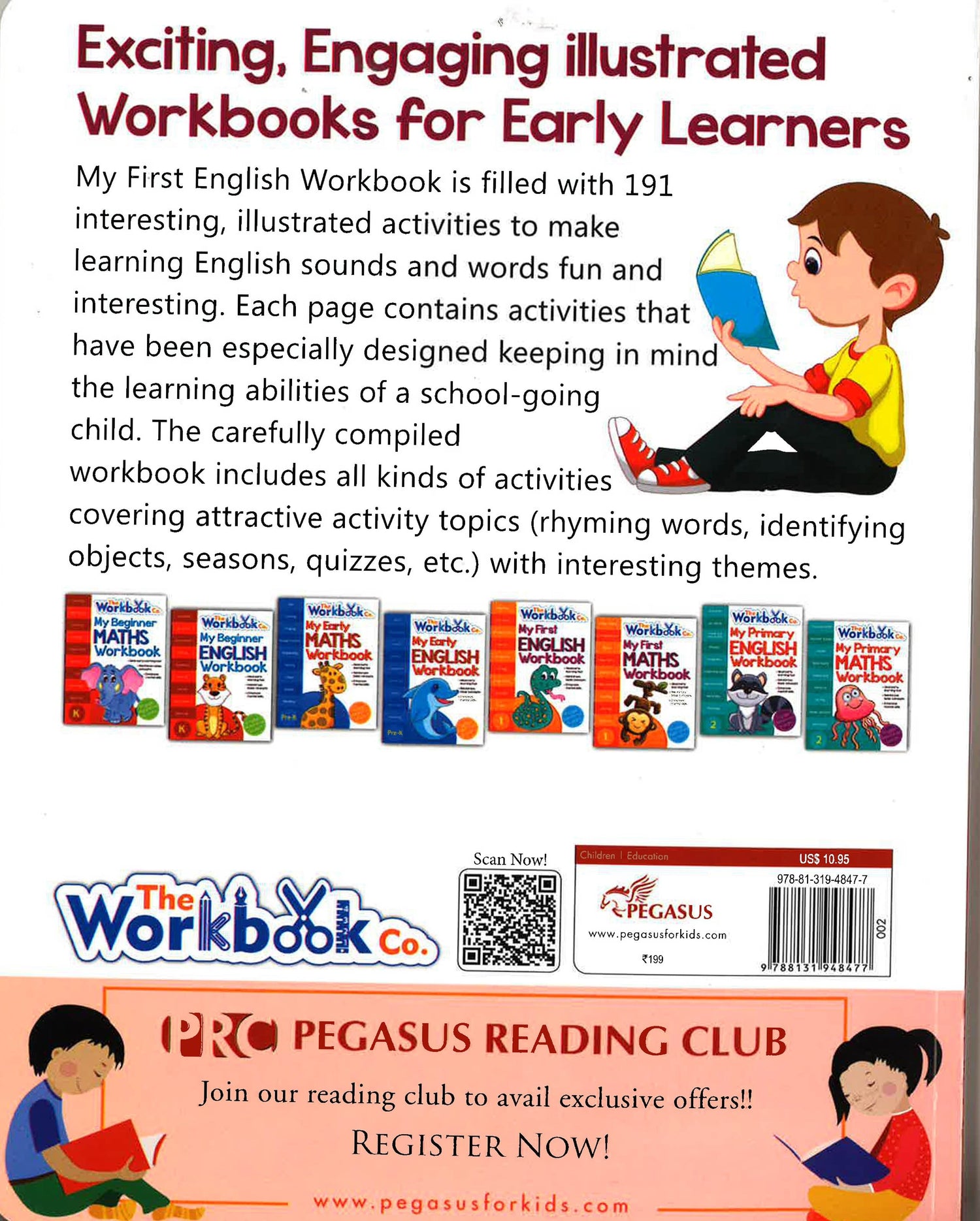 My first English workbook is filled with 191 interesting illustrated activities to make learning English sounds and words fun and interesting. each page contains activities that have been specially designed keeping in mind the learning abilities of a school going child. the carefully compiled work book includes all kinds of activities covering attractive activity topics, rhyming words identifying objects, Seasons, quizzes etc. with interesting themes.