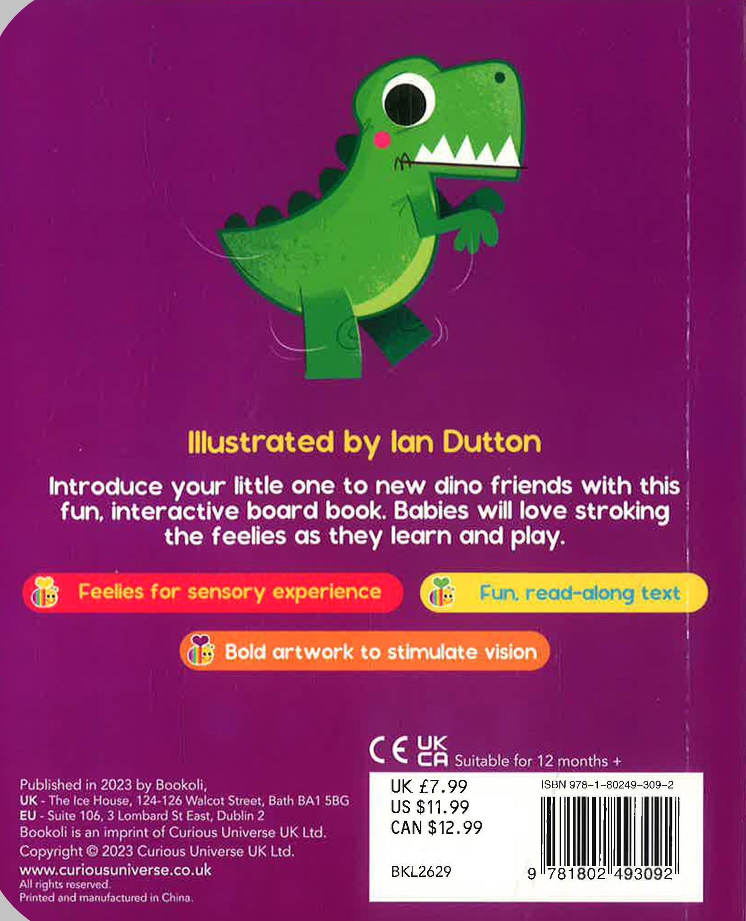 Introduce your little one to new prehistoric friends with My First Touch and Feel Book: Dinosaurs. This fun, interactive board book has thick, easy-to-grip pages, and a range of colourful and tactile feelies that babies will love to stroke and feel as they learn and play, perfect for littler explorers! The bold but cute artwork from Ian Dutton stimulates vision while the fun, lively text invites the reader to learn about first animals through interactive play. The soft and colourful feelies also introduce a sensory experience as you learn all about your first dinosaurs in this My First Touch and Feel Book: Dinosaurs. With soft, tactile feelies, the My First Touch and Feel board books help provide extra sensory stimulation while enjoying the book Sturdy and strong board pages are perfect for little ones to grab onto and hold themselves Reading short, simple stories together helps to build listening and visual skills that form the basis for independent reading later on Storytime can help nurture the parent and child bond, regular bedtime stories can provide routine and stability An ideal gift purchase for a young family, or to enjoy with someone special