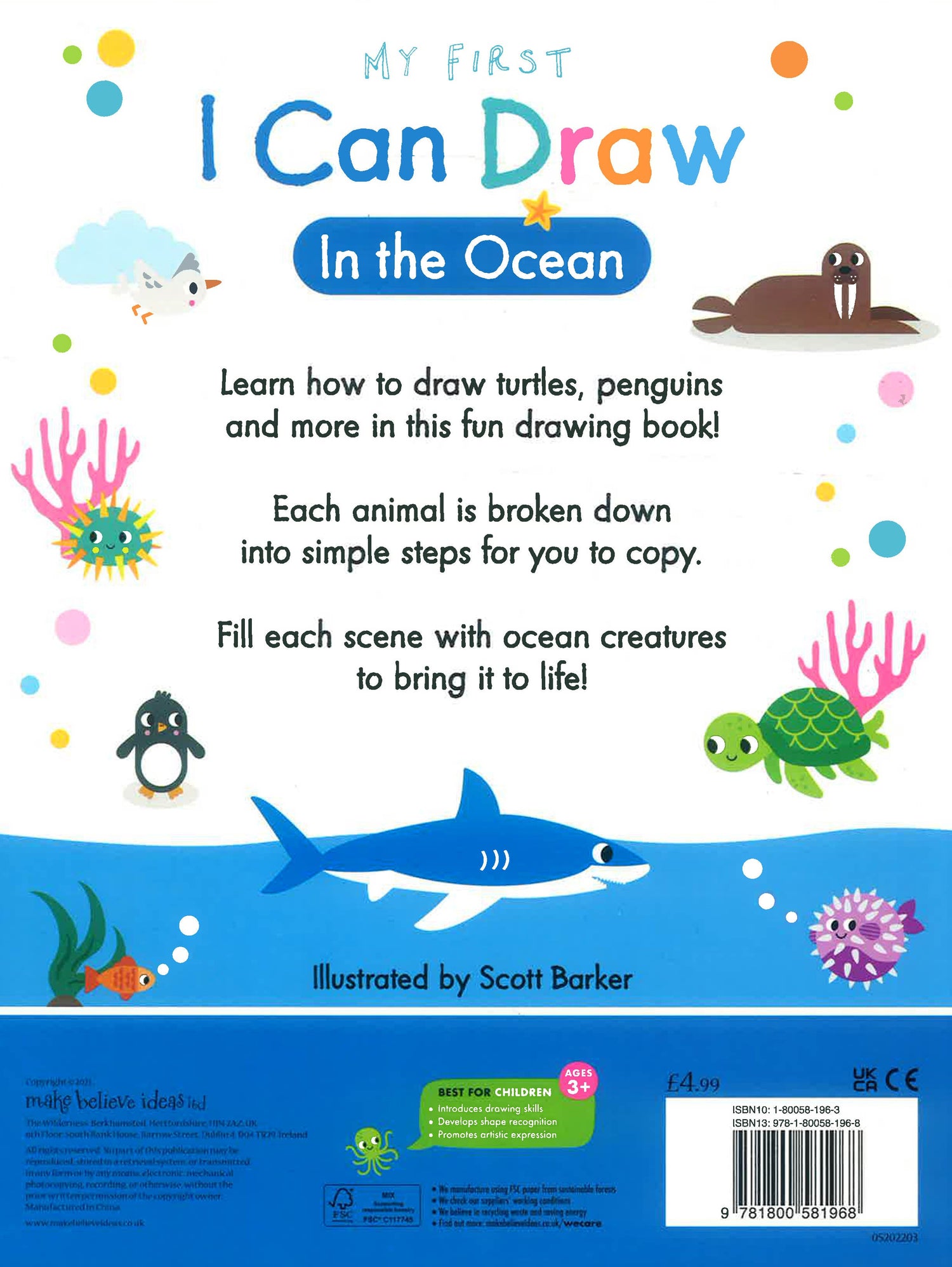Learn how to draw swimming sharks, super submarines and more in this fun drawing book! My First I Can Draw In the Ocean introduces children to drawing ocean creatures and vehicles in simple, easy-to-follow steps. Then, practise your drawings by filling the fun scenes at the book of the book. 32 pages of step-by-step drawing instructions Includes practice pages Includes cute, simple illustrations that children will love to copy