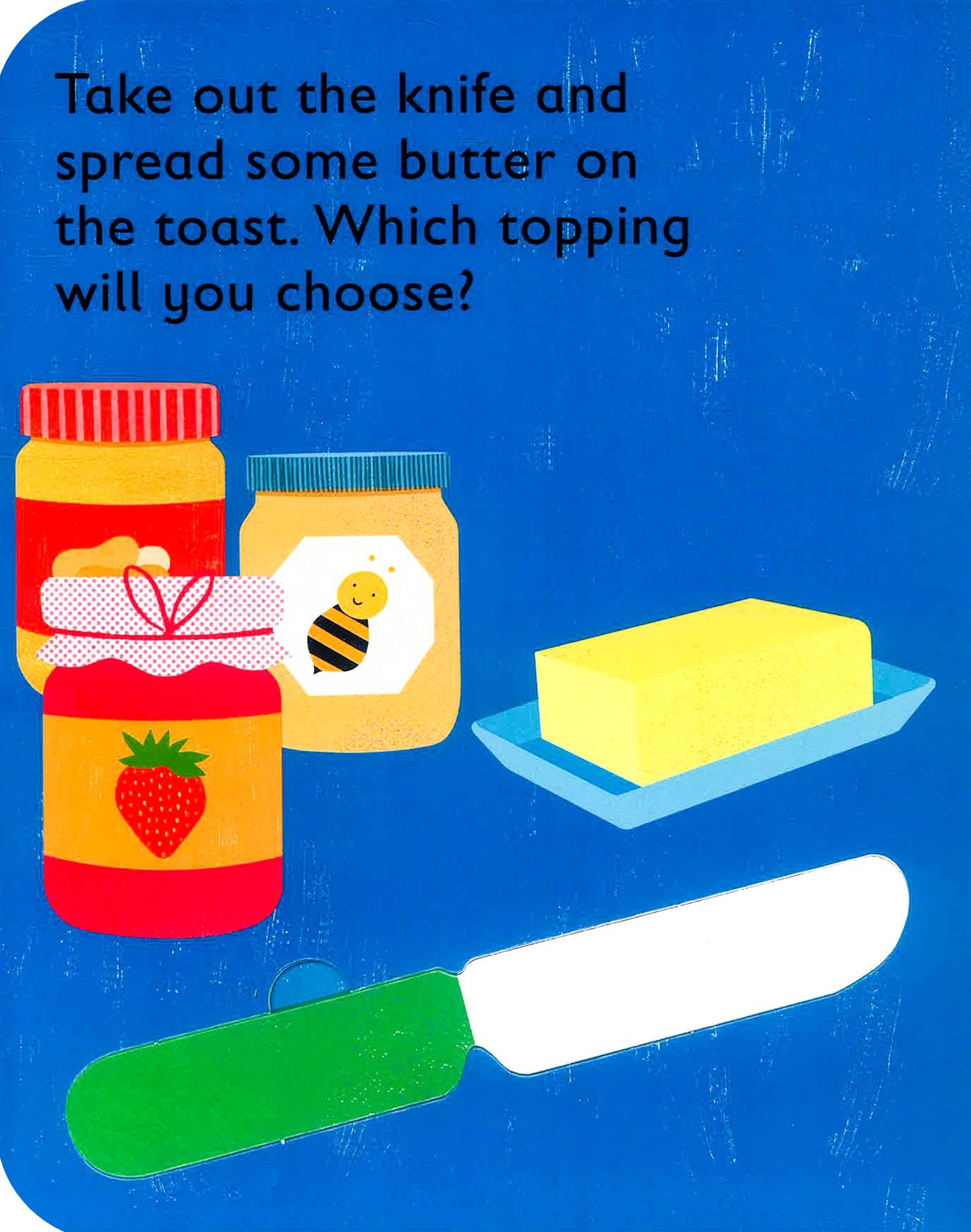 This tactile board book is a fun, engaging introduction to the kitchen. Press-out pieces, including a child-sized knife, fork and spoon, are perfect for encouraging a lively, interactive reading experience for parents and children. Twirl noodles in an oval bowl, slice a round pizza and spread jam on a square piece of bread, with real miniature utensils!
