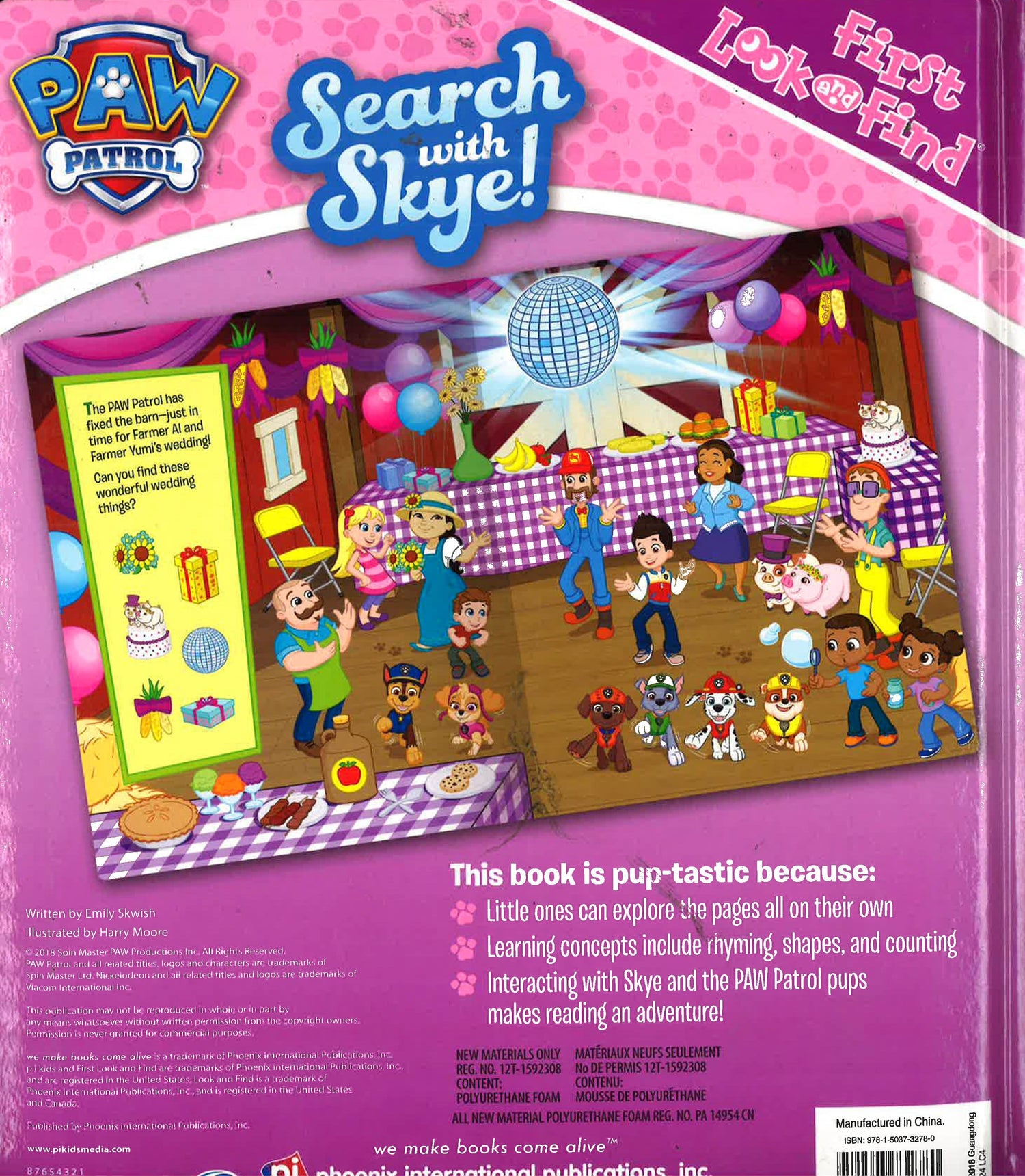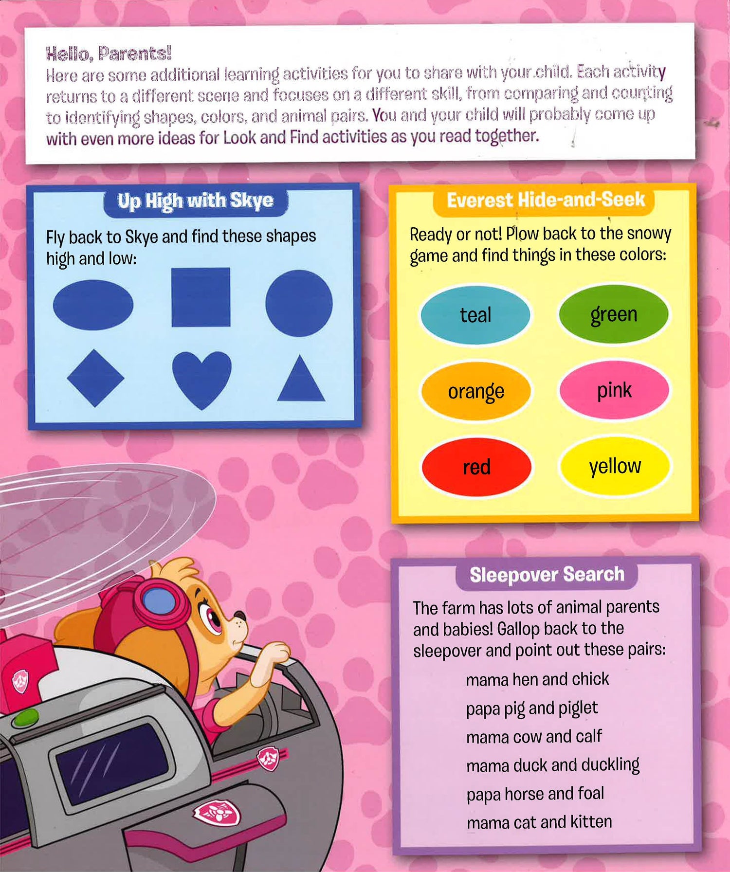 Take off with the PAW Patrol's flying pup, Skye! Search 7 soaring scenes for hidden characters and objects. Toddlers can search, point, match, and compare all on their own - no reading required! Then, turn to the last pages of the book for even more Look and Find activities that caregivers and children can enjoy together. Look and Find play encourages focus and exploration, and helps build early learning skills.