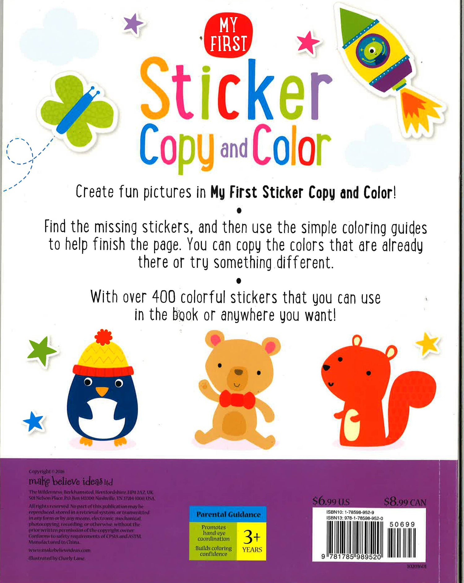 Create fun pictures in My First Sticker Copy and Color!Find the missing stickers, and then use the simple coloring guides to help finish the page. You can copy the colors that are already there or try something different.With over 400 colorful stickers that you can use in the book or anywhere you want!