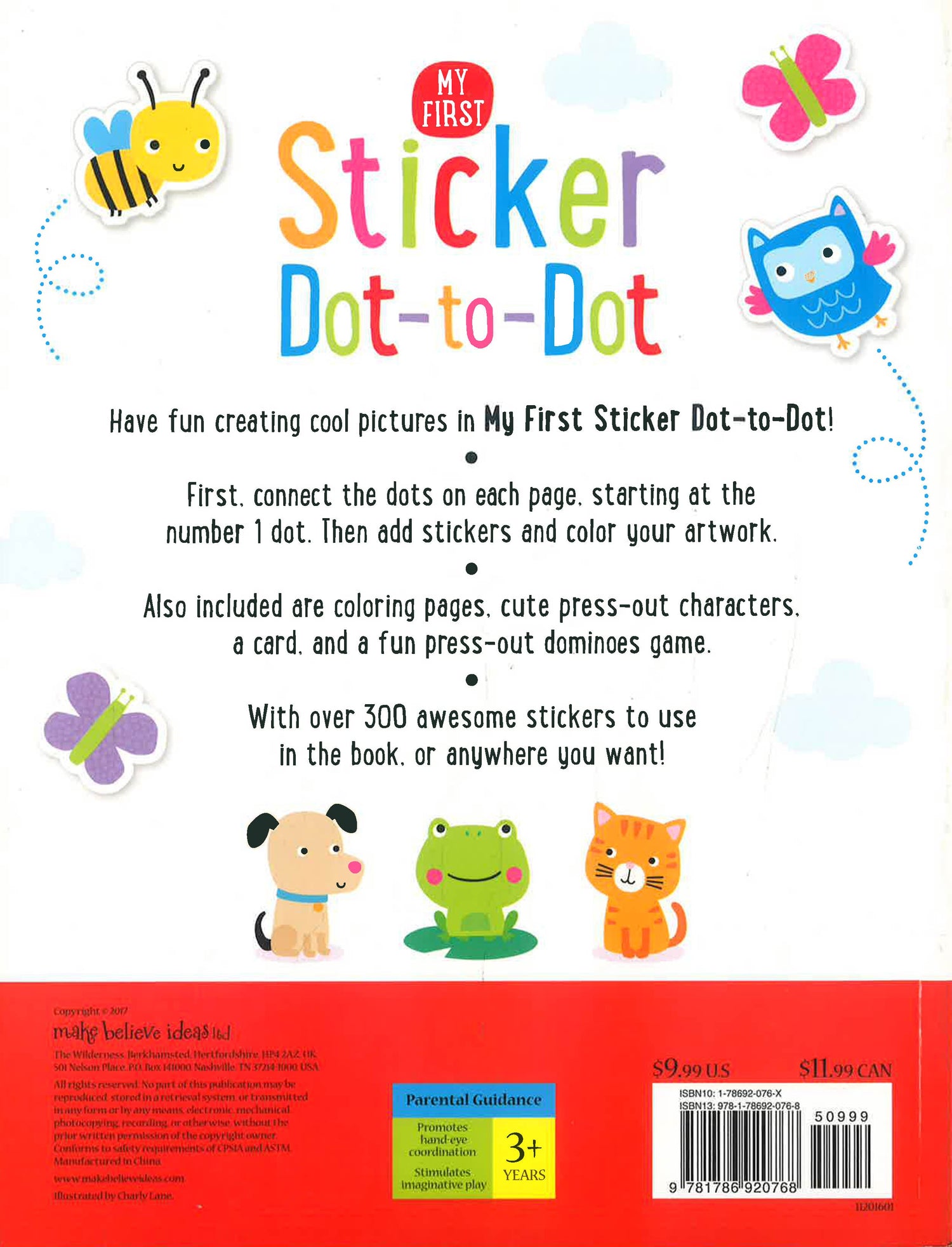 Introducing My First Sticker Dot-to-Dot, a fabulous sticker activity book that's perfect for little ones who are just starting to sticker! This innovative book uses dot-to-dots and large stickers to develop children's pen control and hand-eye coordination. Each colorful page encourages children to complete the pictures and patterns by joining the dots and using the large stickers. Children can choose whatever color they like to complete each picture, giving them the freedom to be creative from a young age! AN INNOVATIVE STICKER DOT-TO-DOT BOOK, ENCOURAGING LITTLE ONES TO BE CREATIVE