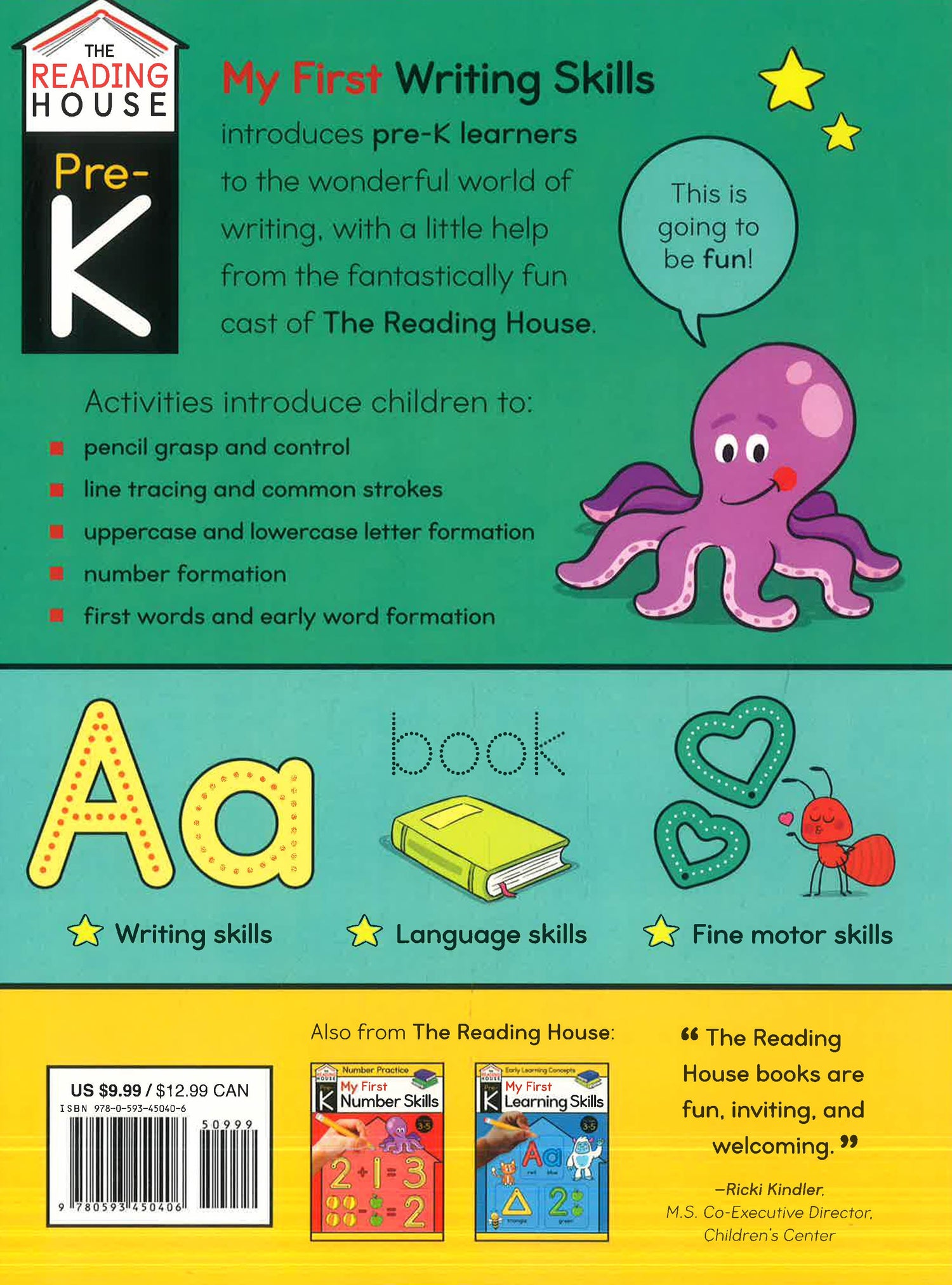 From lines to letters and numbers to shapes, My First Writing Skills is a colorful, fun introduction to the skills kids need to succeed with writing and in preschool. With perforated pages for easy daily or on-the-go use, the dozens of included fun, simple handwriting and tracing activities to help cement kids' pen control as it relates to the wonderful world of writing--all led by the charming and adorable animal cast from The Reading House.