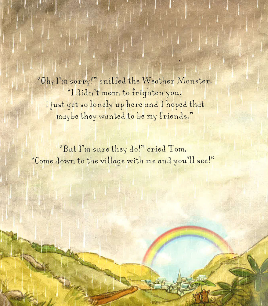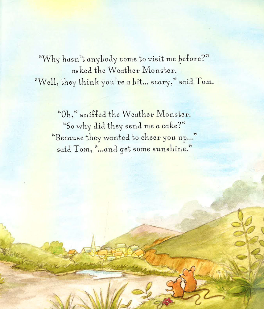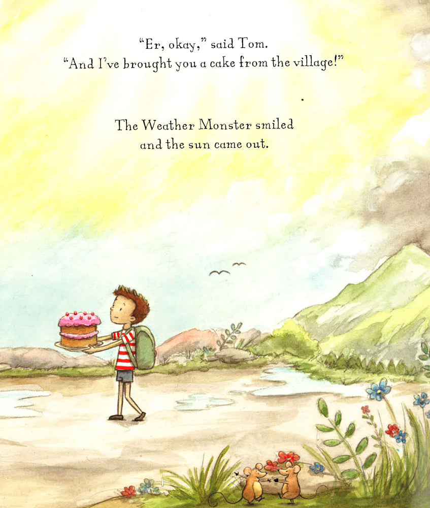 There lived a weather monster on the top of a high mountain. He controlled the weather. When he was happy, the sun was shining; when he was sad, it would rain for days. Recently, the weather monster has been depressed. The villagers at the foot of the mountain were troubled by the bad weather. They decided to find a way to make the weather monster happy again.