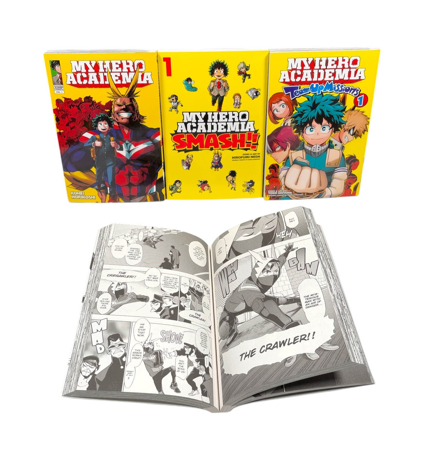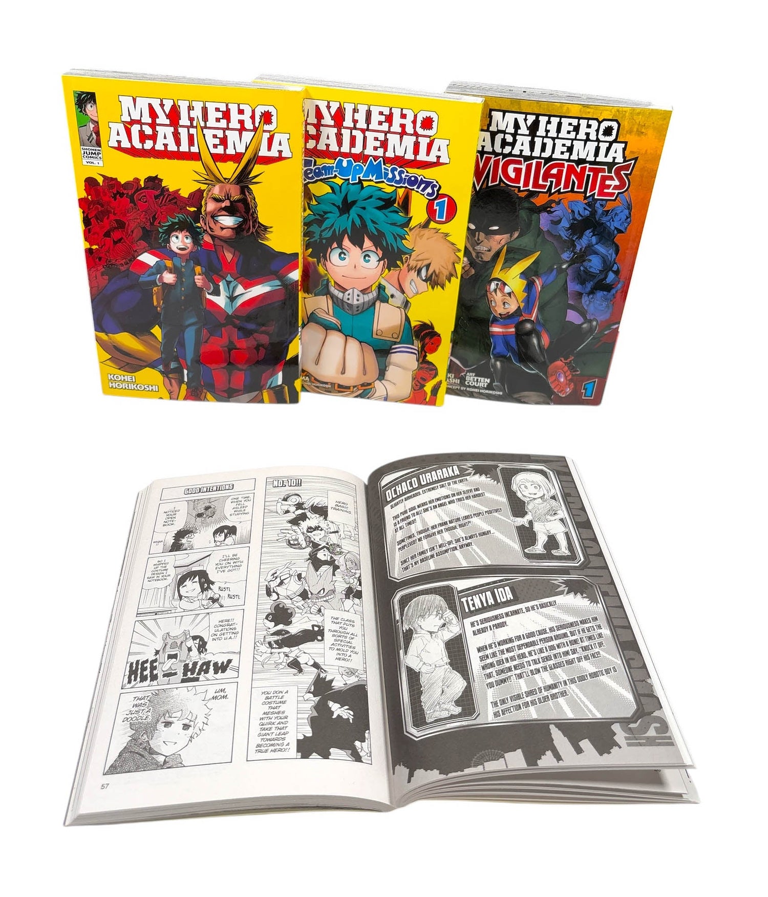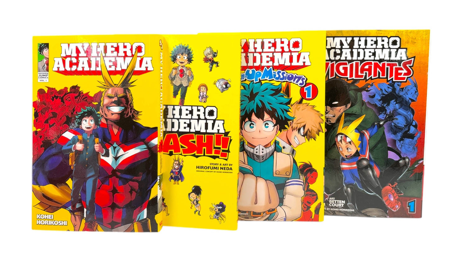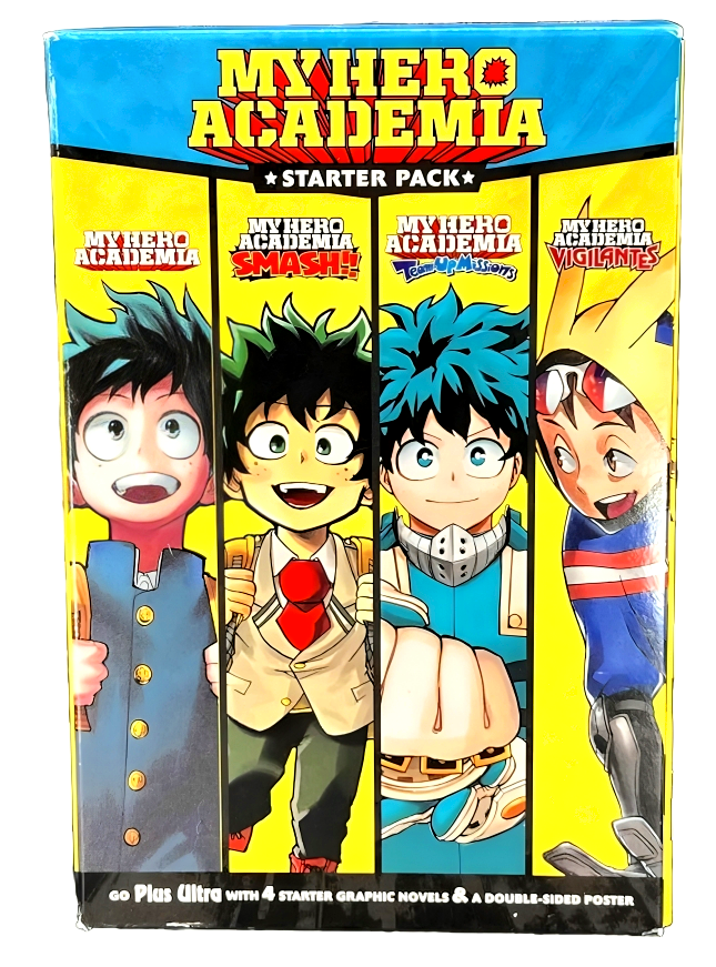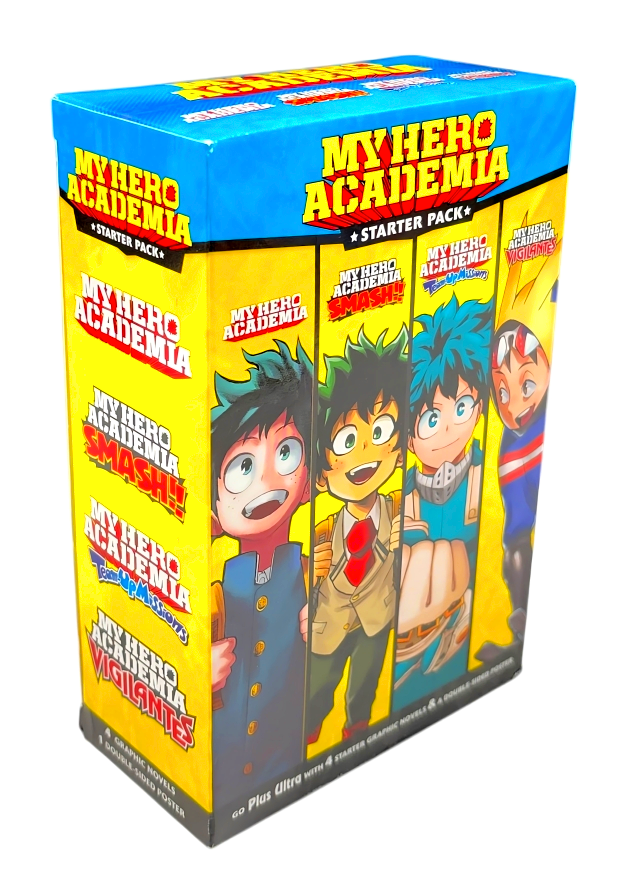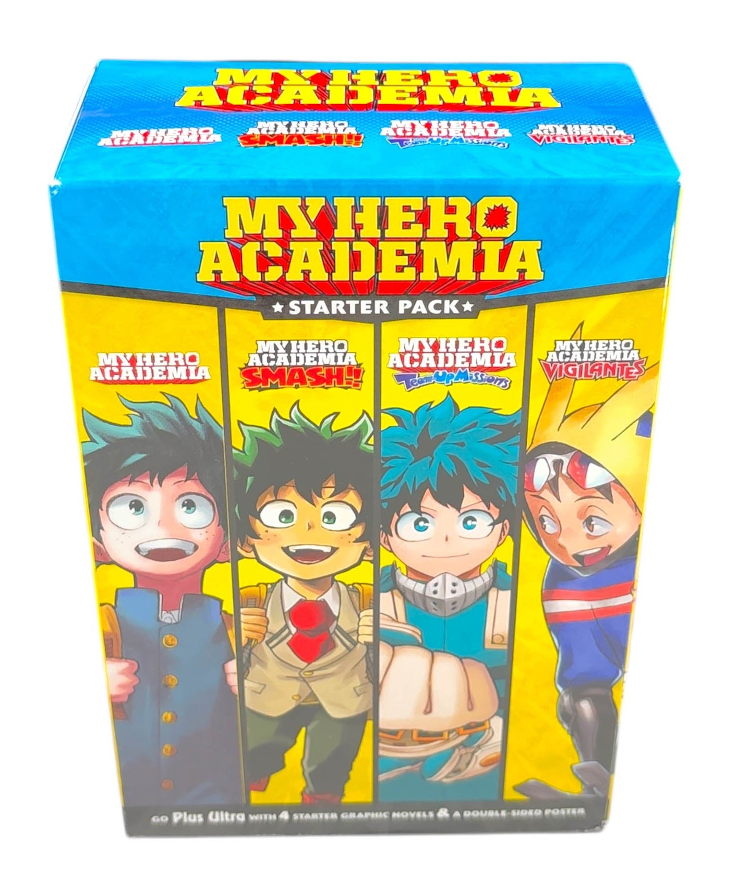 Embark on an extraordinary journey with this My Hero Academia starter pack! Immerse yourself in the world of superheroes as Midoriya inherits the incredible power of the world's greatest hero. But greatness doesn't come easy, and he'll have to go Plus Ultra to master his newfound abilities. This set includes the first volumes of four thrilling manga series: My Hero Academia, My Hero Academia Smash!!, My Hero Academia Team Up Missions, and My Hero Academia Vigilantes. With these captivating stories, you'll witness Midoriya's struggles, triumphs, and the bonds he forges with fellow heroes-in-training. As a bonus, you'll receive a double-sided poster featuring your favorite characters, perfect for decorating your space with the spirit of heroism. Dive into this exciting universe and experience the action, drama, and heart-warming moments that have made My Hero Academia a global phenomenon. Whether you're a longtime fan or new to the series, this starter pack is the ultimate way to begin your heroic adventure!