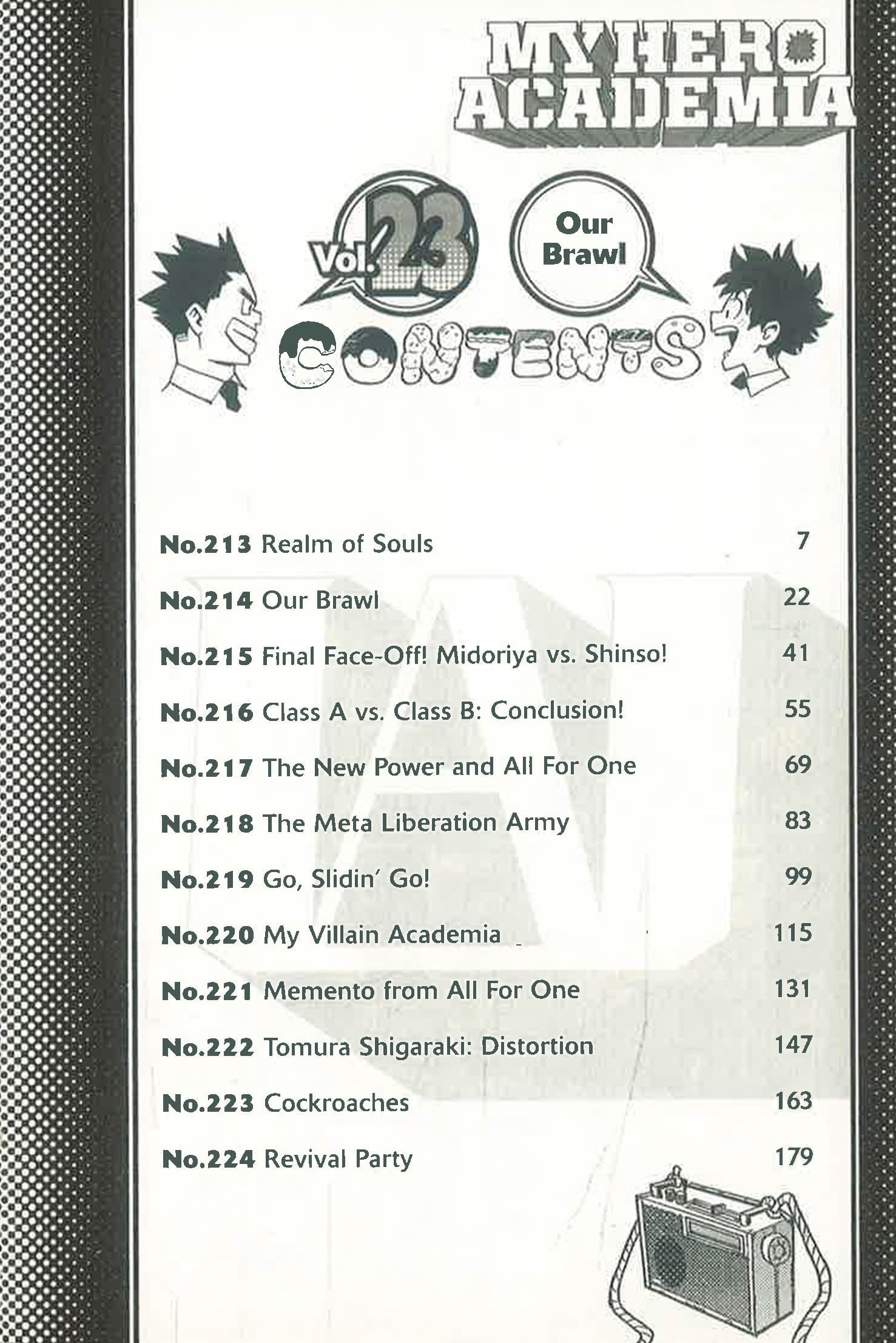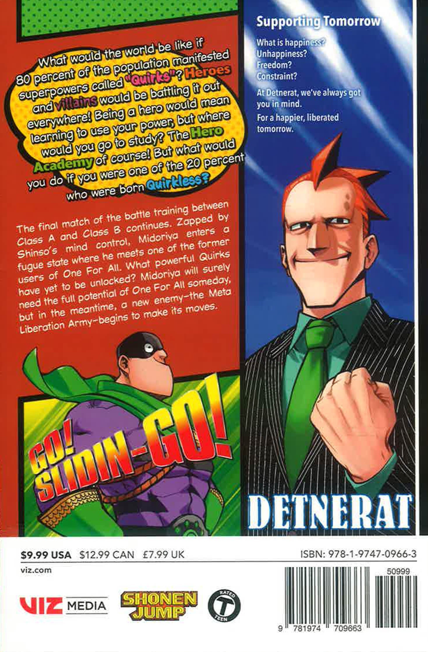 The final match of the battle training between Class A and Class B continues. Zapped by Shinso’s mind control, Midoriya enters a fugue state where he meets one of the former users of One For All. What powerful Quirks have yet to be unlocked? Midoriya will surely need the full potential of One For All someday, but in the meantime, a new enemy—the Meta Liberation Army—begins to make its moves.