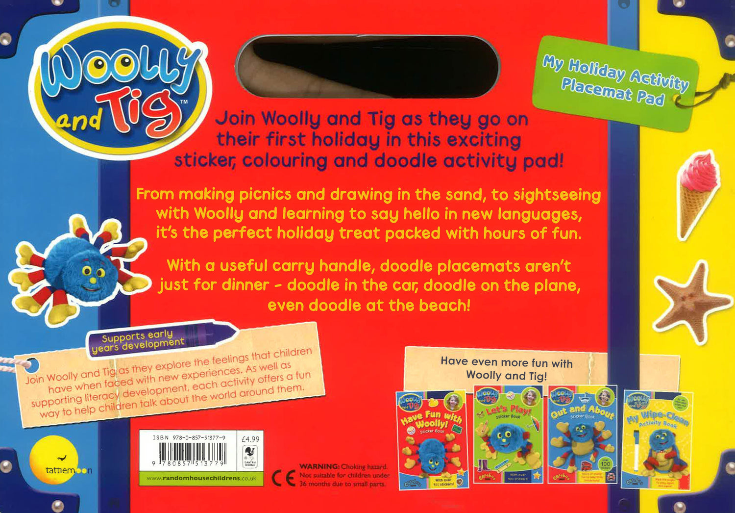 Join Woolly and Tig as they go on their first holiday in this exciting sticker, colouring and doodle activity pad! From making picnics and drawing in the sand, to sight-seeing with Woolly, sending a postcard, and learning to say hello in different languages, it's the perfect holiday treat packed with hours of fun. With stickers and a useful carry handle, doodle placemats aren't just for dinner - doodle in the car, doodle on the plane, even doodle on the beach! Look out for the QR code inside the book to download a bonus holiday wall chart and extra Woolly and Tig activity sheets!
