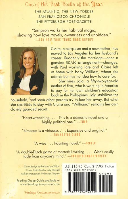 Claire, a composer and a new mother, has moved to Los Angeles so that her husband can follow his passion for writing television comedy. Suddenly the marriage?once a genuine 50/50 arrangement?changes, with Paul working late and Claire left at home with baby William, whom she adores but has no idea how to care for. She hires Lola, a fifty-two-year-old mother of five, who is working in America to pay for her own children?s higher education back in the Philippines. Lola stabilizes the rocky household, and soon other parents try to lure her away. But what she sacrifices to stay with Claire and ?Williamo? remains her own closely guarded secret. *This book may have remainder mark*