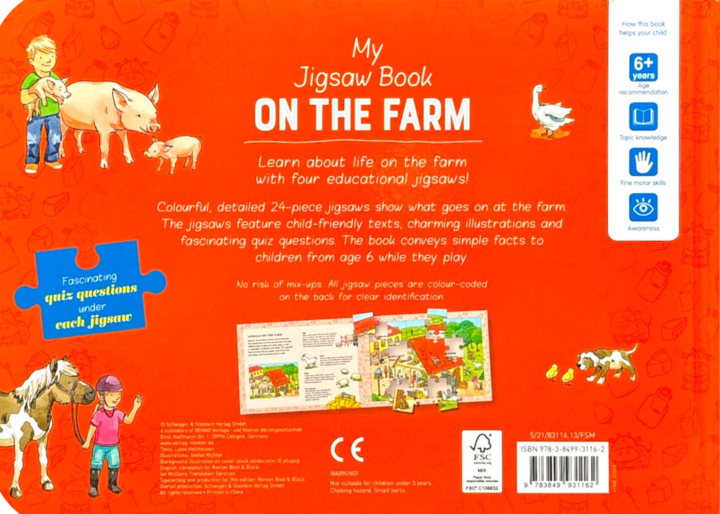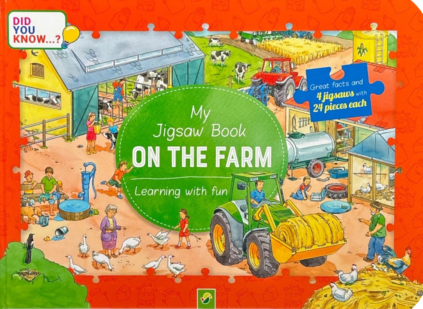 Learn about life on the farm with four educational jigsaws! Colourful, detailed 24-piece jigsaws show what goes on at the farm. The jigsaws feature child-friendly texts, charming illustrations and fascinating quiz questions. The book conveys simple facts to children from age 6 while they play.