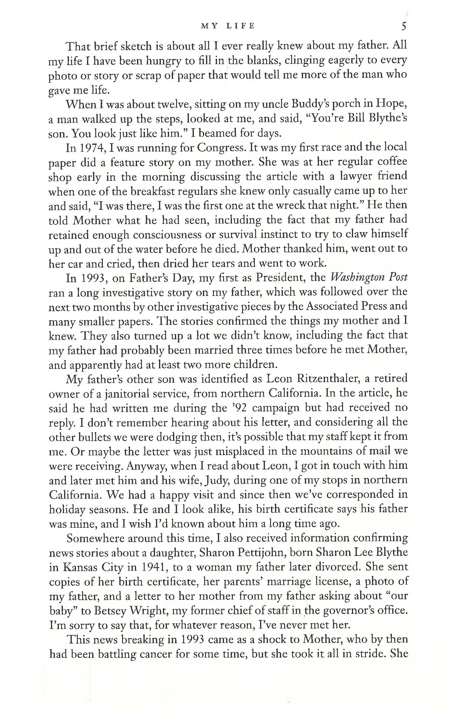 We come to understand the emotional pressures of his youth--born after his father's death; caught in the dysfunctional relationship between his feisty, nurturing mother and his abusive stepfather, whom he never ceased to love and whose name he took; drawn to the brilliant, compelling Hillary Rodham, whom he was determined to marry; passionately devoted, from her infancy, to their daughter, Chelsea, and to the entire experience of fatherhood; slowly and painfully beginning to comprehend how his early denial of pain led him at times into damaging patterns of behavior.
