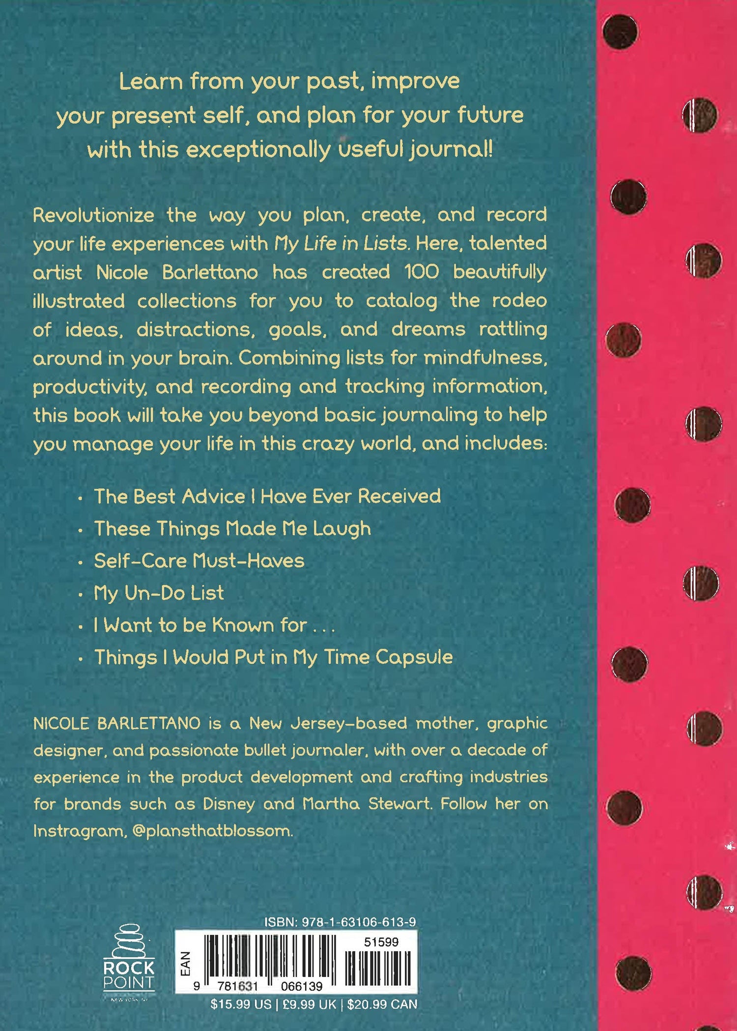 Revolutionize the way you plan, create, and record your day-to-day experiences with My Life in Lists. Here, talented artist Nicole Barlettano has created beautifully illustrated collection pages for you to start filling in your thoughts, dreams, and lists of favorites as you push past planning into the wilder possibilities of a free-form journal. Catalog the rodeo of ideas and distractions constantly rattling around in your brain as you fill in these pages, with collections that include exercises in self-discovery and gratitude, but also a place to record important information and track your progress on ongoing projects. Combining mindfulness with productivity, these thoughtfully designed collections will take you beyond basic journaling to help you manage your life in this crazy world: Life GoalsAchievements & MilestonesBook TrackerMusic TrackerIdea PageUn-Do ListDear DiaryMovie TrackerSelf Care To-Do ListActs of KindnessTravel Bucket ListThen vs. NowYearly Check-In/ResolutionsWhat Worked/What Didn'tImprove every aspect of your life with this exceptionally useful journal.