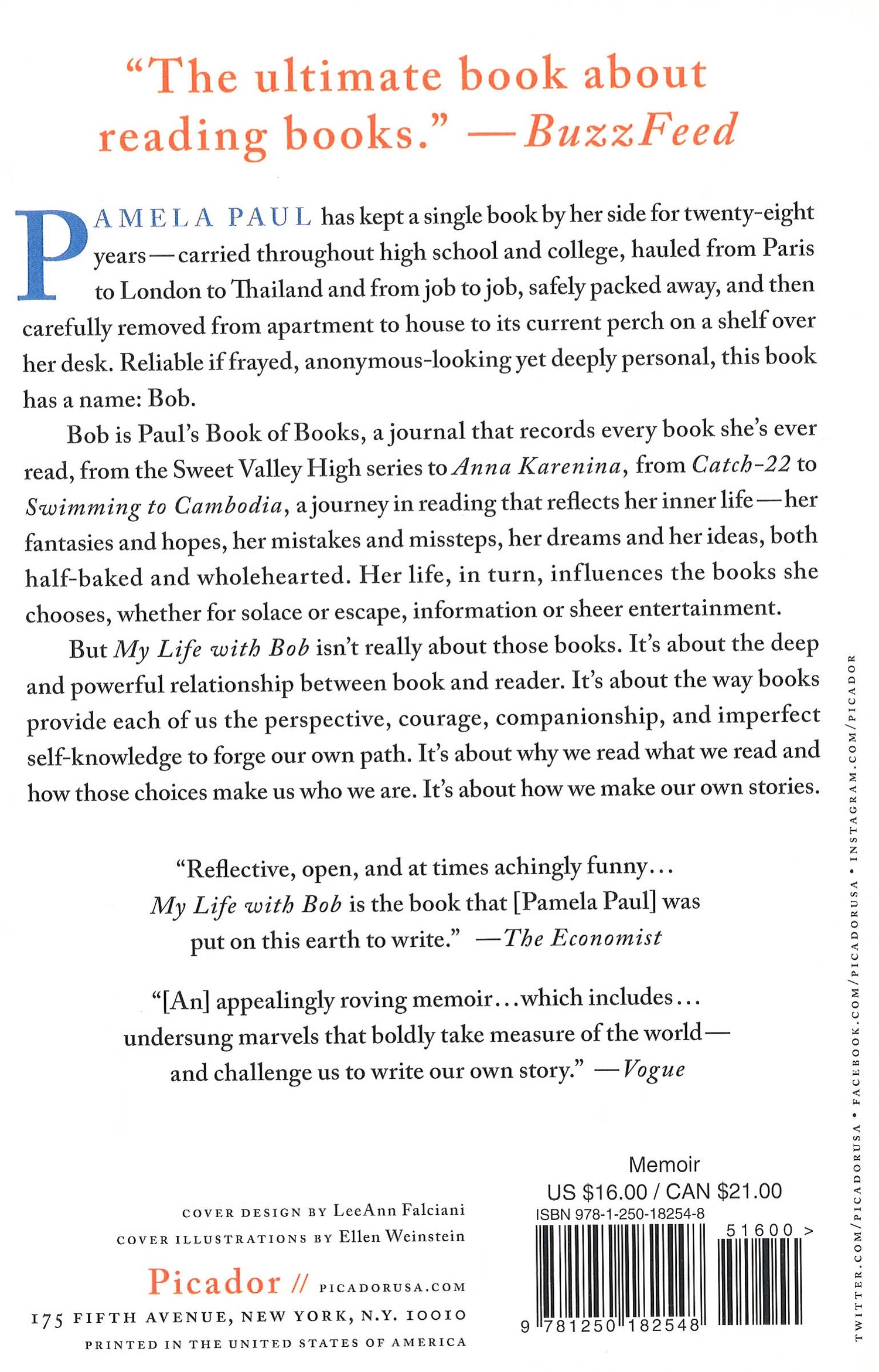 Pamela Paul has kept a single book by her side for twenty-eight years - carried throughout high school and college, hauled from Paris to London to Thailand, from job to job, safely packed away and then carefully removed from apartment to house to its current perch on a shelf over her desk - reliable if frayed, anonymous-looking yet deeply personal. This book has a name: Bob. Bob is Paul's Book of Books, a journal that records every book she's ever read, from Sweet Valley High to Anna Karenina, from Catch-22 to Swimming to Cambodia, a journey in reading that reflects her inner life - her fantasies and hopes, her mistakes and missteps, her dreams and her ideas, both half-baked and wholehearted. Her life, in turn, influences the books she chooses, whether for solace or escape, information or sheer entertainment. But My Life with Bob isn't really about those books. It's about the deep and powerful relationship between book and reader. It's about the way books provide each of us the perspective, courage, companionship, and imperfect self-knowledge to forge our own path. It's about why we read what we read and how those choices make us who we are. It's about how we make our own stories.