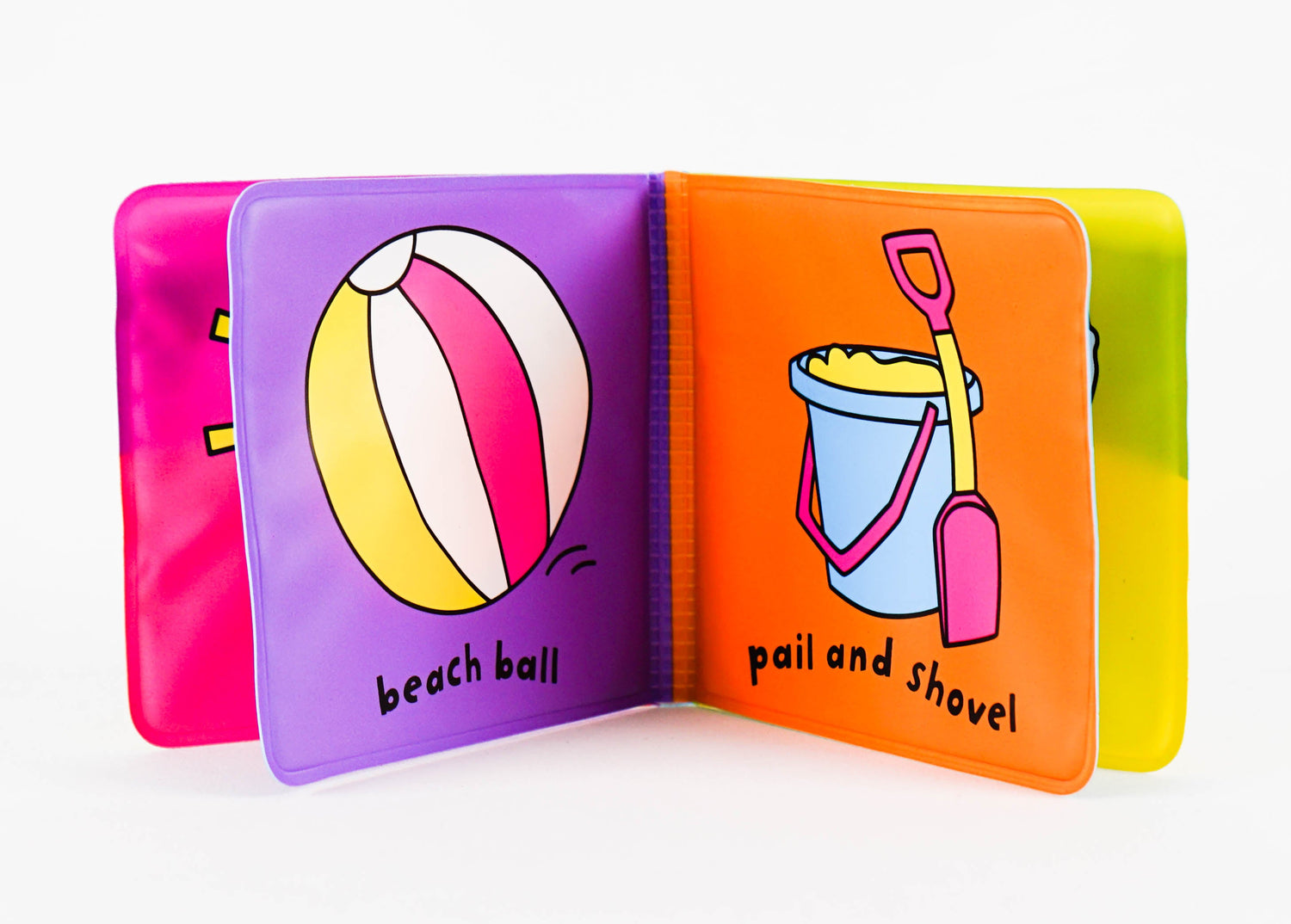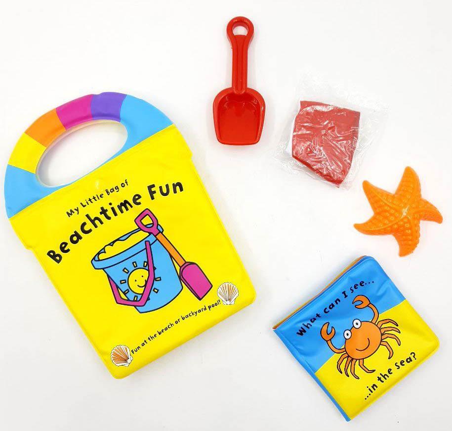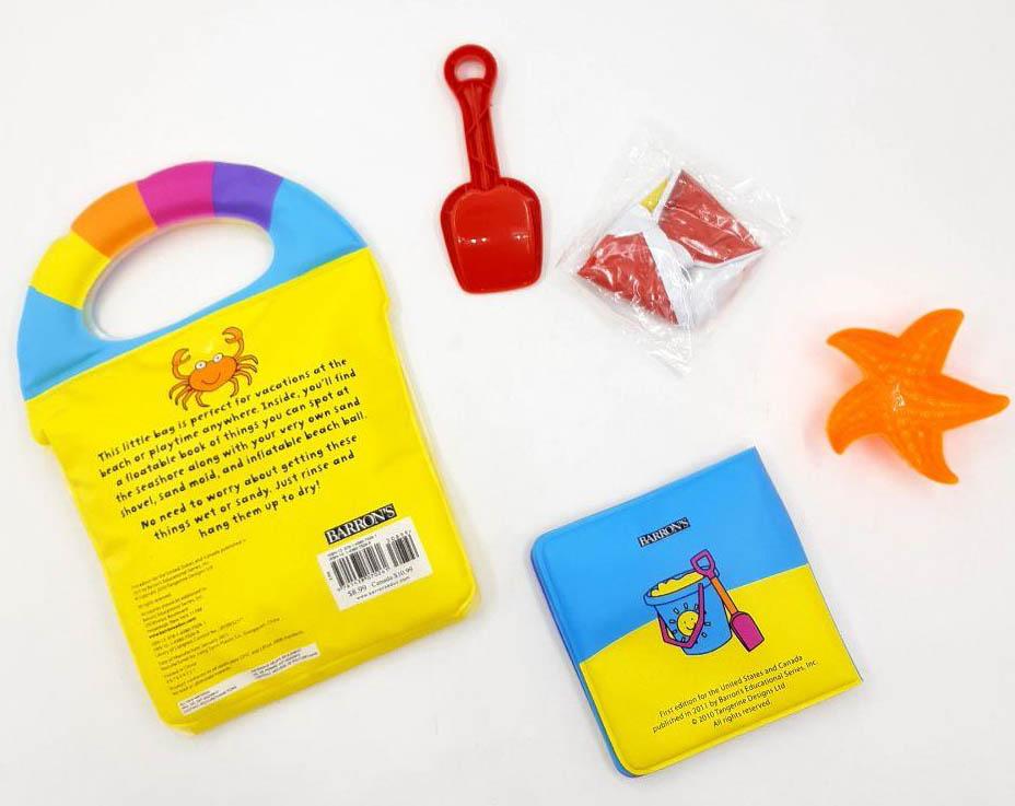 This bright yellow vinyl bag with its rainbow-colored carrying handle unsnaps to reveal a pair of net pockets. Each is filled with items for fun at the beach or backyard sandbox and wading pool. They include a multicolored inflatable plastic beach ball, a sand shovel, a plastic sand mold in the shape of a starfish, and a 5" x 5" waterproof 8-page picture book with attractive, simply labeled beachtime illustrations. Here's a delightful assortment of summertime fun items to brighten a toddler's summer.