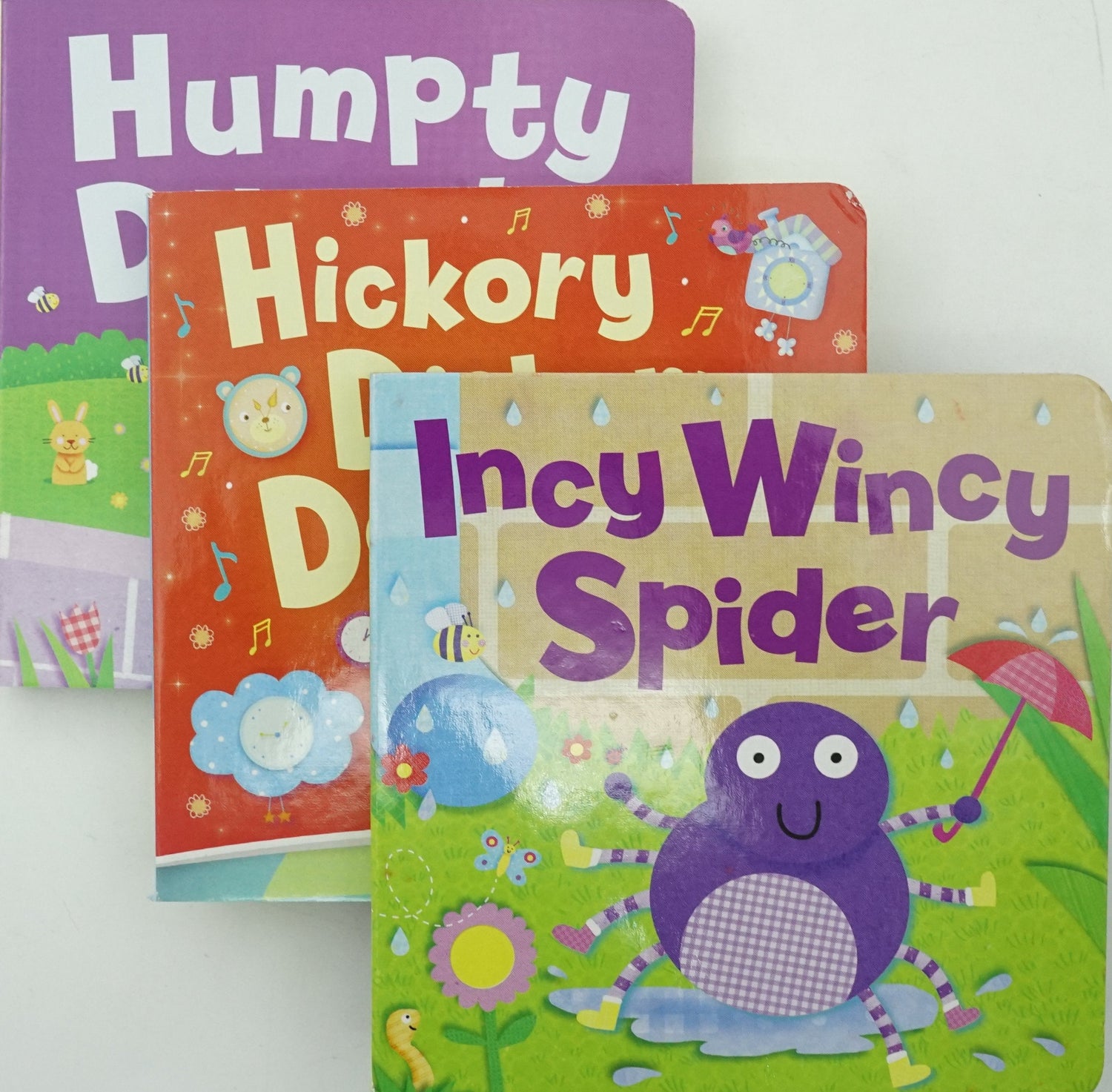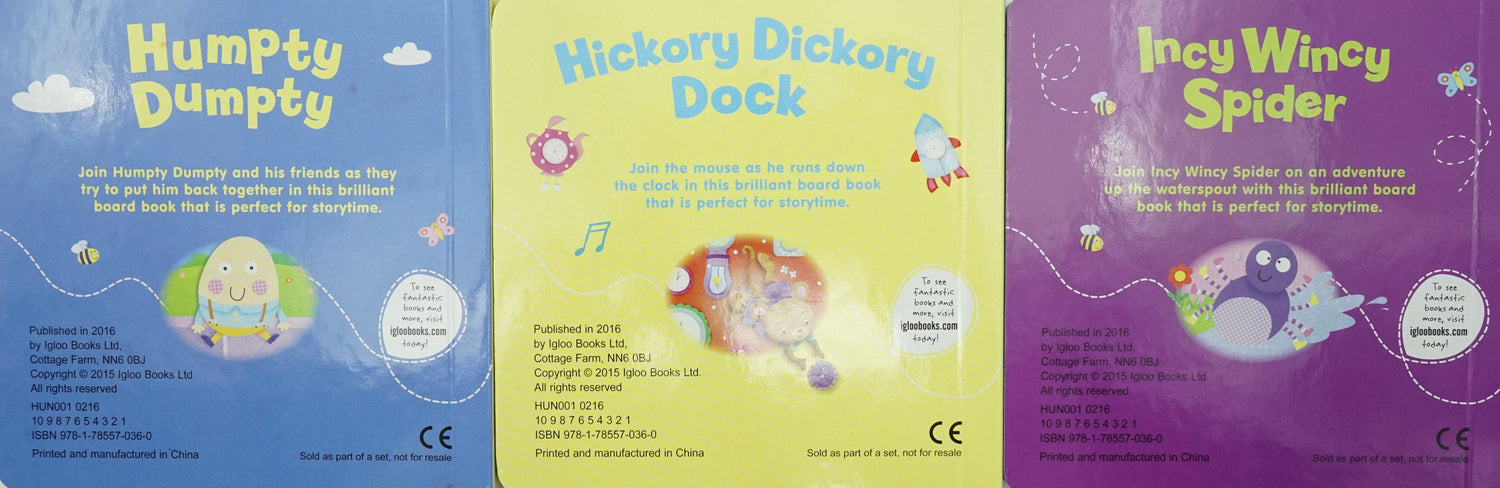 This Little Bag of Nursery Rhymes contain 3 Books which are Incy Wincy Spider, Hickory Dickory Dock adn Humpty Dumpty.