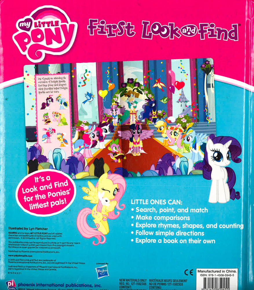 Discover the magic of friendship with Twilight Sparkle, Pinkie Pie, and all their pony friends! Look and Find all over Equestria for hidden objects…and ponies! Search 7 magical scenes for hidden characters and objects. Toddlers can search, point, match, and compare all on their own – no reading required! Then, turn to the last pages of the book for even more Look and Find activities that caregivers and children can enjoy together. Look and Find play encourages focus and exploration, and helps build early learning skills.