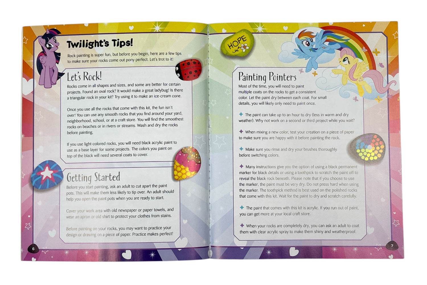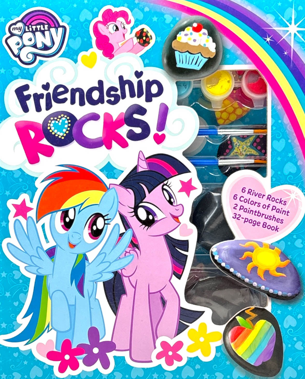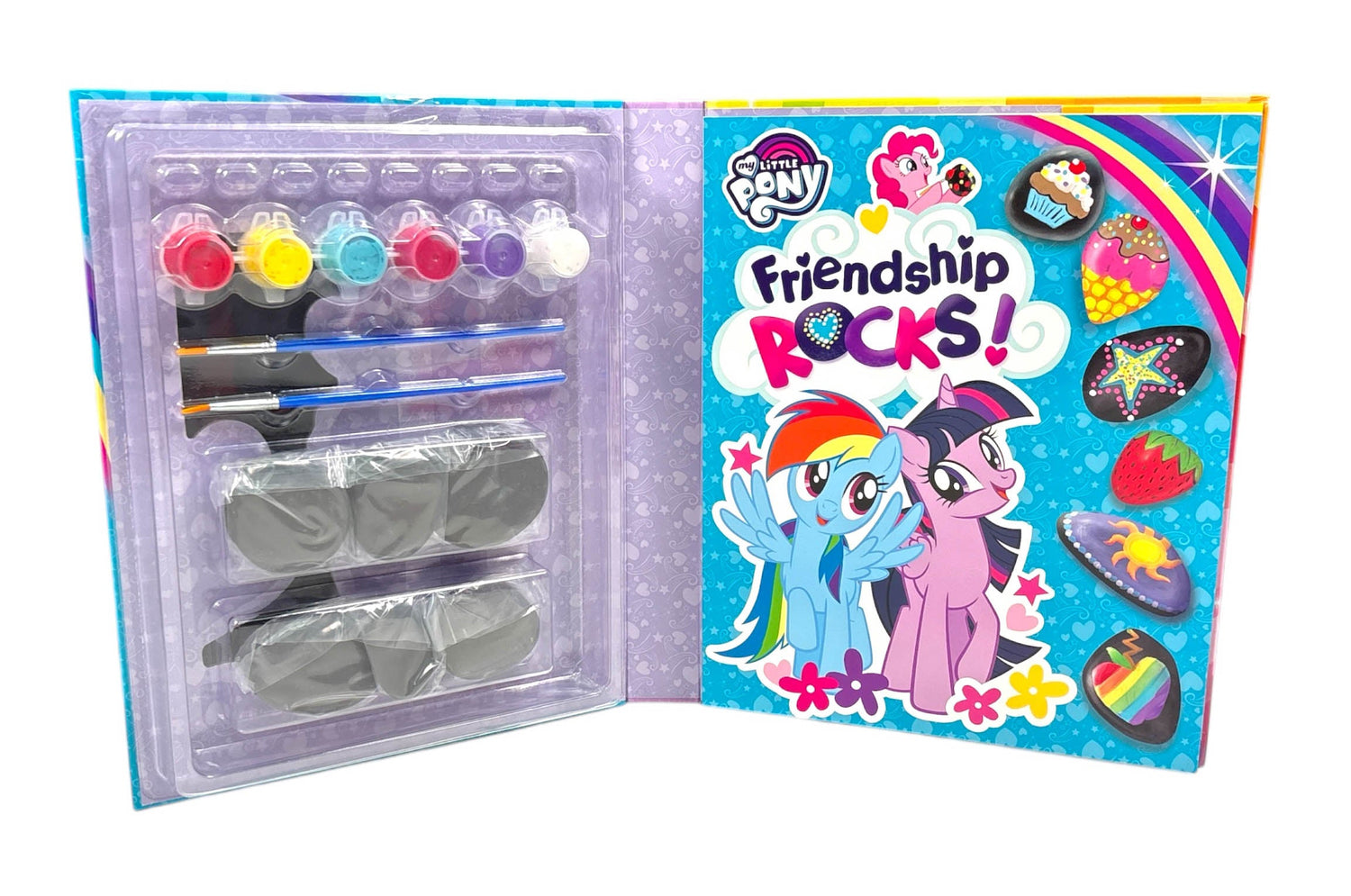 Get ready to rock (and craft!) with all your favorite ponies! This creative crafting kit comes with 6 rocks, 6 paint pots, 2 paintbrushes, and a 32-page full-color instructional guide on how to paint cutie marks, pony themes, and more on the included rocks. Altogether, it's a crafting kit that everypony will adore!