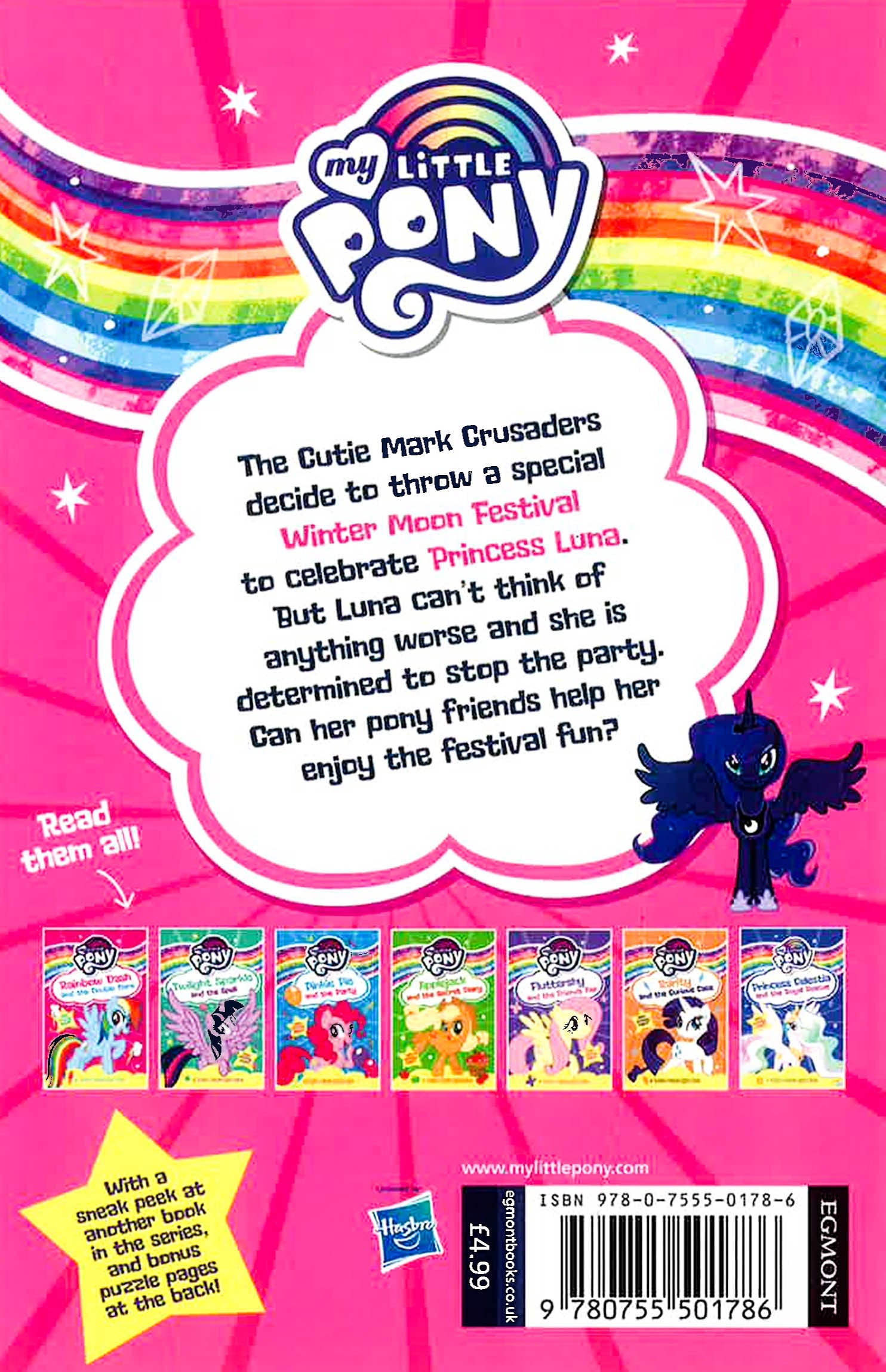 All the ponies in Equestria love the Summer Sun Celebration – all except Princess Luna. So when the Cutie Mark Crusaders suggest that they have a special Winter Moon Festival just for her, Luna can't think of anything worse! Princess Luna is determined to stop the party. Can her pony friends help her enjoy the festival fun?