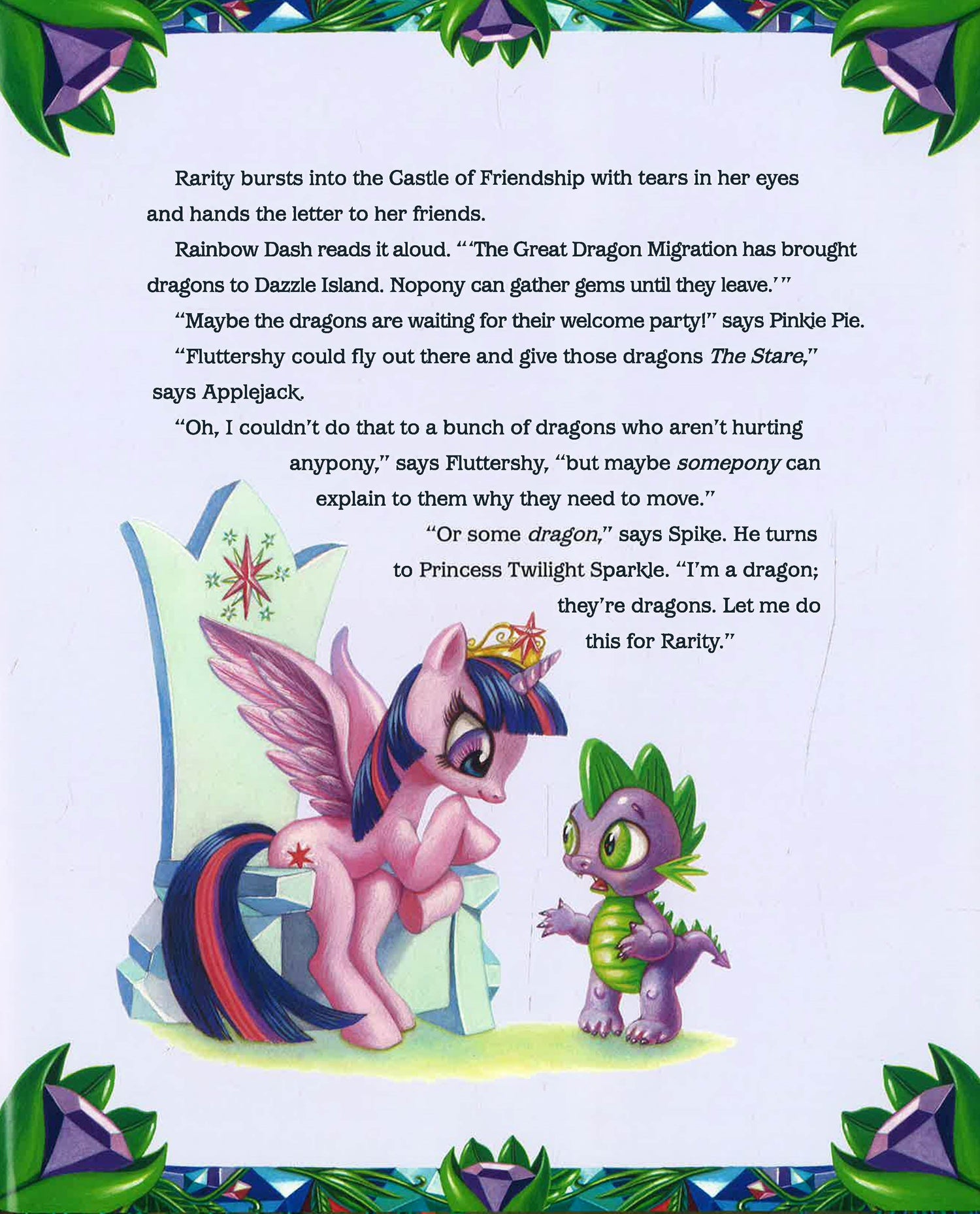 Rarity's entire order of rare island gemstones has been canceled because the Great Dragon Migration has brought dragons to Dazzle Island! But all hope is not lost as Fluttershy and Spike travel to the island and explain to the dragons why they need to move.