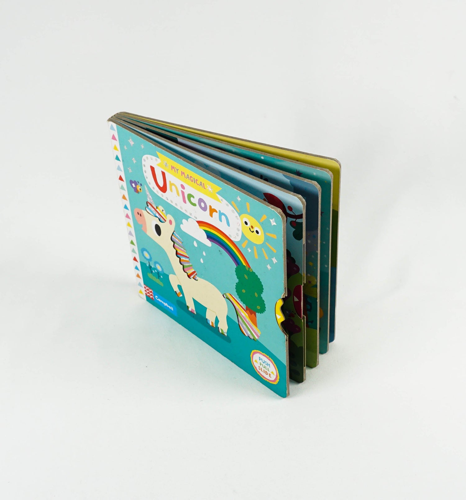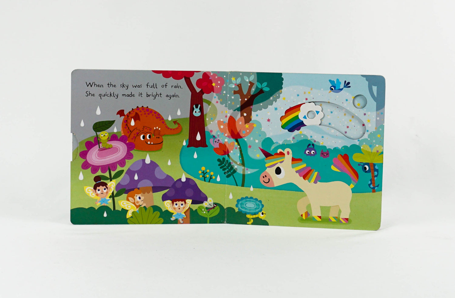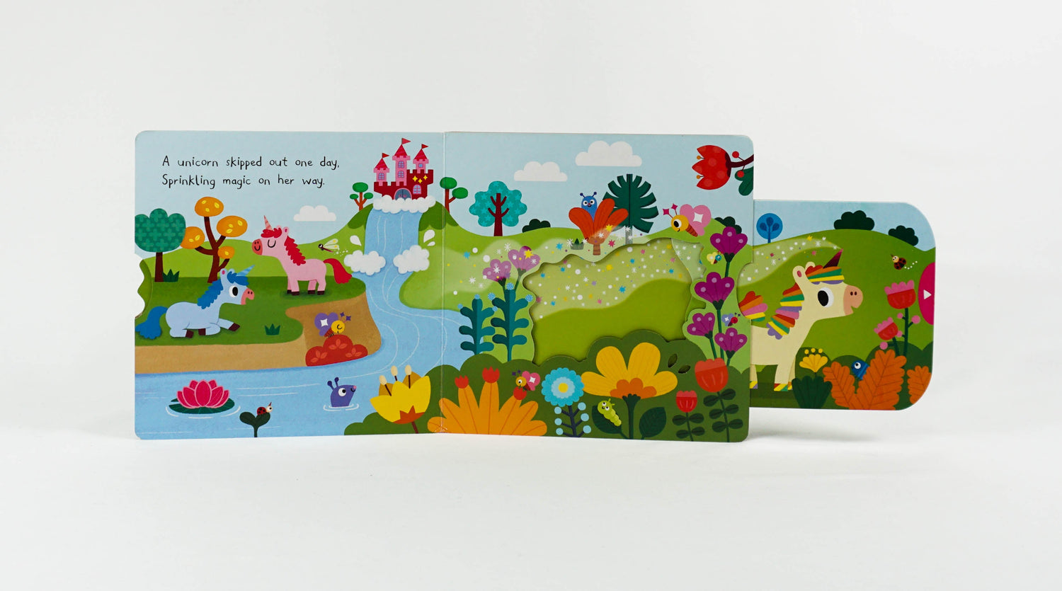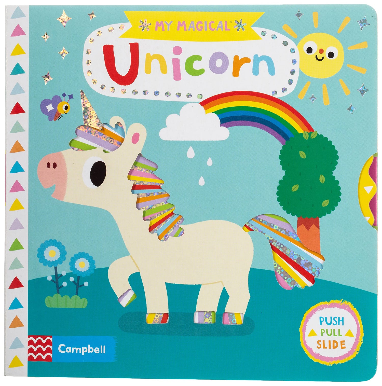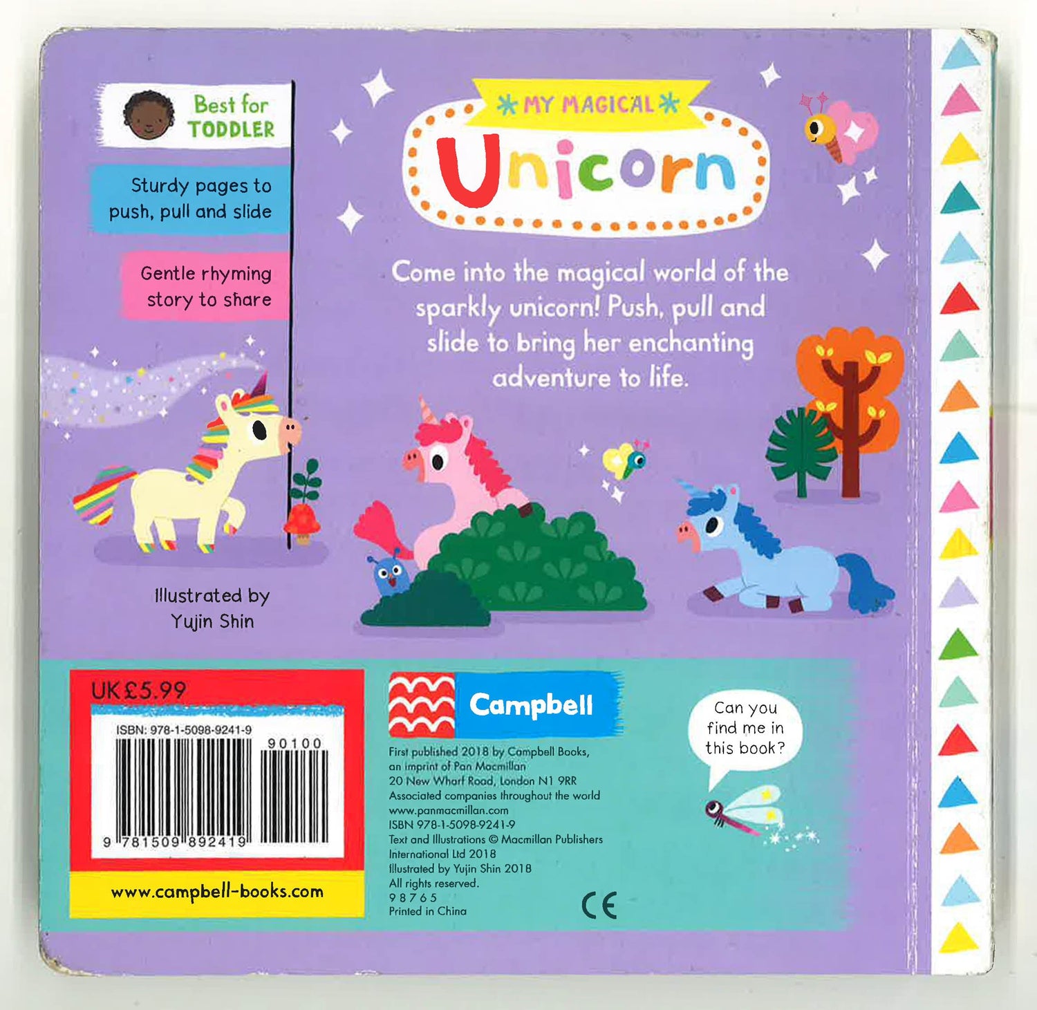 Enter a magical world and go on an exciting adventure with a beautiful unicorn! With push, pull and turn mechanisms and a sparkly foil cover wheel, My Magical Unicorn has plenty to keep little ones engaged and entertained. Yujin Shin's beautifully coloured illustrations are paired with gentle rhyming text and lots of things to spot in four bright and busy magical scenes.