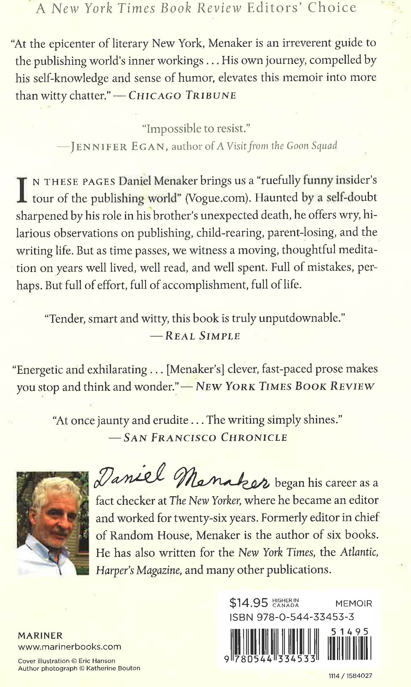 A New York Times Book Review Editors' Choice "At the epicenter of literary New York, Menaker is an irreverent guide to the publishing world's inner workings . . . His own journey, compelled by his self-knowledge and sense of humor, elevates this memoir into more than witty chatter." -- Chicago Tribune "Impossible to resist." -- Jennifer Egan, author of A Visit from the Goon Squad In these pages Daniel Menaker brings us a "ruefully funny insider's tour of the publishing world" (Vogue.com). Haunted by a self-doubt sharpened by his role in his brother's unexpected death, he offers wry, hilarious observations on publishing, child-rearing, parent-losing, and the writing life. But as time passes, we witness a moving, thoughtful meditation on years well lived, well read, and well spent. Full of mistakes, perhaps. But full of effort, full of accomplishment, full of life. "Tender, smart and witty, this book is truly unputdownable." -- Real Simple "Energetic and exhilarating . . . [Menaker's] clever, fast-paced prose makes you stop and think and wonder." -- New York Times Book Review "At once jaunty and erudite . . . The writing simply shines." -- San Francisco Chronicle