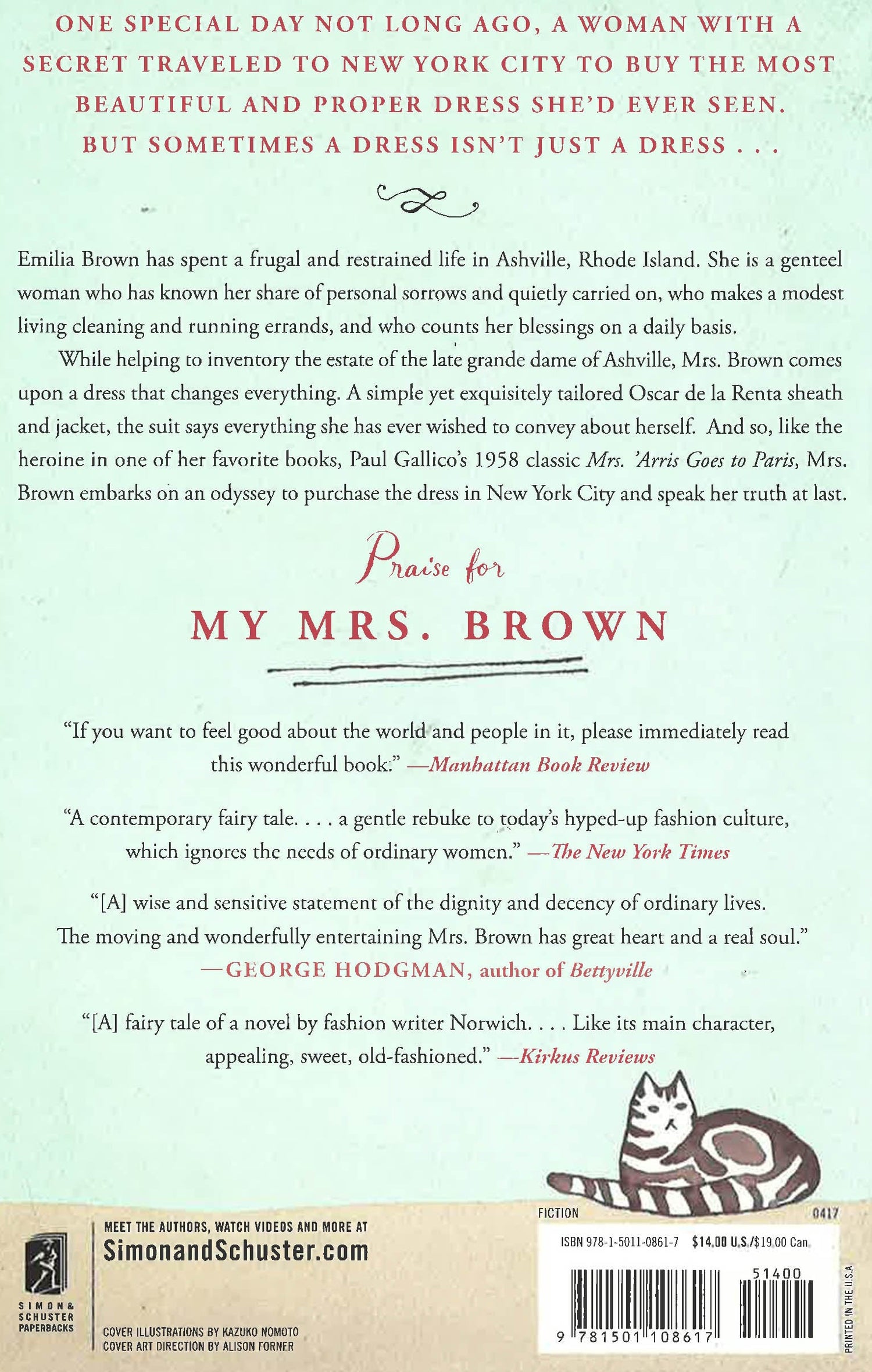 Emilia Brown has spent a frugal and restrained life in Ashville, Rhode Island. She is a genteel woman who has known her share of personal sorrows and quietly carried on, who makes a modest living cleaning and running errands, and who counts her blessings on a daily basis.While helping to inventory the estate of the late grande dame of Ashville, Mrs. Brown comes upon a dress that changes everything. A simple yet exquisitely tailored Oscar de la Renta sheath and jacket, the suit says everything she has ever wished to convey about herself. And so, like the heroine in one of her favorite books, Paul Gallico's 1958 classic Mrs. 'Arris Goes to Paris, Mrs. Brown embarks on an odyssey to purchase the dress in New York City and speak her truth at last.