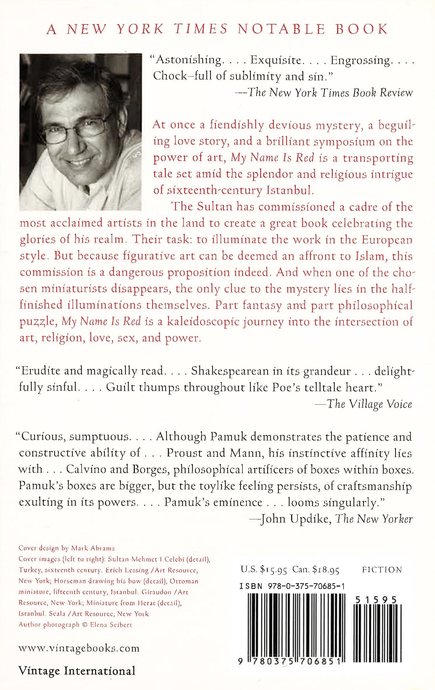 At once a fiendishly devious mystery, a beguiling love story, and a brilliant symposium on the power of art, My Name Is Red is a transporting tale set amid the splendor and religious intrigue of sixteenth-century Istanbul, from one of the most prominent contemporary Turkish writers. The Sultan has commissioned a cadre of the most acclaimed artists in the land to create a great book celebrating the glories of his realm. Their task: to illuminate the work in the European style. But because figurative art can be deemed an affront to Islam, this commission is a dangerous proposition indeed. The ruling elite therefore mustn't know the full scope or nature of the project, and panic erupts when one of the chosen miniaturists disappears. The only clue to the mystery-or crime? -lies in the half-finished illuminations themselves. Part fantasy and part philosophical puzzle, My Name is Red is a kaleidoscopic journey to the intersection of art, religion, love, sex and power. Translated from the Turkish by Erda M Goknar.