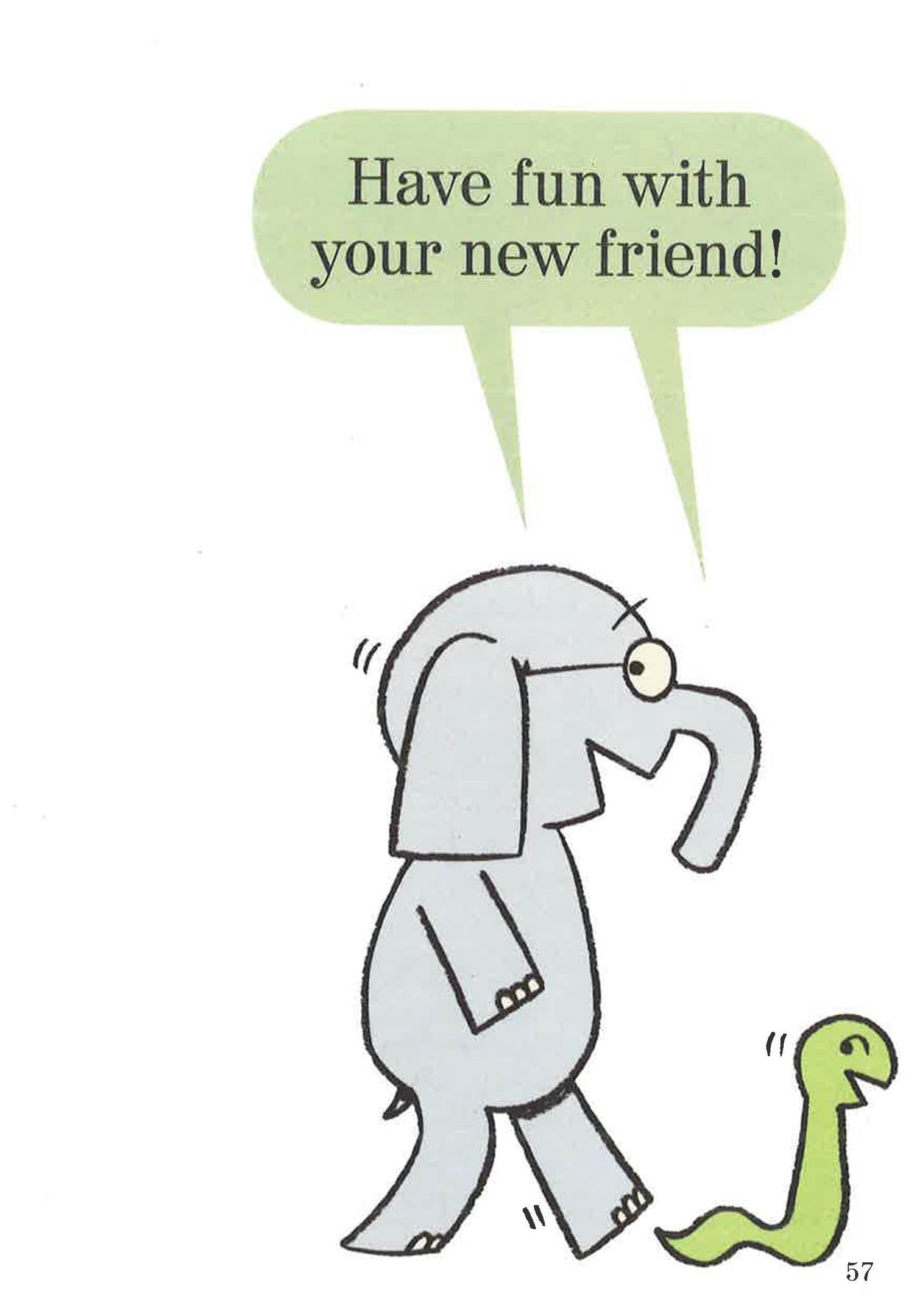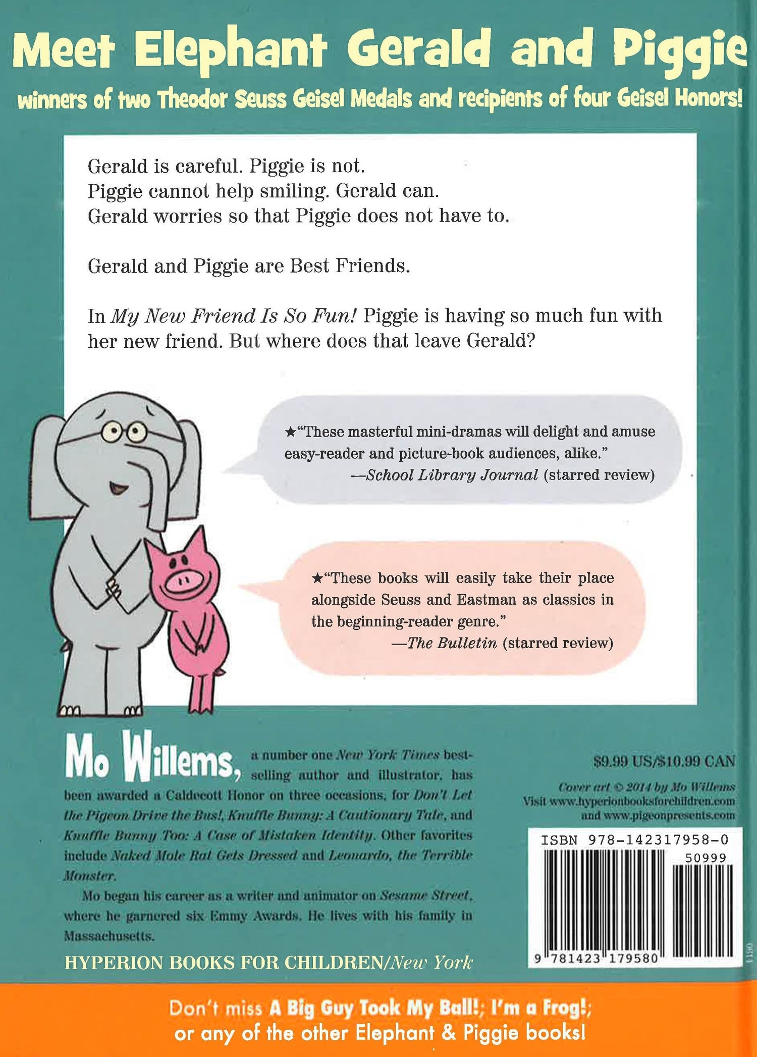 Gerald worries so that Piggie does not have to. Gerald and Piggie are best friends. In My New Friend Is So Fun!, Piggie has found a new friend! But is Gerald ready to share?