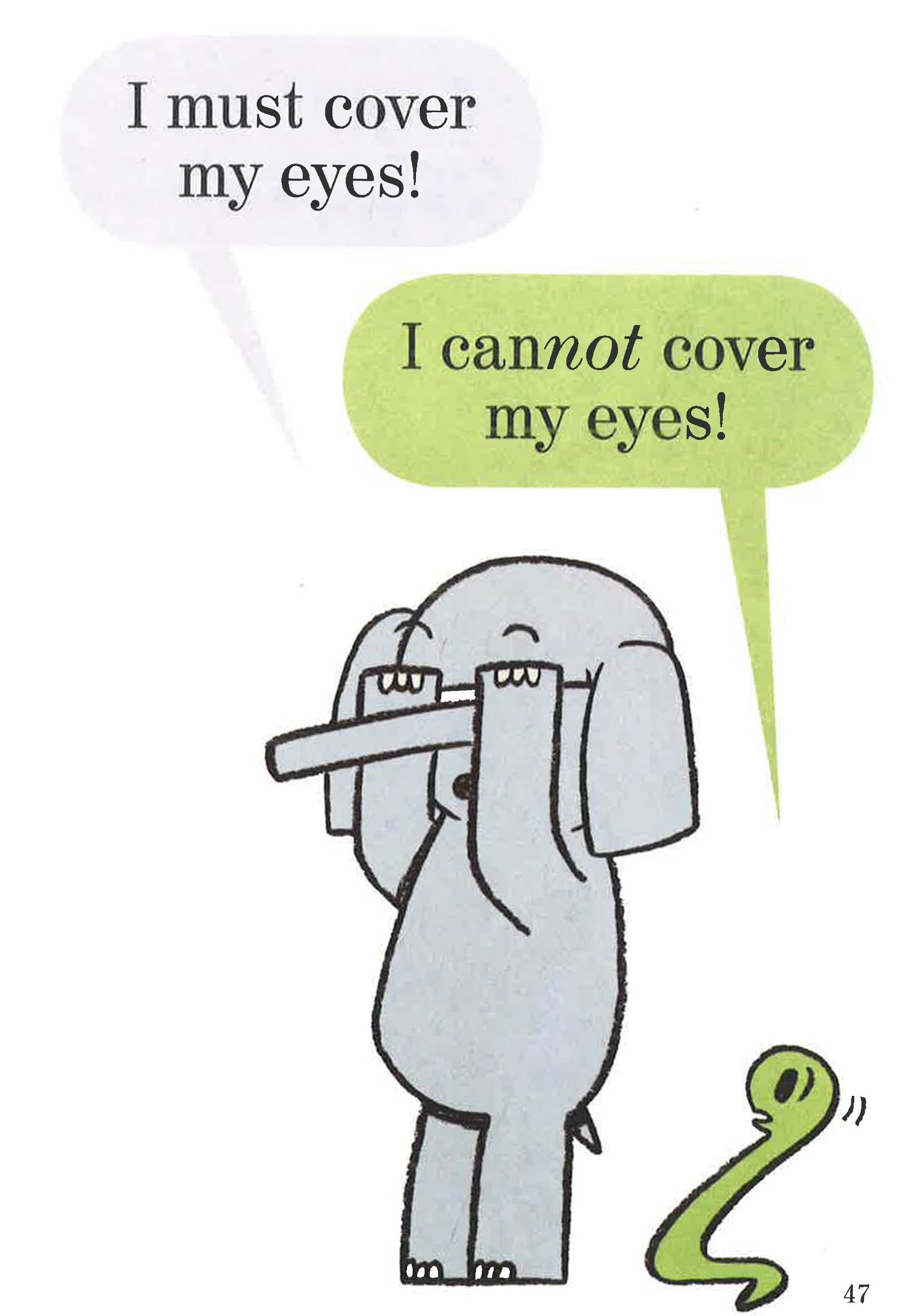 Piggie cannot help smiling. Gerald can.