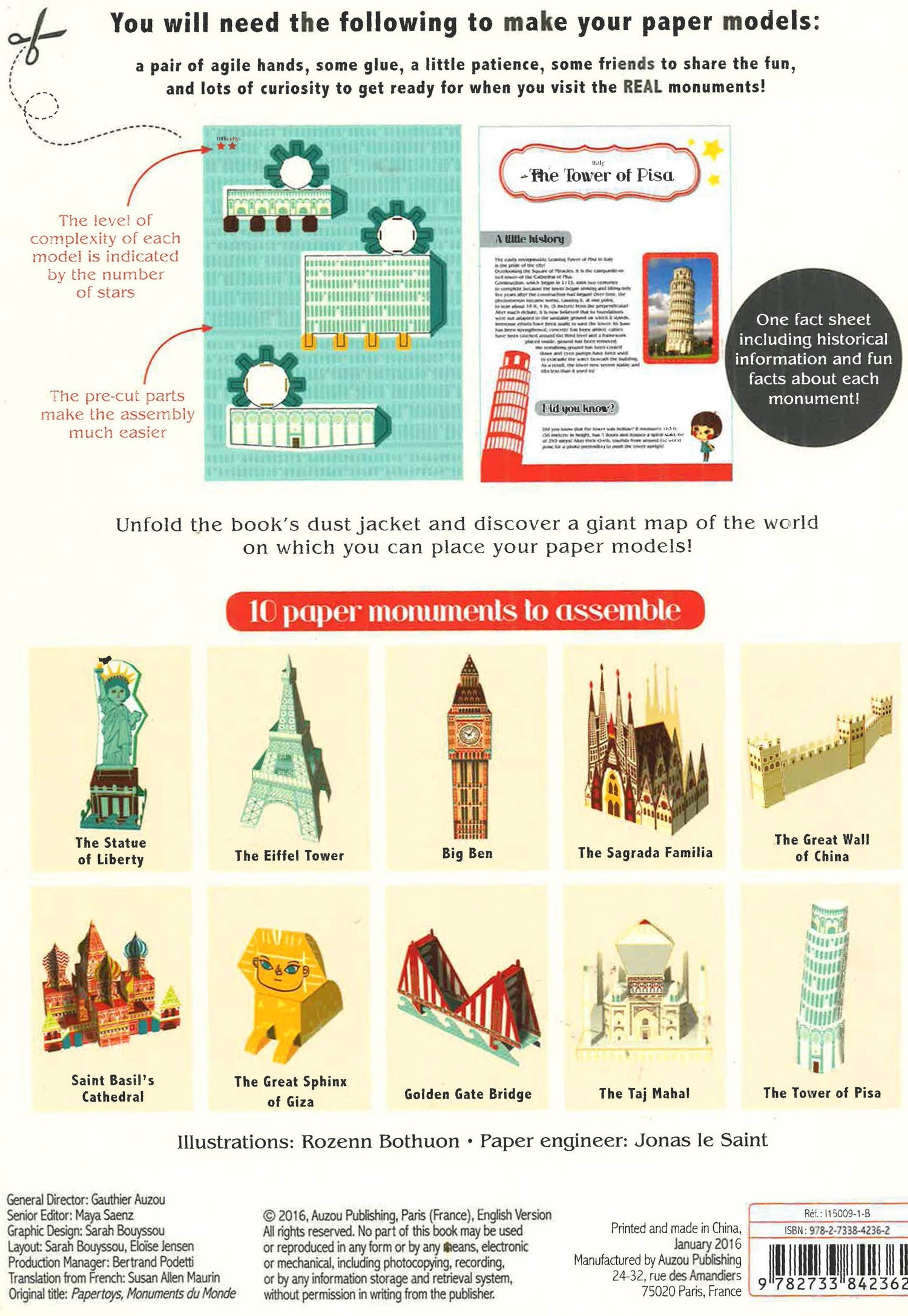 Thanks to pre-cut press-out pieces, children will discover 10 of the world?s most famous monuments. The jacket unfolds to reveal a fold-out map on which they can learn and place the monuments built. An informational sheet ensures the models are easily put together. There are 3 different levels from beginner to master, ensuring children can learn and master their papertoy building skills!