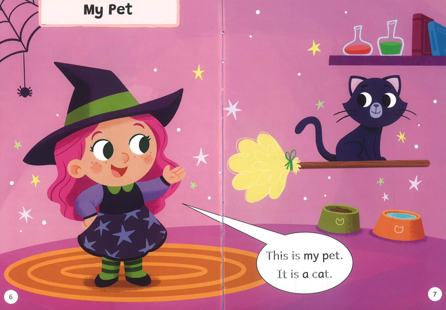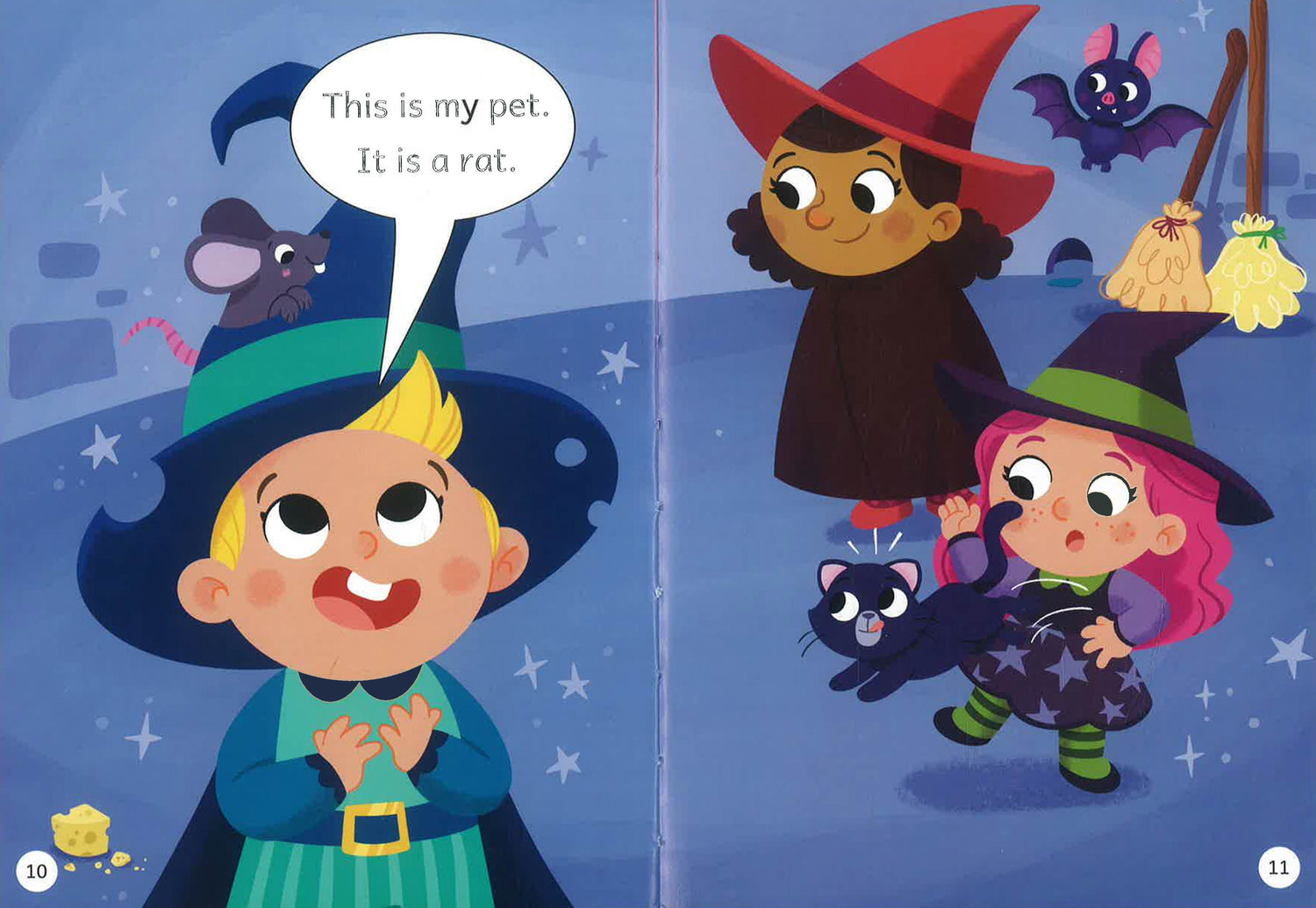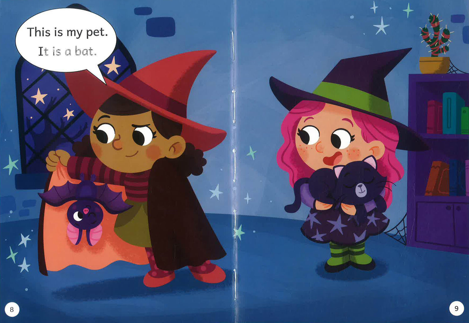 The witches show off their pets. What pet does Dot have? Dot is waiting while her pets get ready for bed.