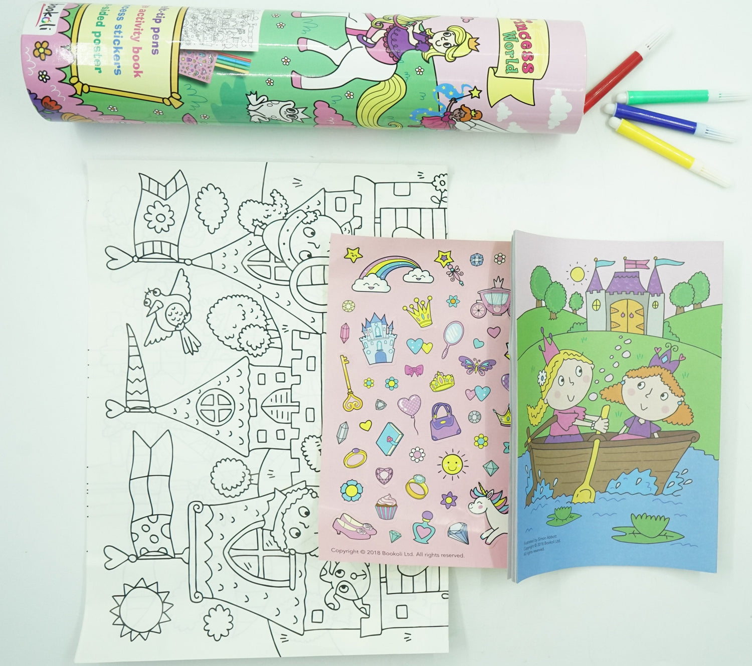 4 felt-tip pens 32 page activity book 50 princess stickers Double-sided poster